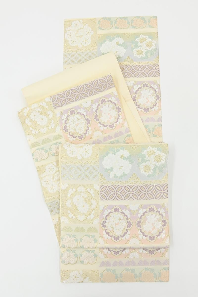 穏やかなオフホワイトの地に、変わり段に華文や花の丸などを織り出した袋帯です。淡いパステルカラーと金糸の明るい煌めきが美しく調和するお品、ふっくらとした甘撚りの絹糸の光沢も品良い華やぎを一層と引き立てていますね。色無地から付下げ、訪問着などに合わせて改まったお席やお祝いのお席などに優美な装いをお楽しみくださいませ。
