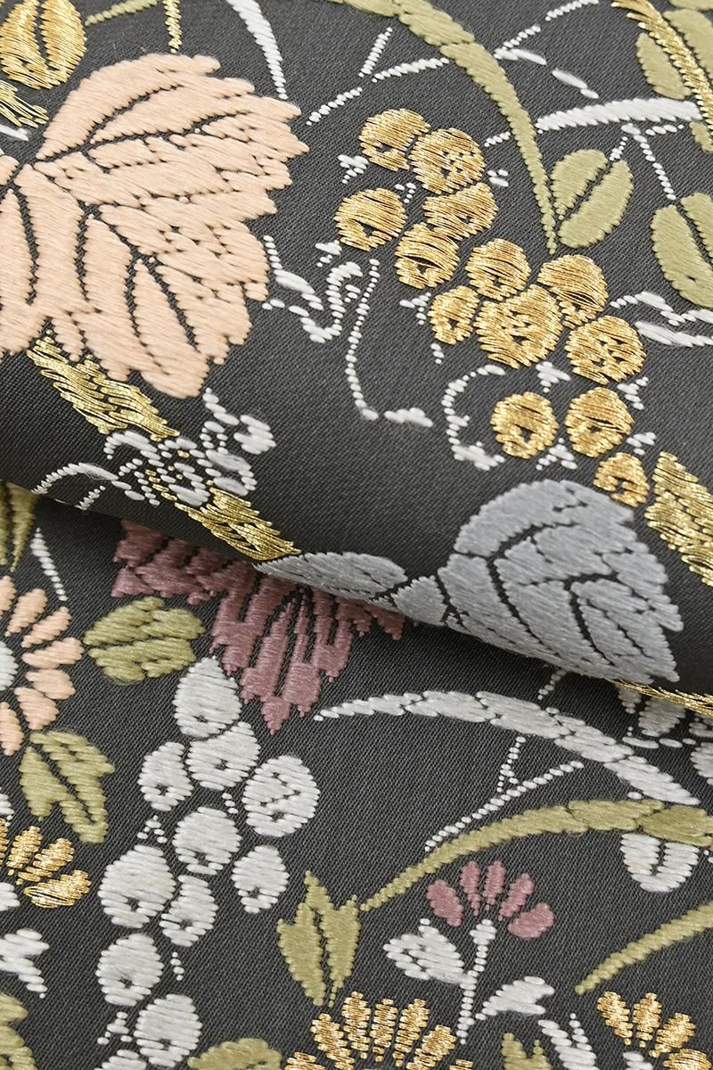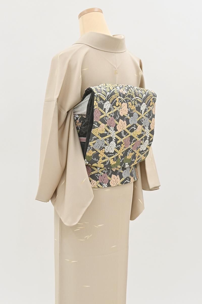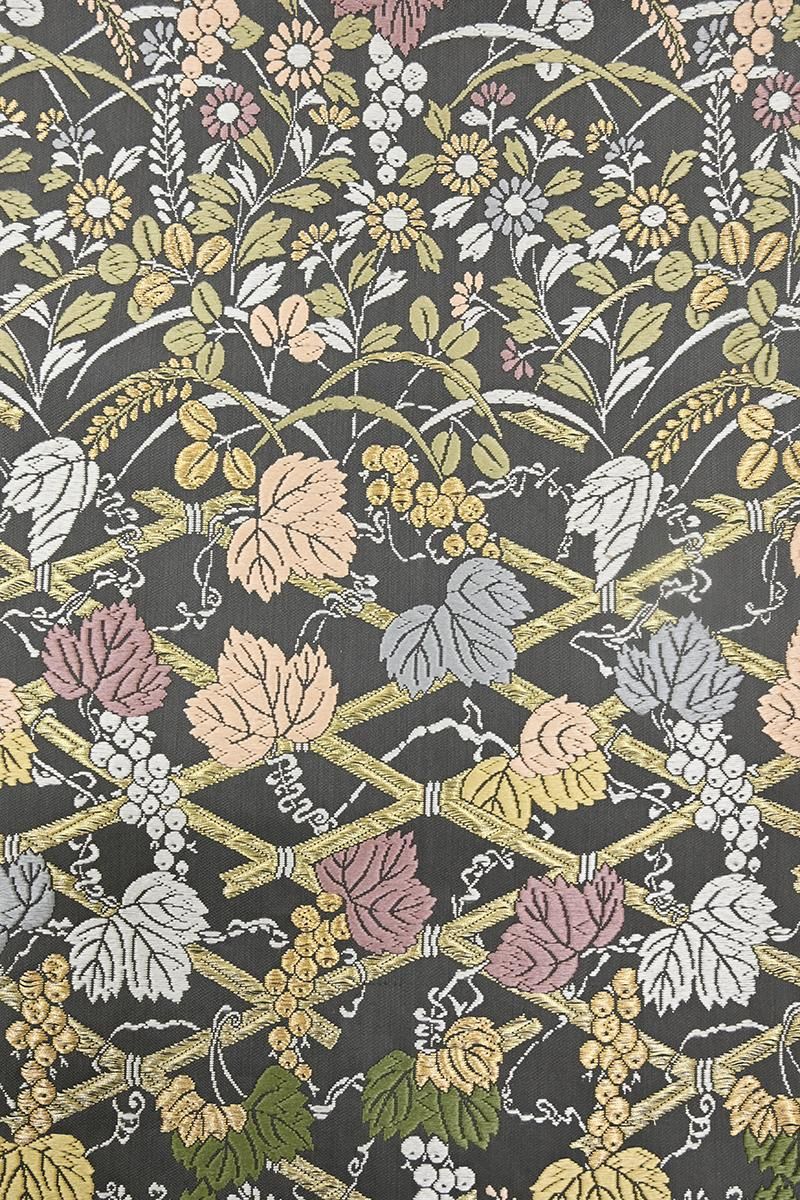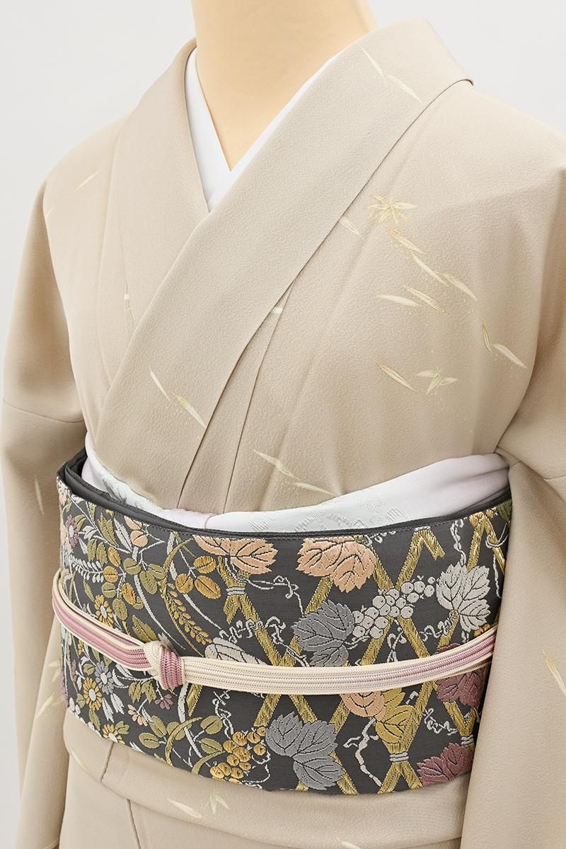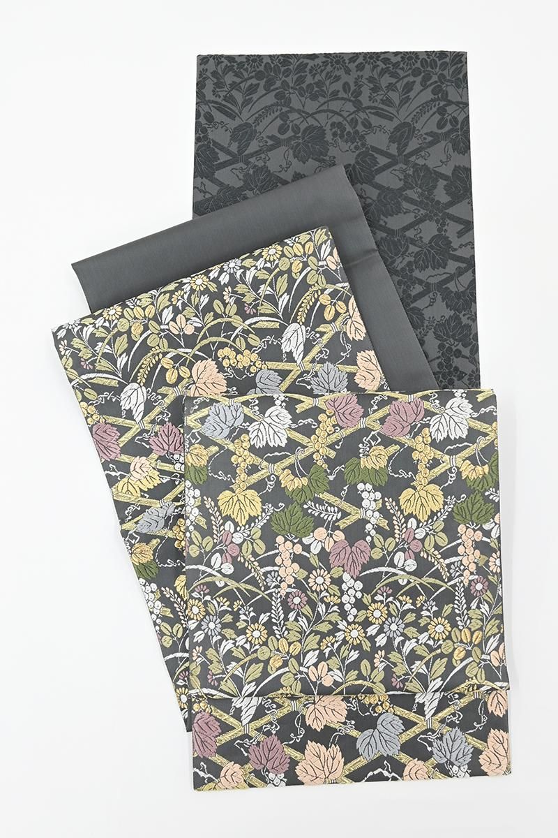 深いグレーの地に、竹垣に葡萄や菊、萩などをいっぱいに織り出した袋帯です。こちらは西陣・山口克爾監修のお品、明るい金糸のきらめきと女性らしい優美な彩りを乗せた上質な唐織ならではのふっくらとした奥行きのある景色が存在感豊かに着姿を引き立てくれることと思います。お祝いのお席やお呼ばれの機会が増えるこれからの季節、様々な場面で活躍してくれそうですね。ぜひこの機会にいかがでしょうか。