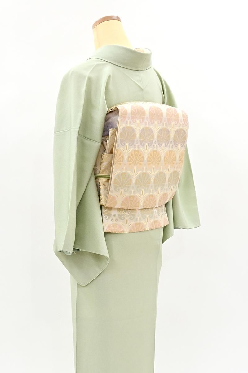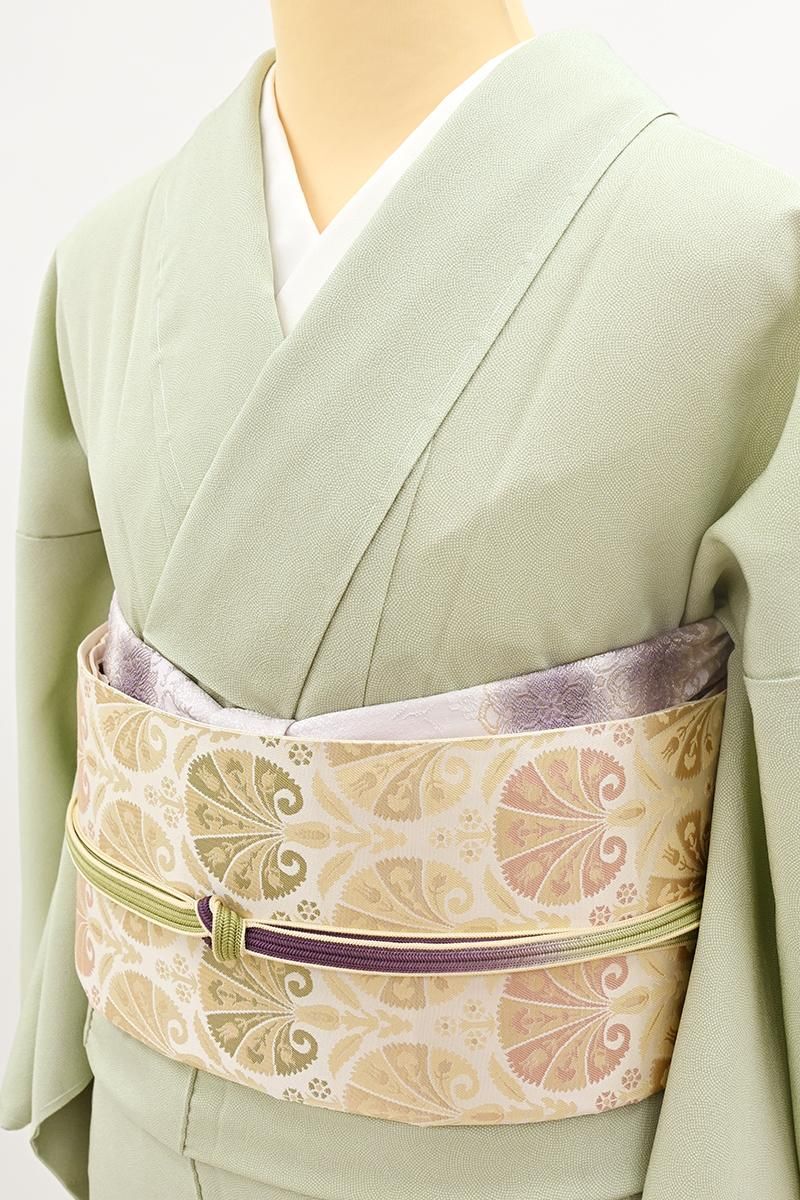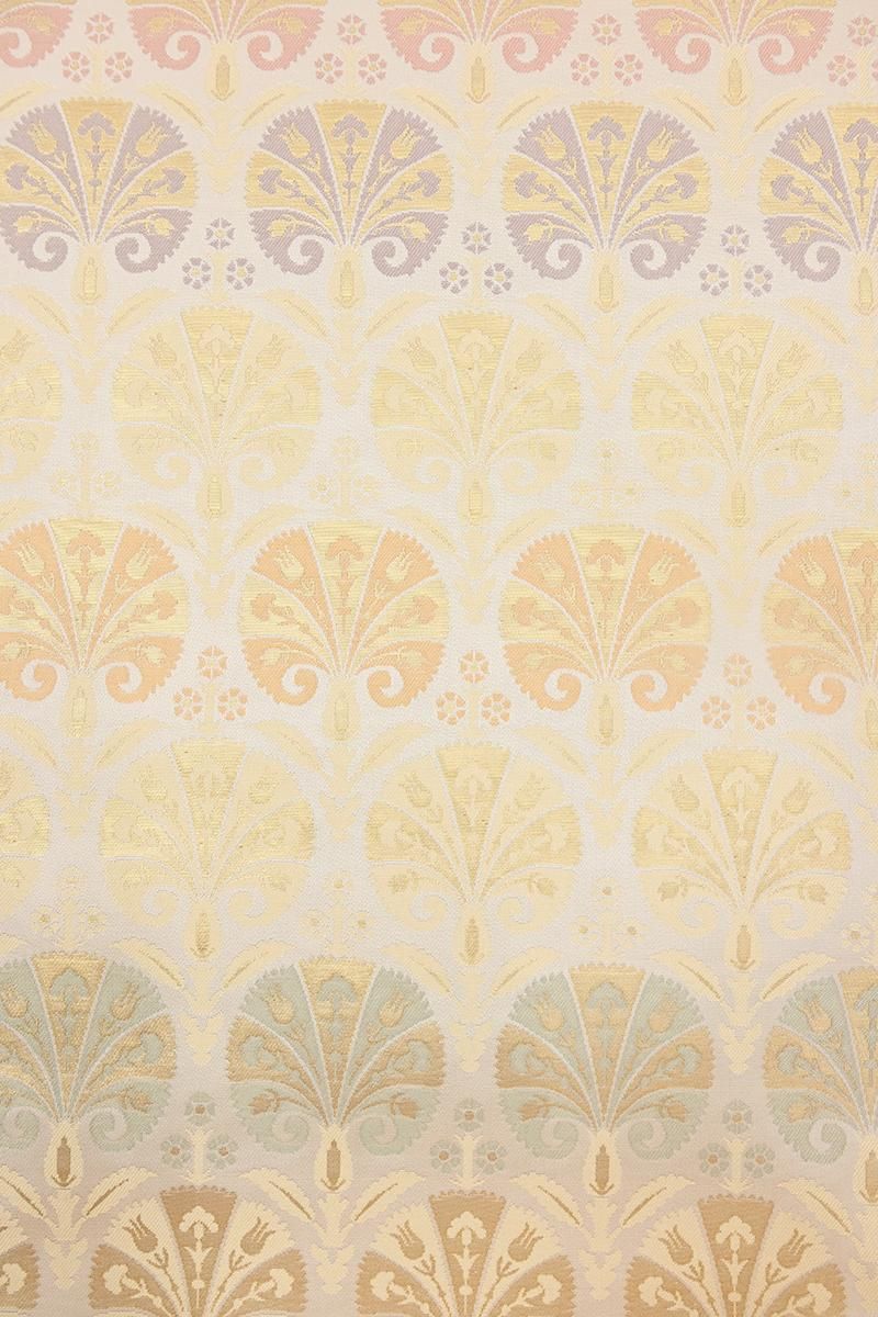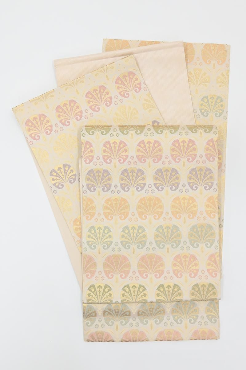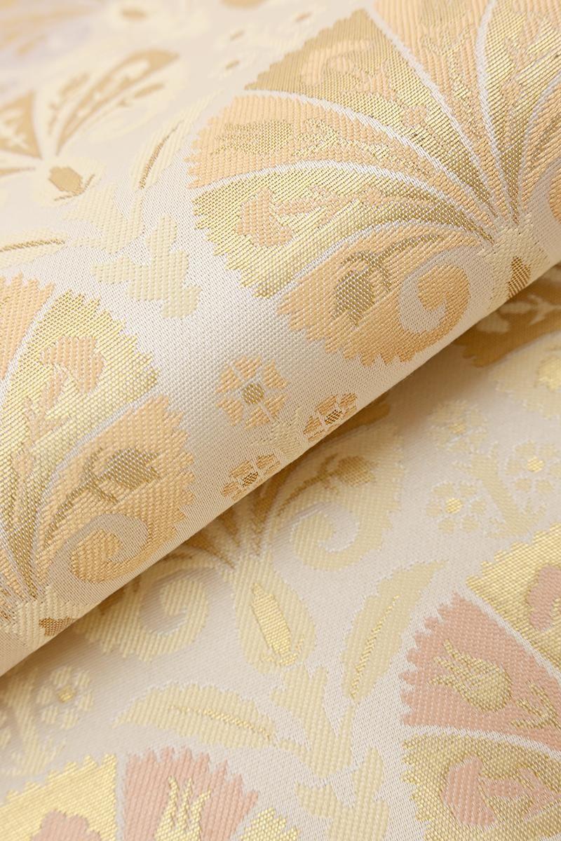 西陣・陰山織物製 箔屋清兵衛ブランドの袋帯です。こちらは象牙色が近いでしょうか、わずかに灰みを帯びた淡いベージュの地に優しい彩りで装飾的な花文を織り出したお品、どこか異国情緒漂うエレガントな意匠はホテルなどの洋の空間にも美しく映えそうですね。つややかに光沢を帯びた地風に、平金糸の明るい煌めきが気品を添える端正な一本、この機会にいかがでしょうか。