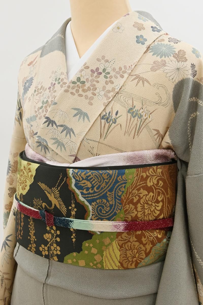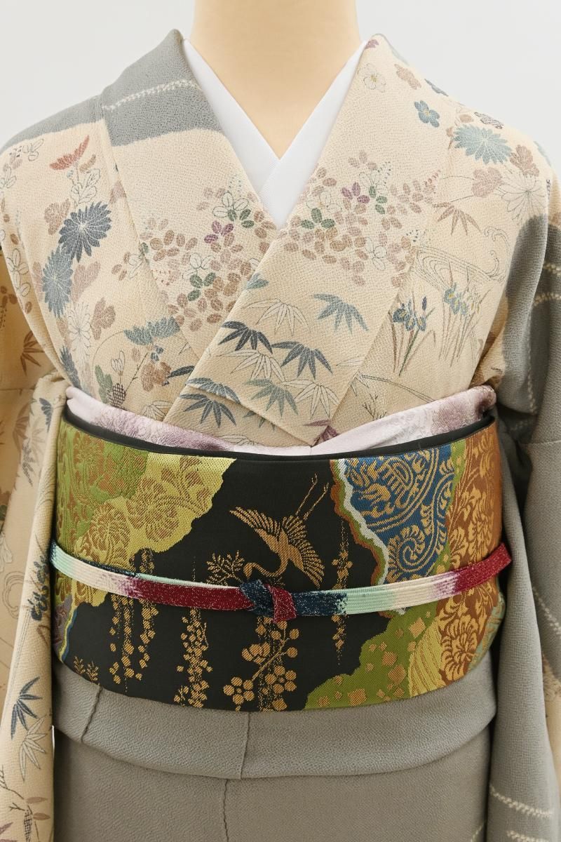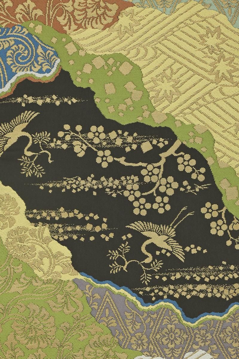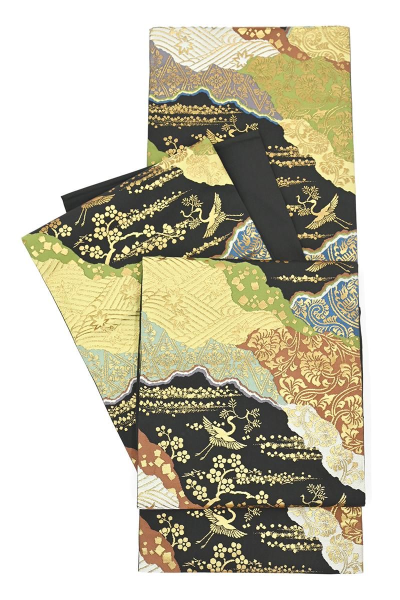 ややまろやかな黒色の地に、名物裂文をあしらった道長取りや、鶴や梅の図を配した本袋帯です。こちらは西陣の老舗機屋・川島織物さんの作、上質な素材を用いて確かな技術で織り上げられた本袋帯は、しなやかな締め心地やお太鼓のかたちの良さでも定評がありますね。黒地に平金糸の端正な輝きが美しく映え、格調高い景色をより一層引き立ててくれることと思います。紋付から付下げ、訪問着などに合わせて改まったお席やお祝いのお席にいかがでしょうか。
