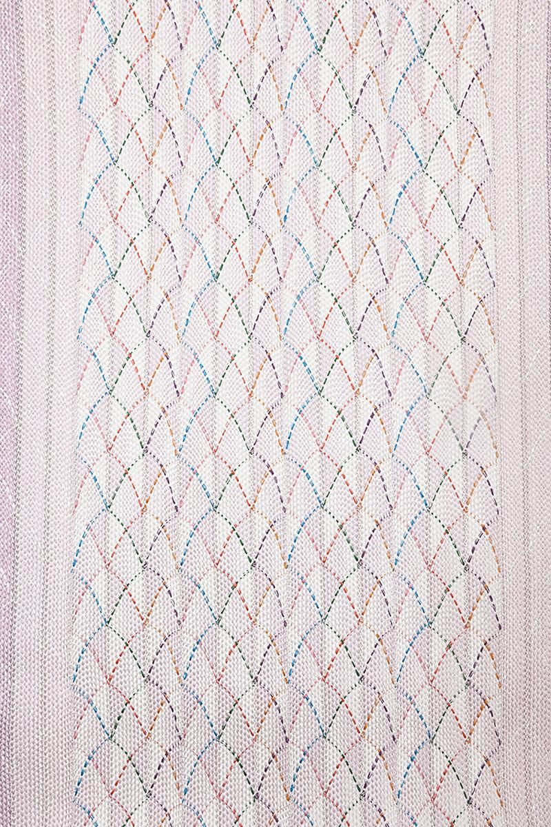 ライラック色が近いでしょうか、全体に銀糸が織り込まれたピンクみの薄紫色系の地に、幾何学的な文様をあしらった縞が表現された袋帯です。こちらは組織りのニュアンス豊かな織りの表情が装いをモダンな印象で引き立てるお品、ふんだんにあしらわれた銀糸が気品を添えますね。複雑な手順で組み上げられる帯は、高い品格を備えていますので、幅広い場面でお使い頂けることと思います。色無地や付下げなどに合わせていかがでしょうか。