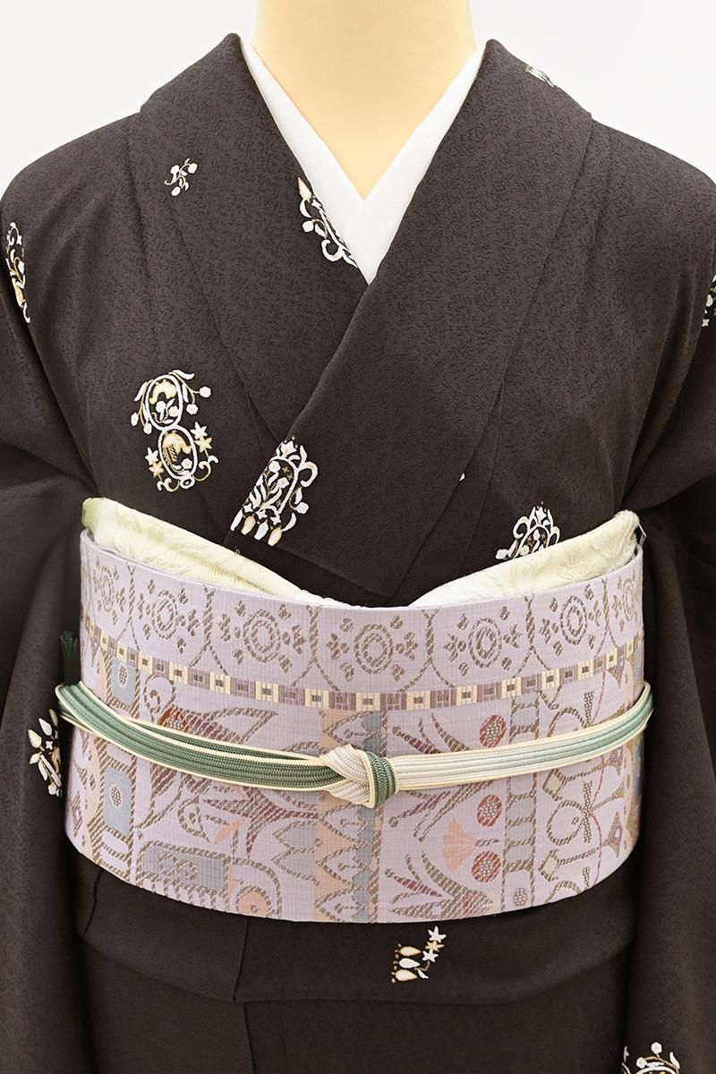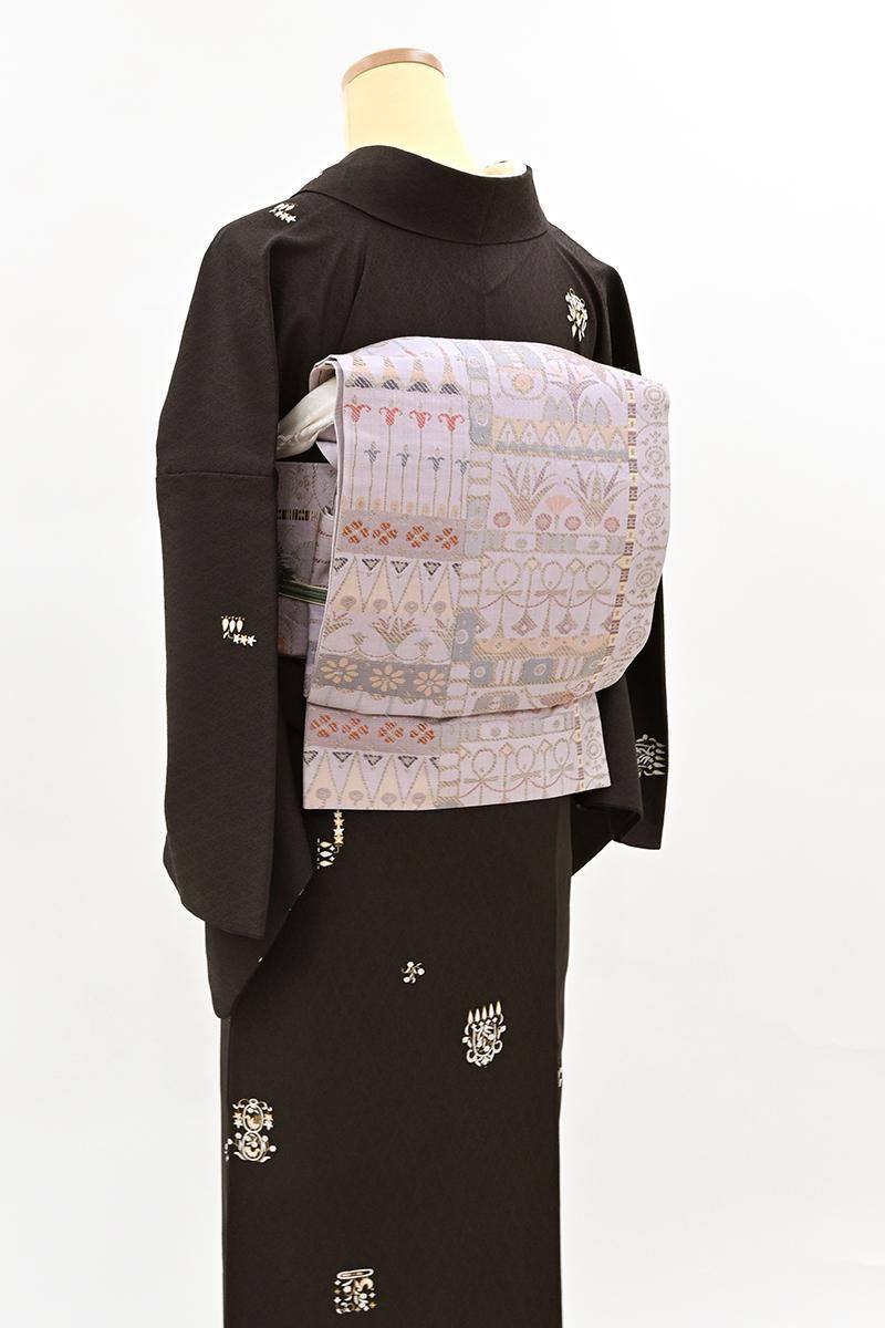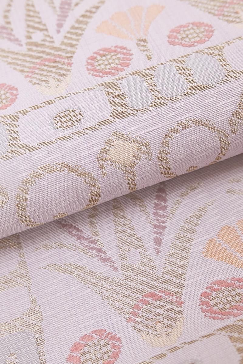 薄紅藤色が近いでしょうか、灰みを帯びた薄紫色の紬地に、横段に装飾的な文様を織りだした袋帯です。ややさっくりとした風合いに、金糸を添えて表現された意匠が素朴ながらどこかエキゾティックな趣きのお品、カジュアルな中にも個性豊かな存在感を感じますね。紬や小紋など様々なお着物に合わせて、大人の洒落味あふれる装いをお楽しみくださいませ。