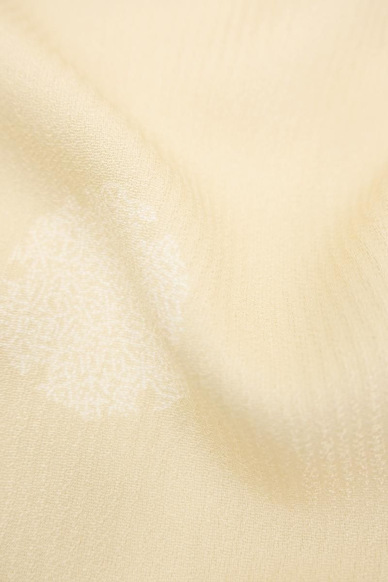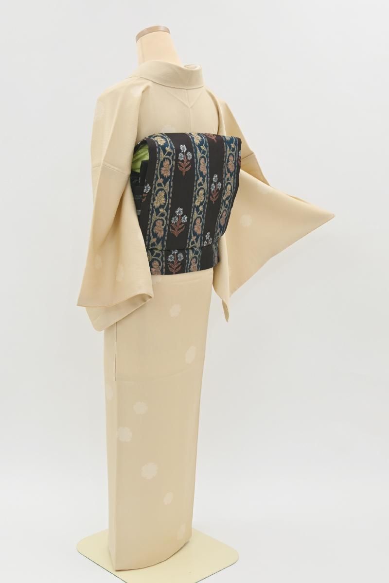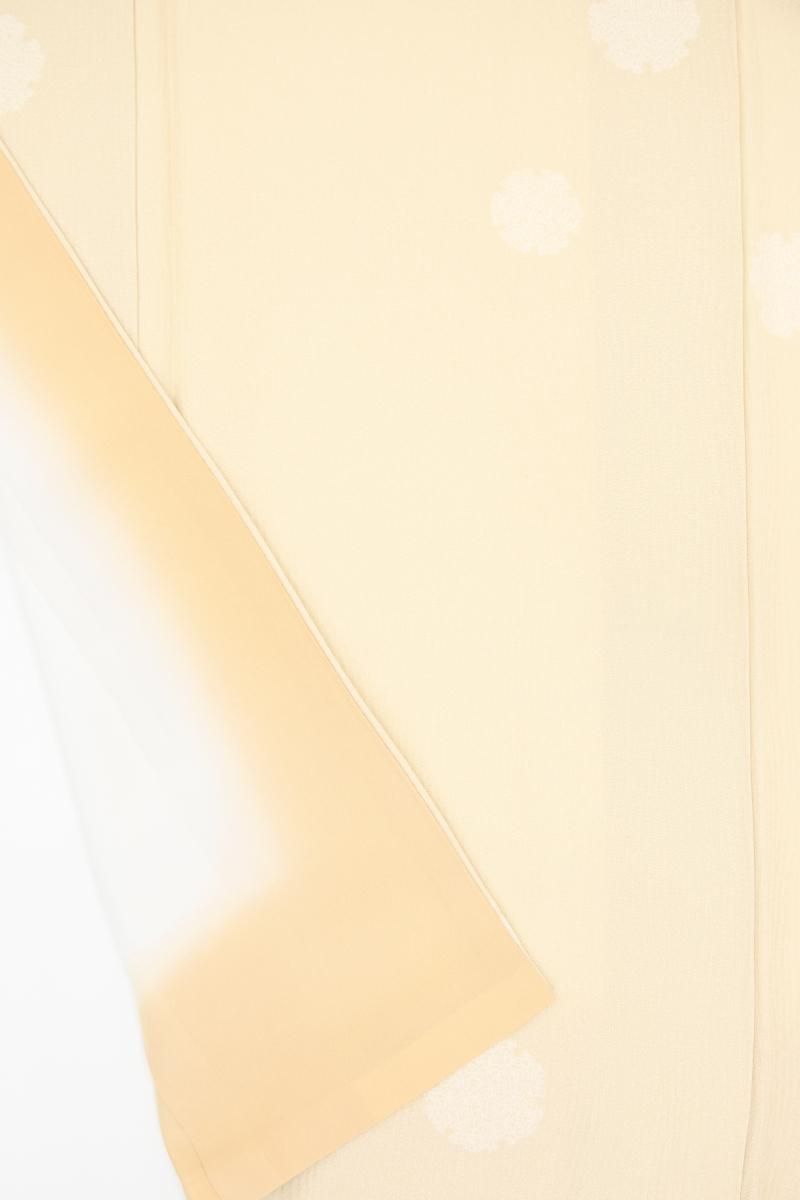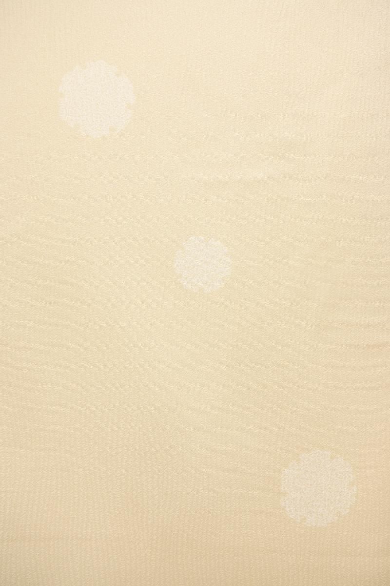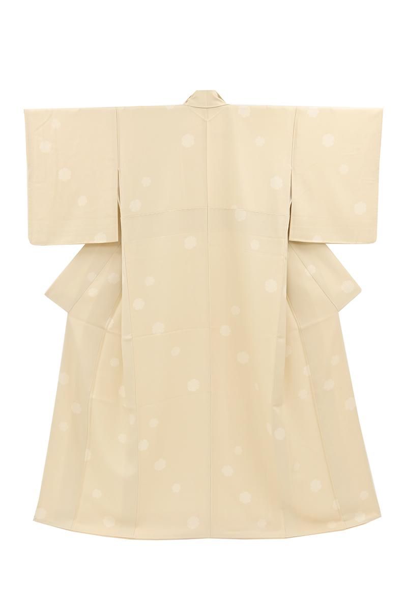 クリーム色が近いでしょうか、光の加減で流線の地紋が浮かぶ灰みのイエローベージュの地に、雪輪文を配した小紋です。こちらは伝統工芸士・久保伊智郎さん監修のお品、シンプルな色柄ですので、古典的にもモダンにも、合わせる帯次第で様々な表情をお楽しみ頂けることと思います。お食事会やお友達とのお出かけの装いにいかがでしょうか。