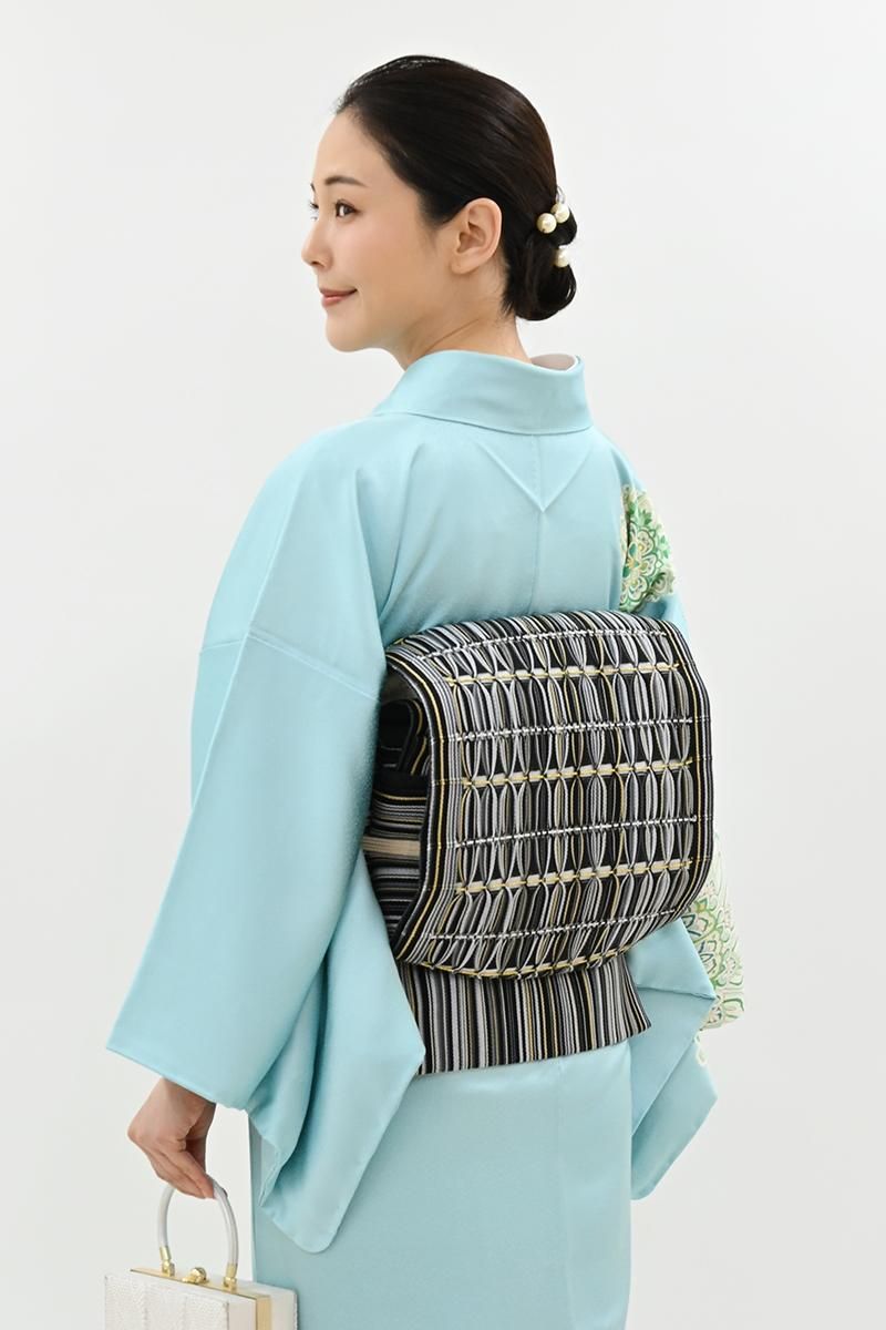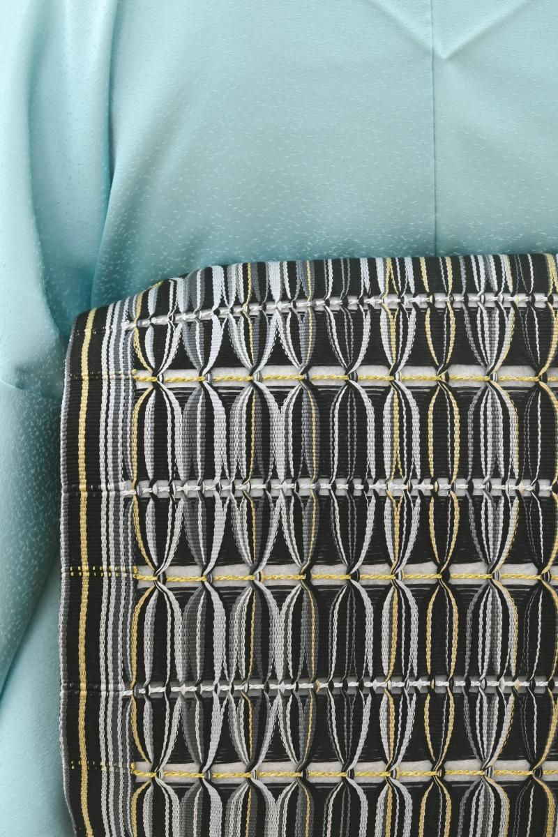 黒色の地に、グレー系の濃淡や薄黄色を効かせた幾何文を配した組織りの袋帯です。
