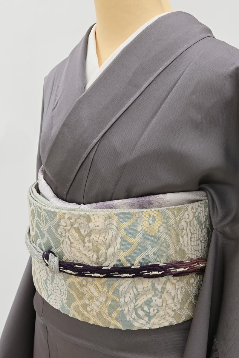 全体の印象としては淡水色が近いでしょうか、水色の地に横段を配し、向かい鳳凰の丸や宝尽くし文を織りだした袋帯です。爽やかな淡彩に緻密な織りで表現された意匠に優しい気品が漂うお品、金糸の煌めきが気品を添えますね。洗練された色柄は合わせる着物の色柄ゆきも幅広く、装いをすっきりと引き立ててくれることと思います。色無地や江戸小紋、付下げなどに合わせて、お茶席などの改まった場面にいかがでしょうか。