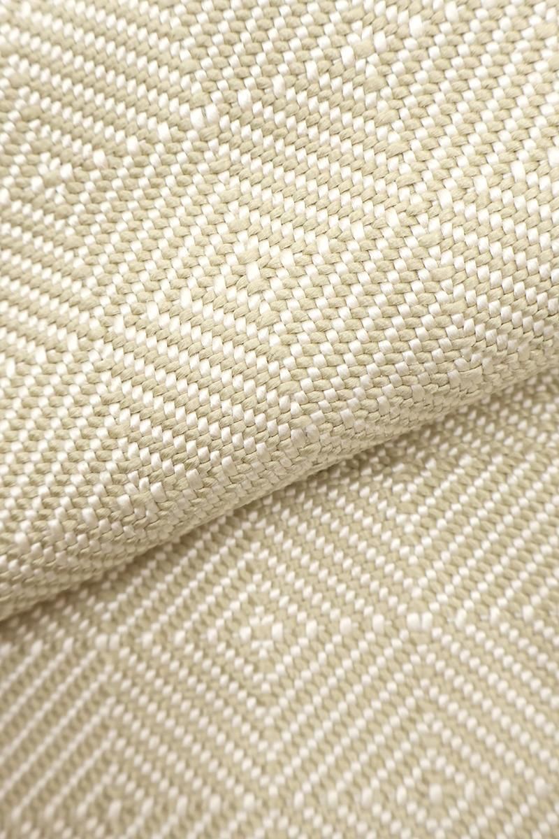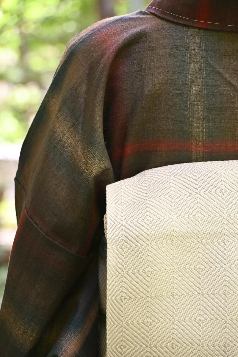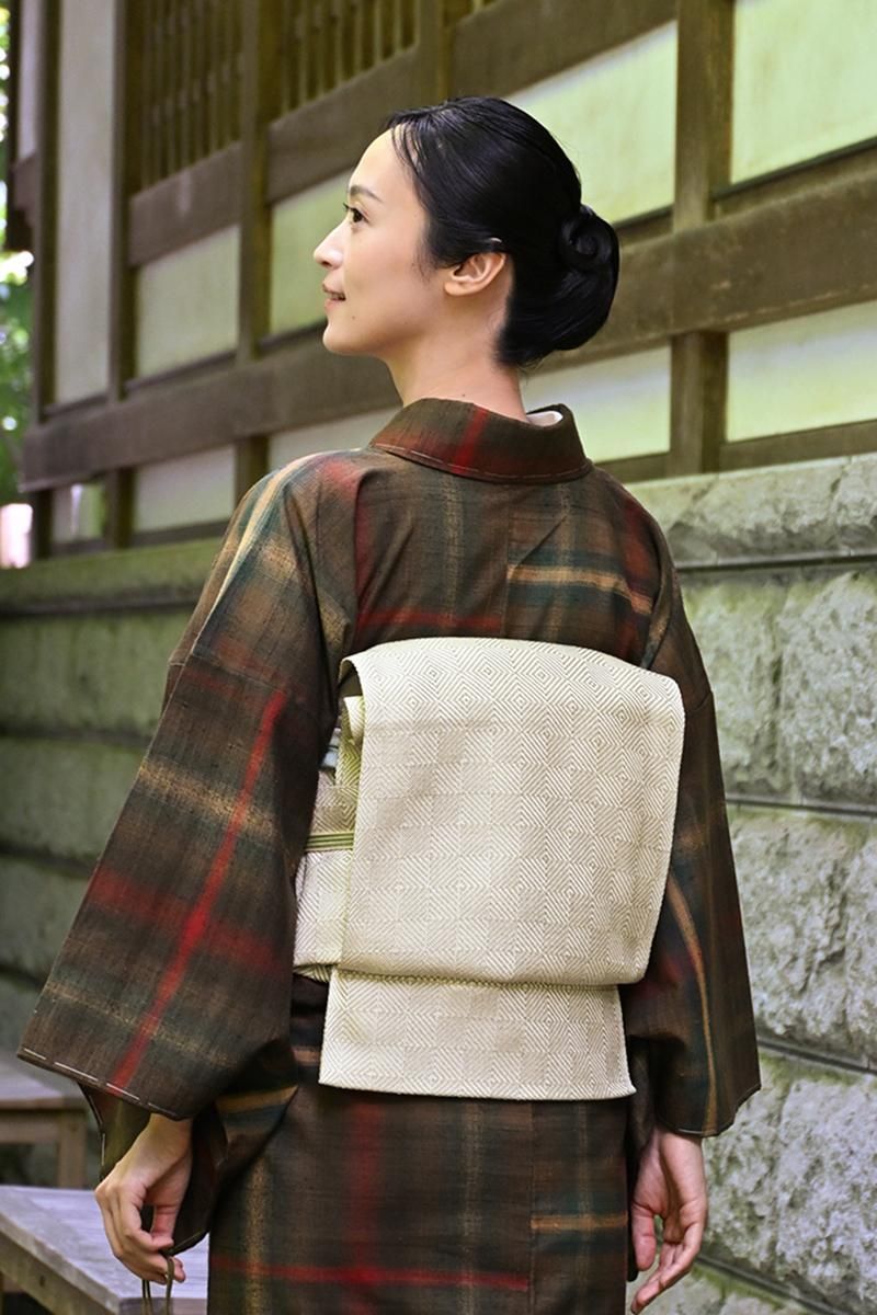 静岡県浜松市の旧家 高林家で織られていた伊兵衛織は、極太に撚った玉糸を丁寧に手染めし、手機で織り上げられる工芸色あふれる織物です。民藝運動に育てられた織りは、その原点である用の美とともに時代を超えたモダンな洗練を備え、多くの人に愛されてきましたが、作り手の求める糸の供給が途絶えたことから、その歴史に幕を下ろしています。どっしりとした風合いで知られる伊兵衛織ですが、帯はさらにふっくらと地厚。芯の入らない単帯で伸縮性に富んでいますのでとても締めやすく、お太鼓も美しく形が整います。こちらは定番の綾織りによる入子菱文。シンプルながら上質な絹糸が持つ柔らかな光沢が気品ある華やぎを放ちます。全体を包むお色のイメージは蒸栗色が近いでしょうか。経緯に砂色と柔らかな乳白色の2色を用いたシックなベージュ系は合わせる着物の色柄を選ばず、紬や小紋など様々な装いに活躍してくれそうですね。ぜひこの機会にお手に取ってご覧くださいませ。
