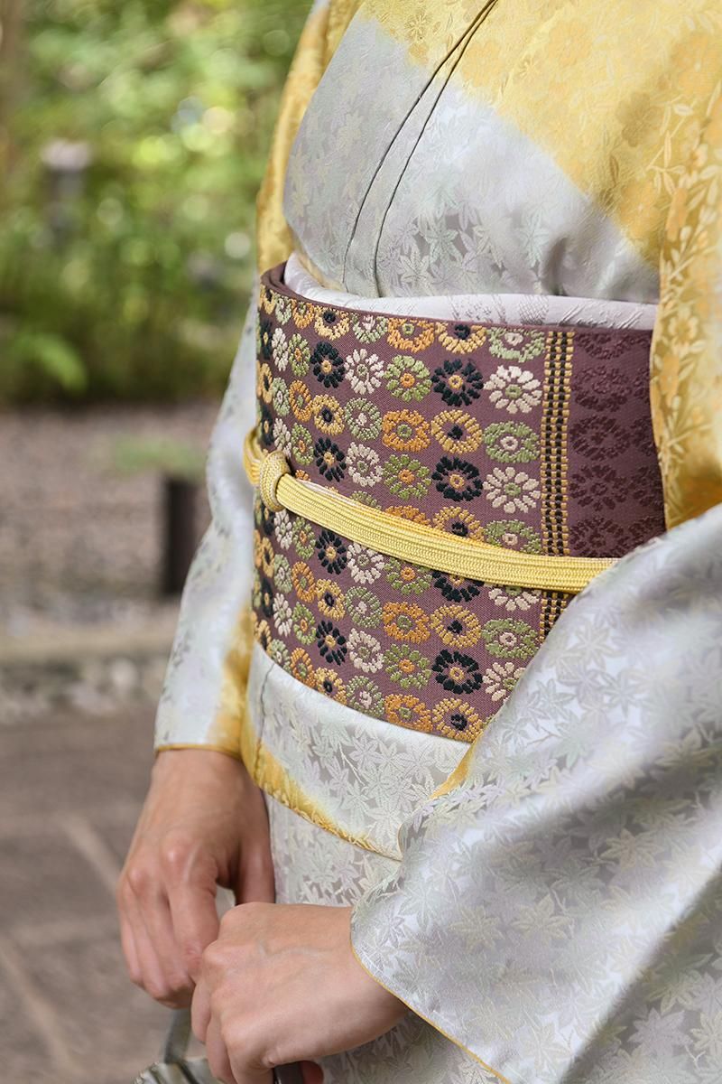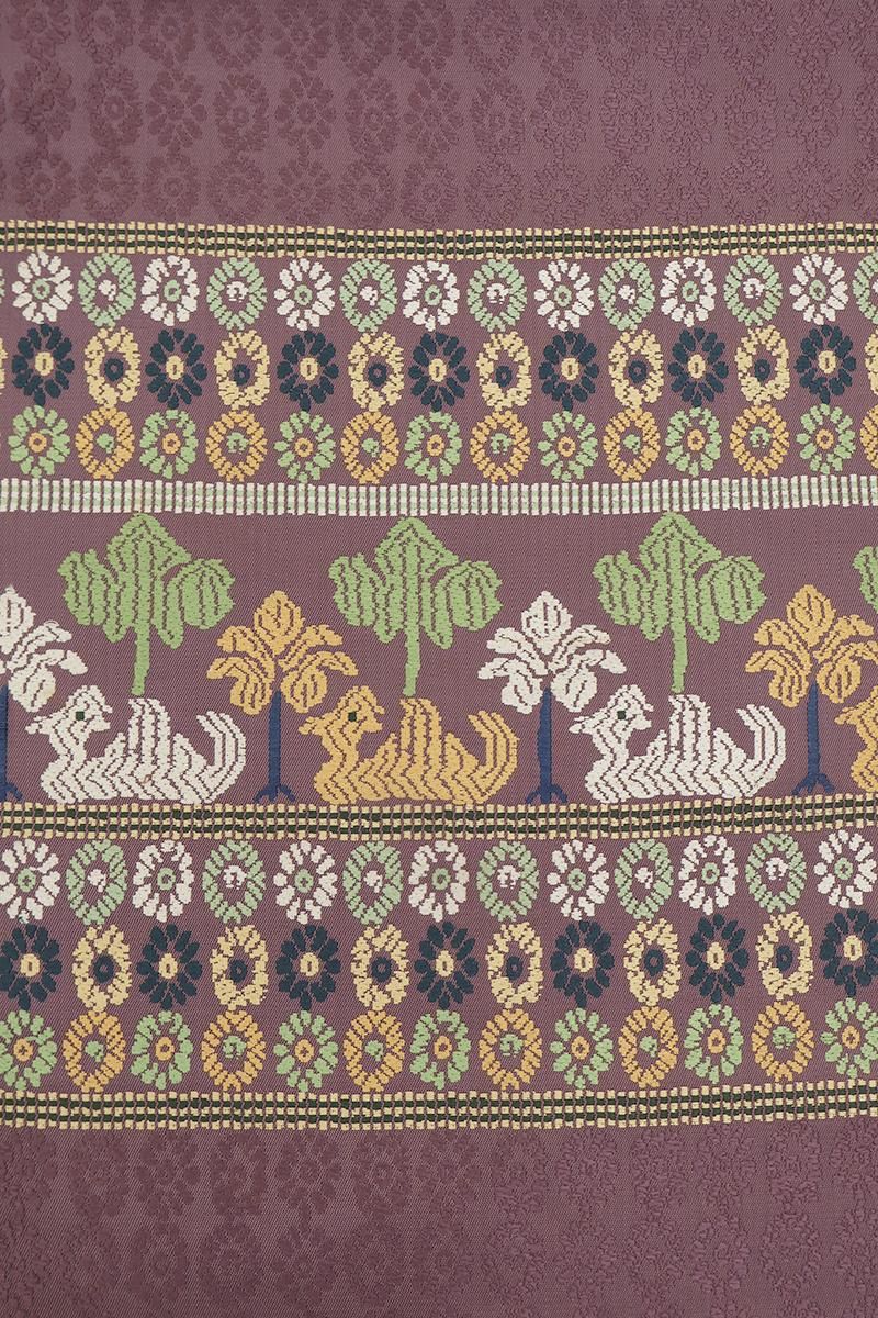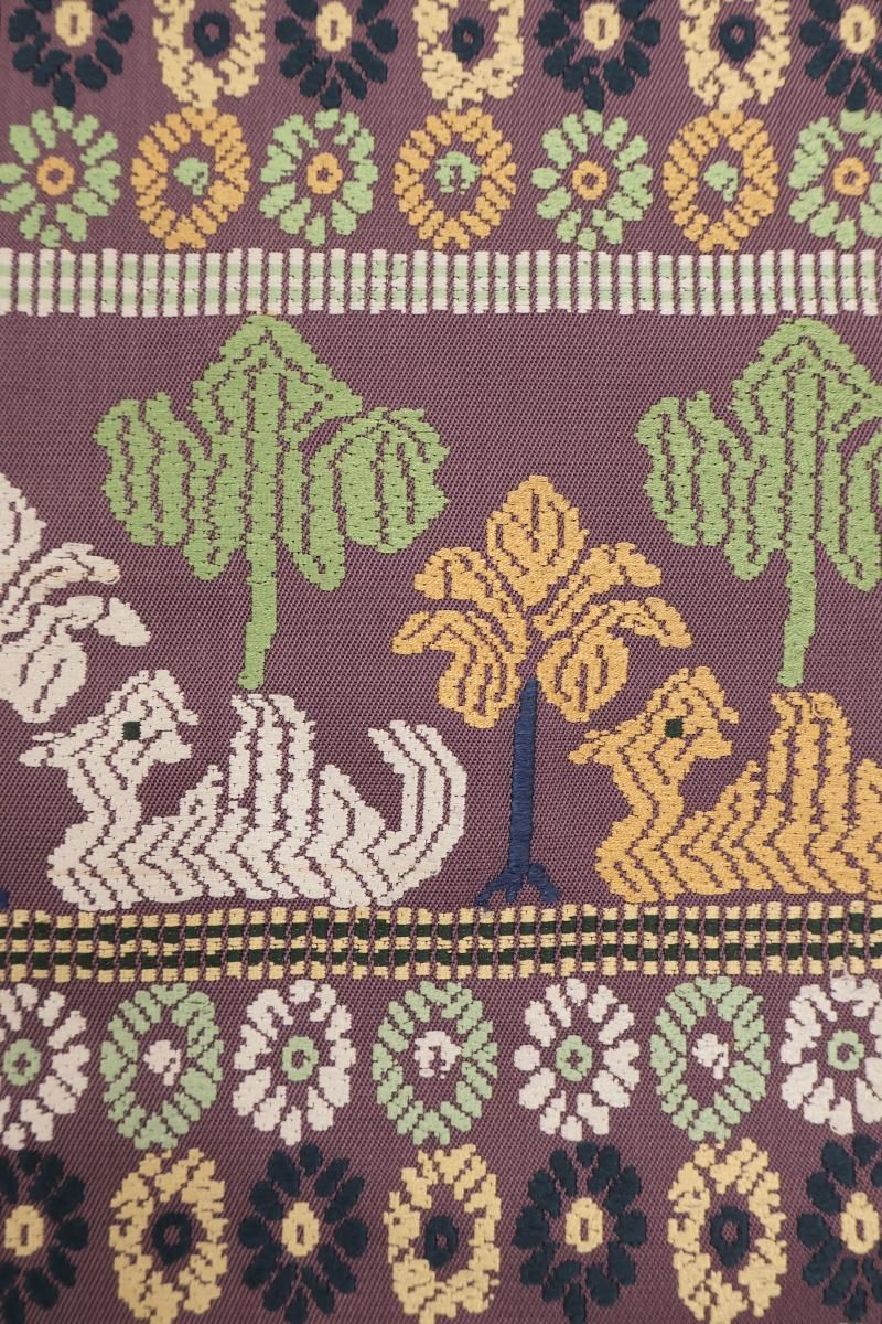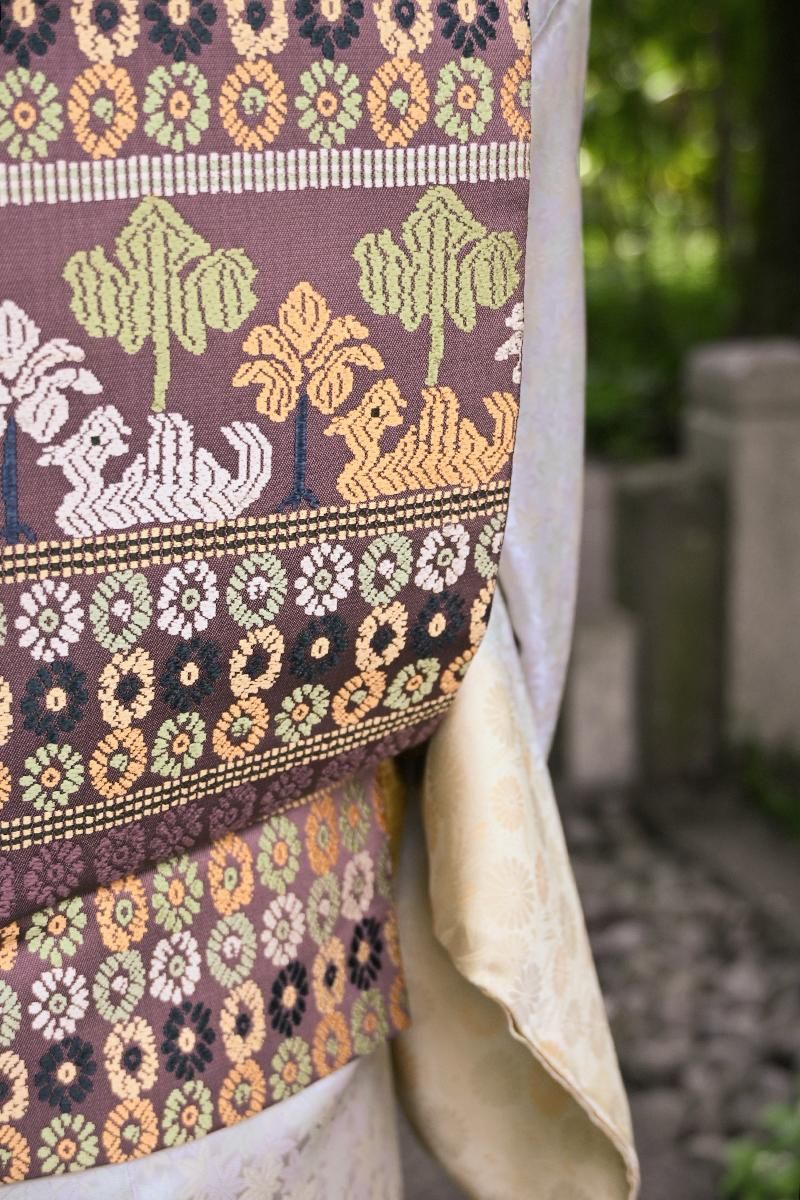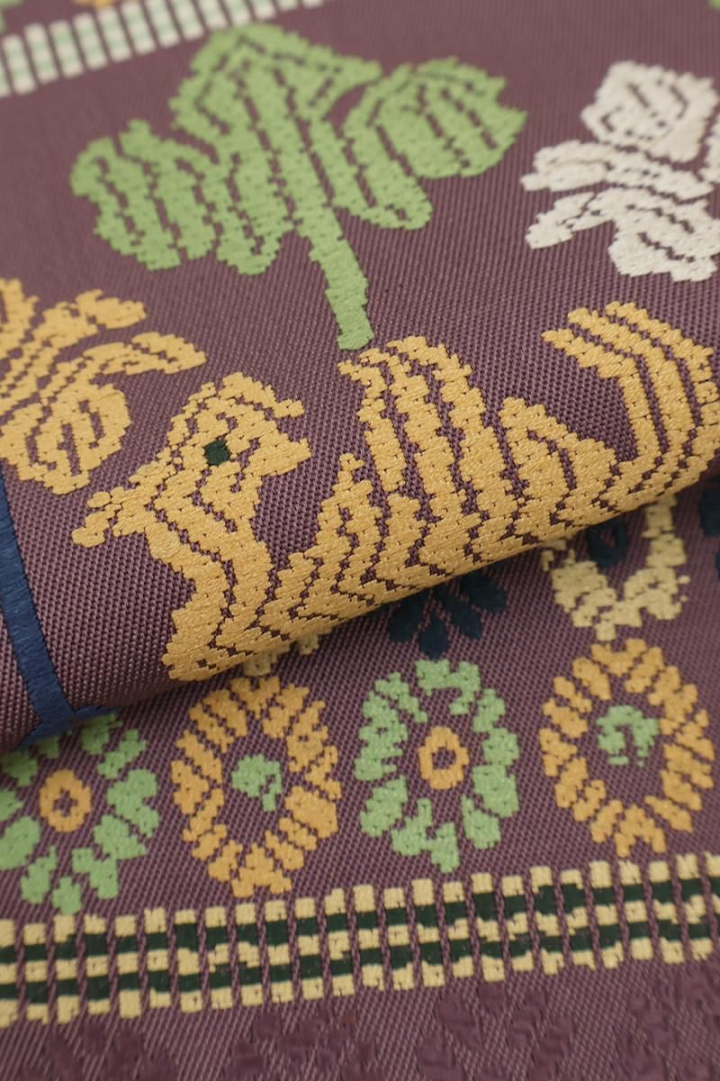 贅を尽くした帯づくりで知られる西陣 龍村美術織物さんのお品の中でも、最高峰として名高い「龍村平蔵製」の一連は、龍村錦帯として扱いも限られる逸品揃い。上代の宝物、名物裂、また南蛮由来などその出自も古今東西に無限に広がる多彩なモチーフが、様々な織技を駆使して表現されています。今回のご紹介は名物裂のいちご錦に有栖川の鳥文を重ねた 銘「鳥いちご」。灰みの強い落ち着いた紫色の地に鮮やかな黄色やグリーン、すっきりとした濃紺などの色糸が映えるお品です。龍村の帯らしい品格を備えつつも、どこかほっと息の抜けた楽しさが漂う、とても魅力的な一本ですね。金糸は使われておりませんので、紬から小紋、付下げなど幅広い装いに合わせて様々な場面で活躍してくれることと思います。日常のお出かけにお使いいただける平蔵さんの帯、上質を極めたカジュアルスタイルをお楽しみくださいませ。