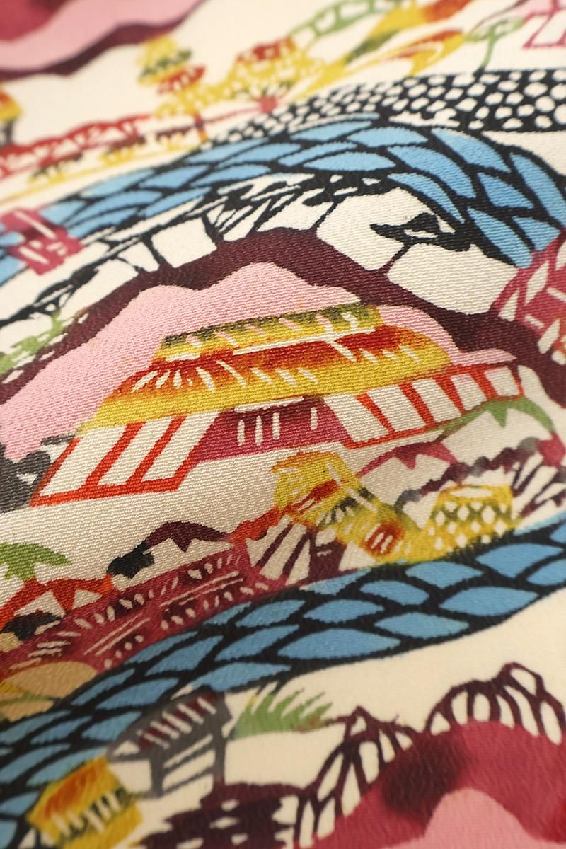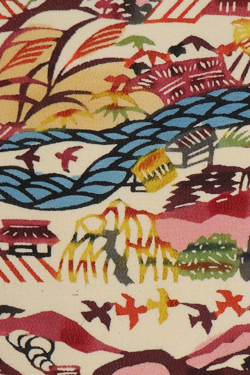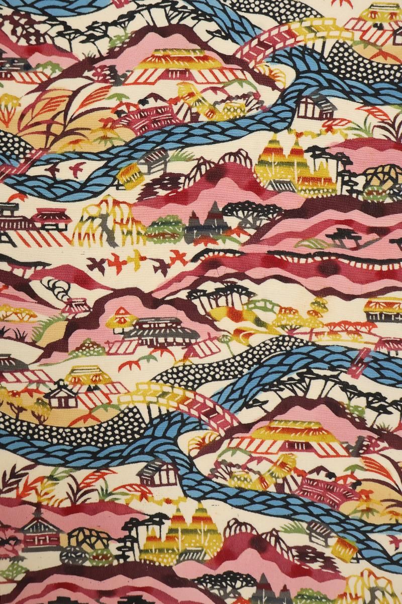 「型絵染」の重要無形文化財保持者・芹沢銈介さんの着物「小川紙漉村文」です。柳宗悦さんに大きな影響を受け、染色家として用の美を追究し続けた芹沢さんですが、紅型を慕い紅型を追って今日まできた、と自ら語っておられるように、その基盤は琉球の伝統的染色技術である紅型。鮮やかな色彩を自在に操り、卓越した意匠力をもって様々な分野で独創的な作品を制作なさいました。こちらは柔らかな鳥の子色の縮緬地に様々な彩りと共に、のどかな山里の風景が表現された着物。文化遺産オンラインのデータベースによれば、この作品に描かれた「紙漉村」とは和紙の産地として知られる埼玉県小川町であり、1935年に図案指導のために訪れた現地の風景をモチーフにしたものとのこと。鳥が飛び交い、樹木が息付き、青々とした小川が流れる牧歌的な村の様子が、繊細な型と深みのある色遣いによって丁寧に描き出されていますね。ご紹介が年々難しくなっている芹沢さんの稀少な作品、この機会にぜひお手に取ってご覧くださいませ。