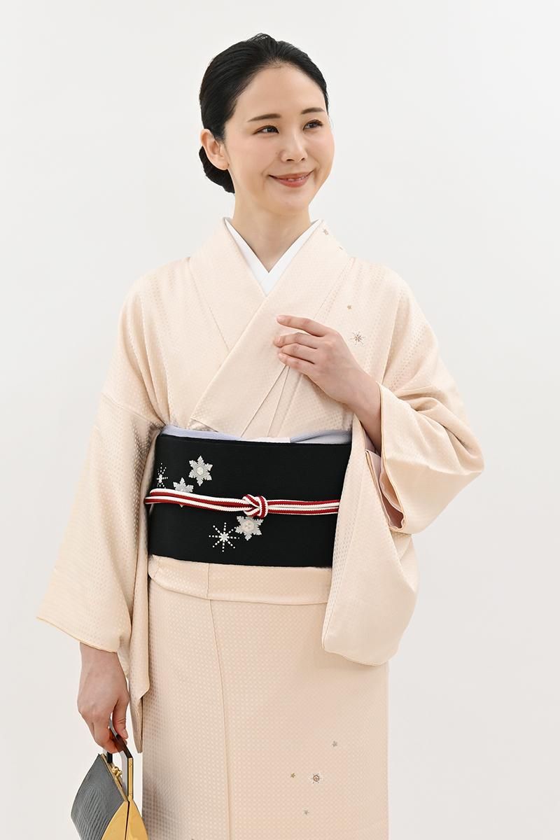 きりりとしたお色目に、すっきりと星のように浮かび上がる奥行きのある表現が後ろ姿を印象的に引き立てるお品、紬や小紋の装いにきらりと光る個性を添えてくれることと思います。お出かけが楽しみになってしまう季節ならではの一点、クリスマスシーズンのお出かけや気軽な集まりにいかがでしょうか。