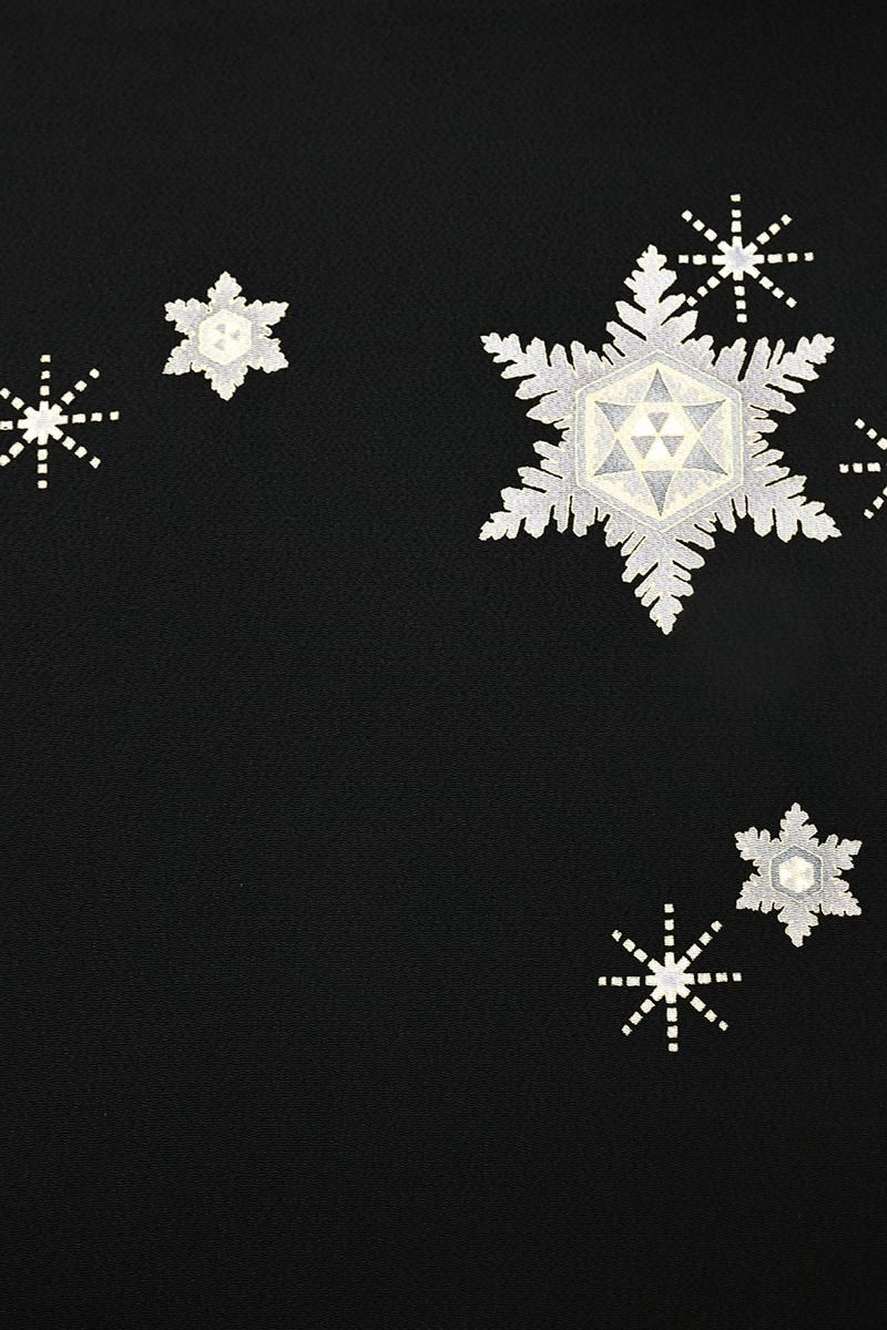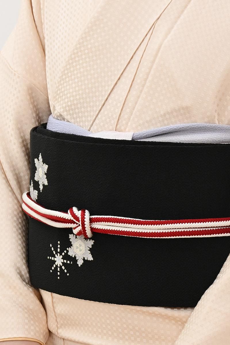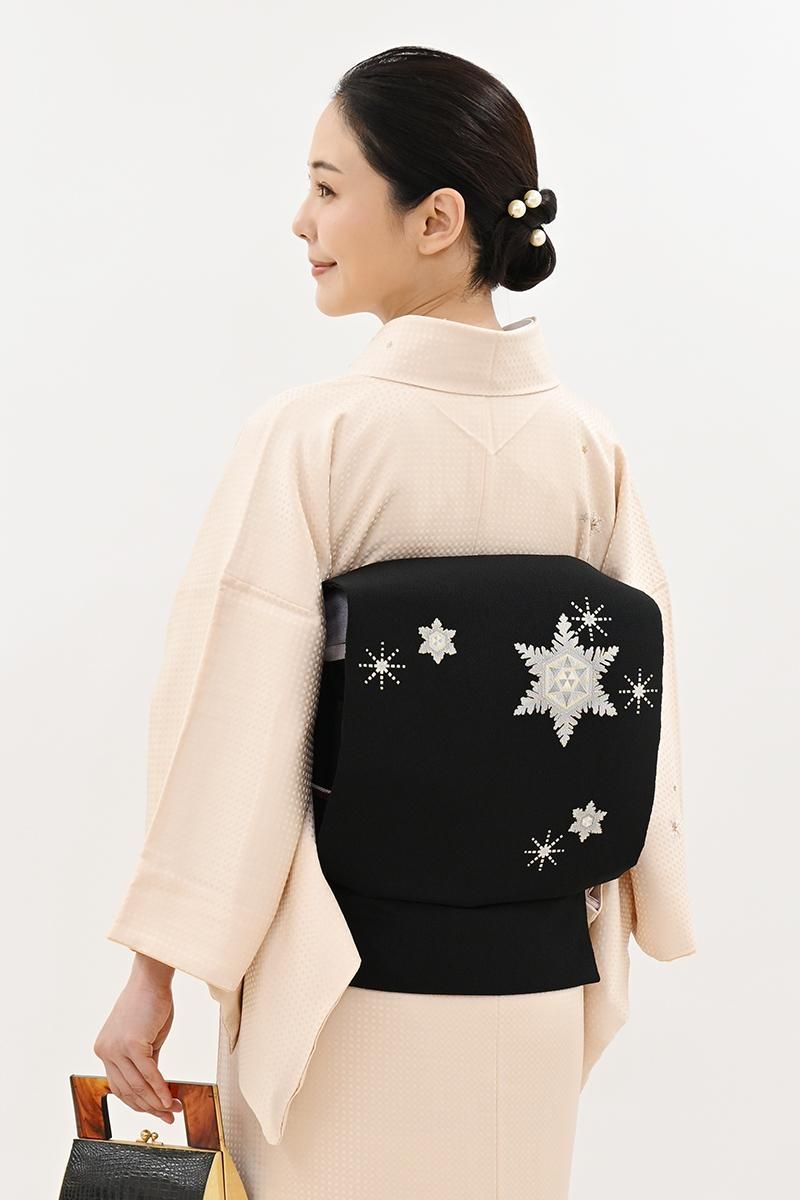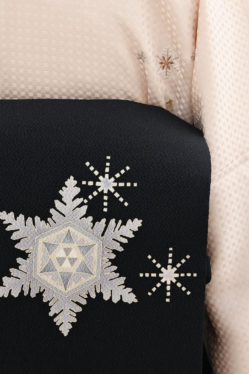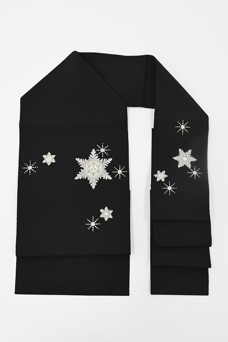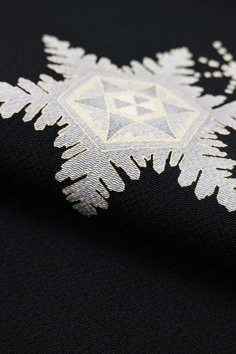 ふっくらとしぼを帯びた黒色の縮緬地に、雪花文を描いた名古屋帯です。