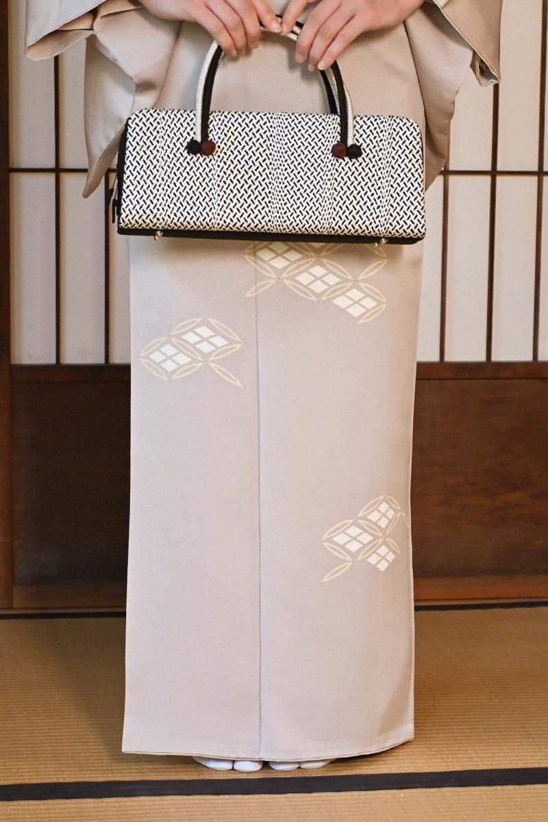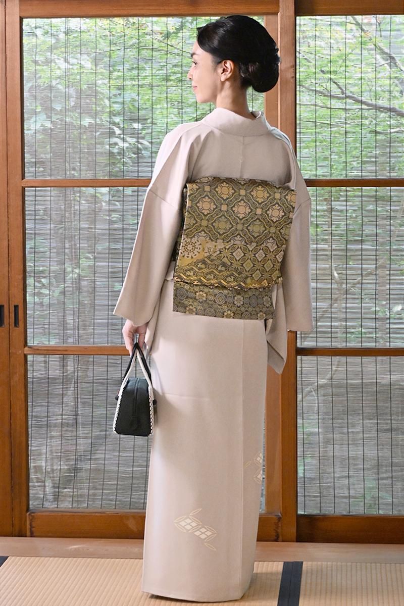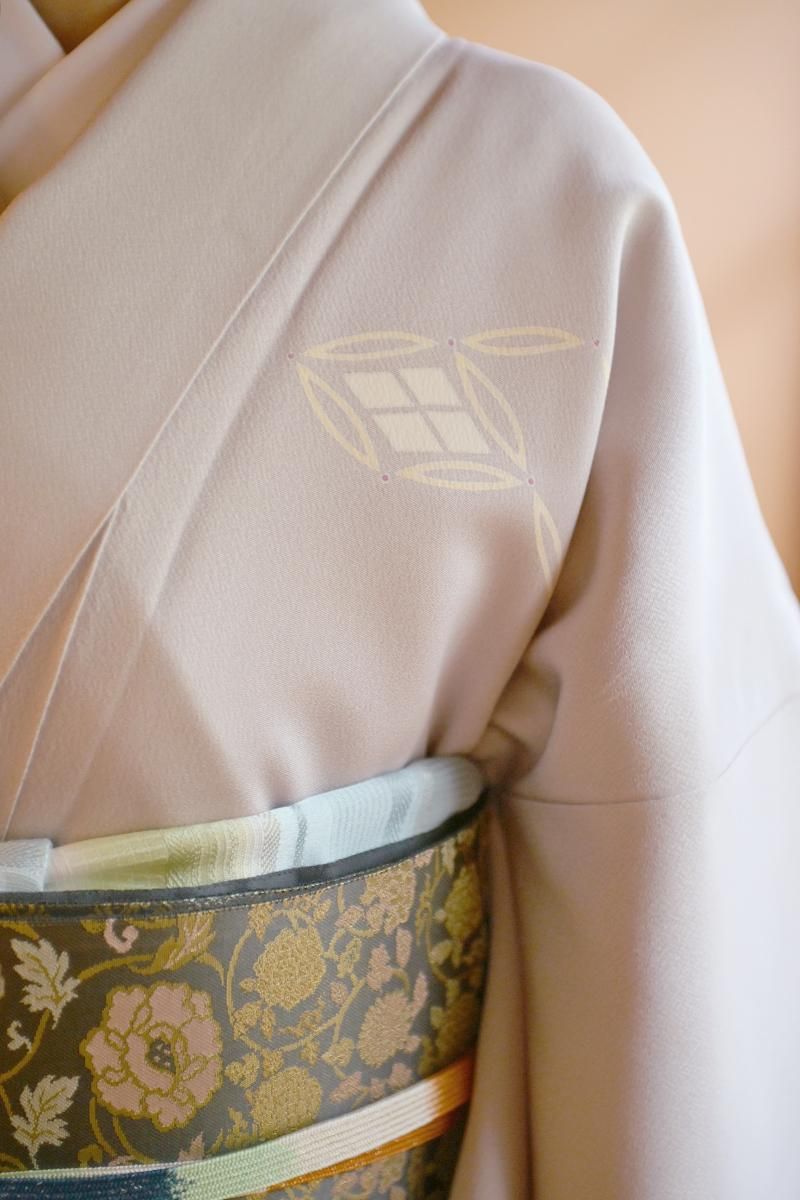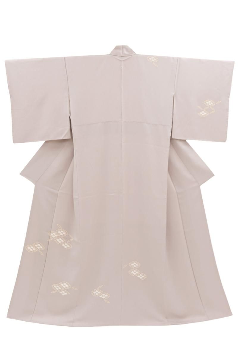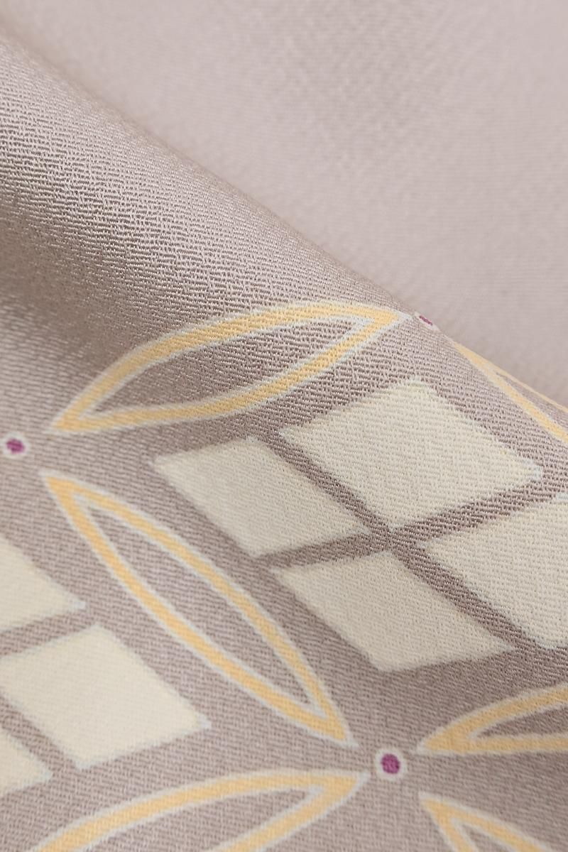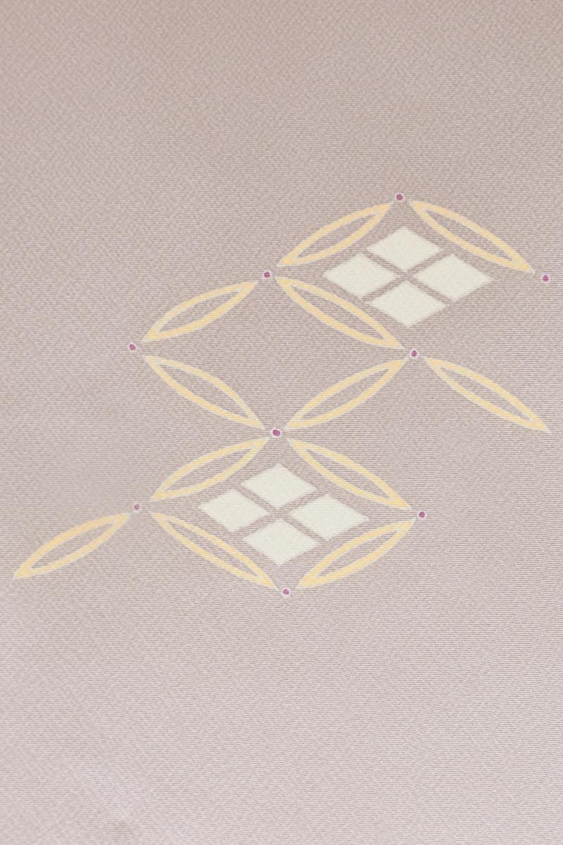 桜鼠色が近いでしょうか、灰みを含んだ淡いピンクの地に、破れ七宝文を配した付下げです。細かなシボを帯びたさらりとした縮緬地に、小ぶりな柄ゆきが楚々とした雰囲気のお品。品良く控えめな色柄は金彩や金糸を使っておらず、付下げとしてはやや軽めの印象ですので、織りの名古屋帯や、袋帯など帯合わせ次第で幅広い場面でお楽しみいただけることと思います。観劇やお食事会、お茶席などの改まったお席などに、大人の女性らしい愛らしさの漂う装いをいかがでしょうか。