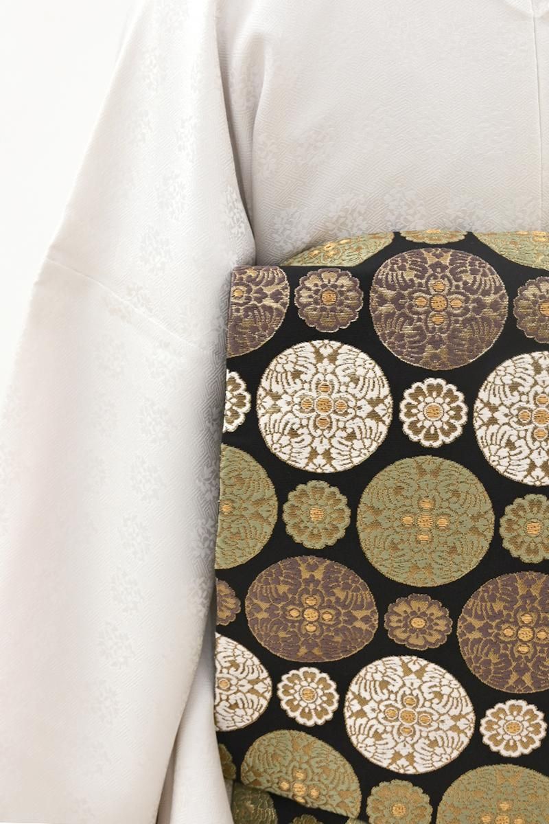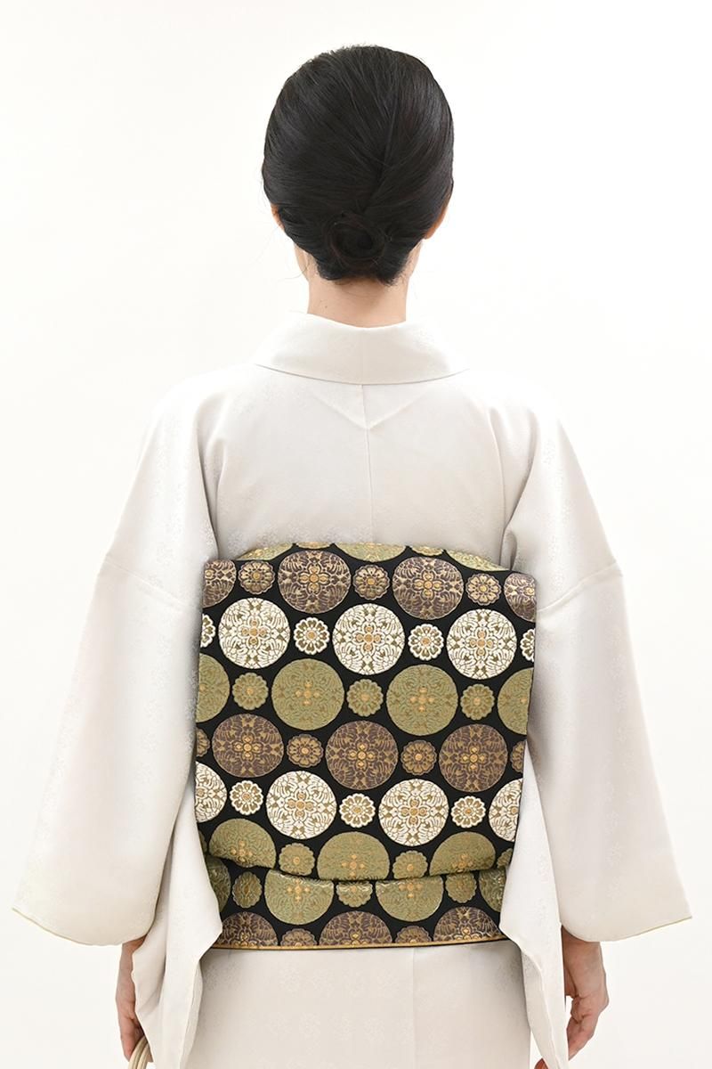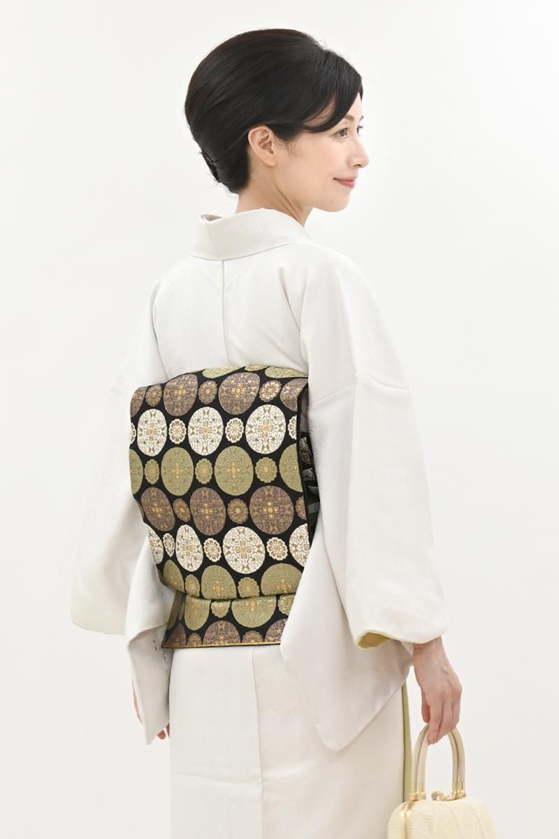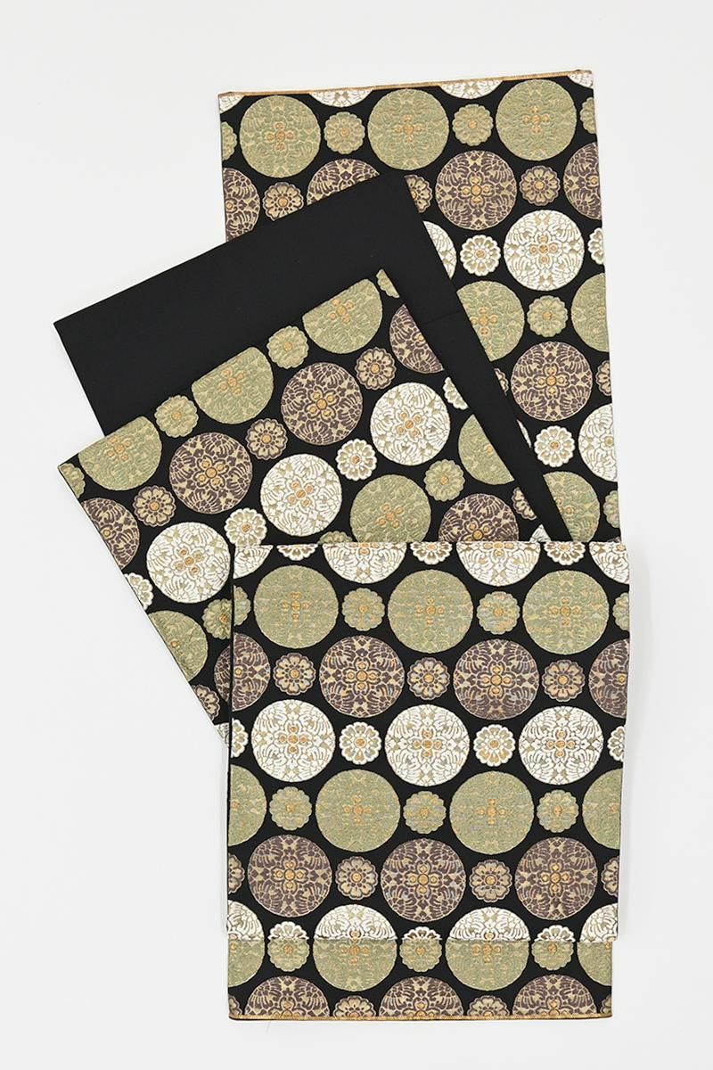 フォーマル性の高い帯では特に評価の高い西陣 河合美術織物製の袋帯です。こちらは黒色の地に、有職丸文を織りだしたお品、きりりとシックなお色目に渋みのある落ち着いた色遣いで表現された古典意匠が装いを気品豊かに引き立ててくれることと思います。改まったお席にも安心してお使い頂ける重みと品格を備えた一本、この機会にいかがでしょうか。