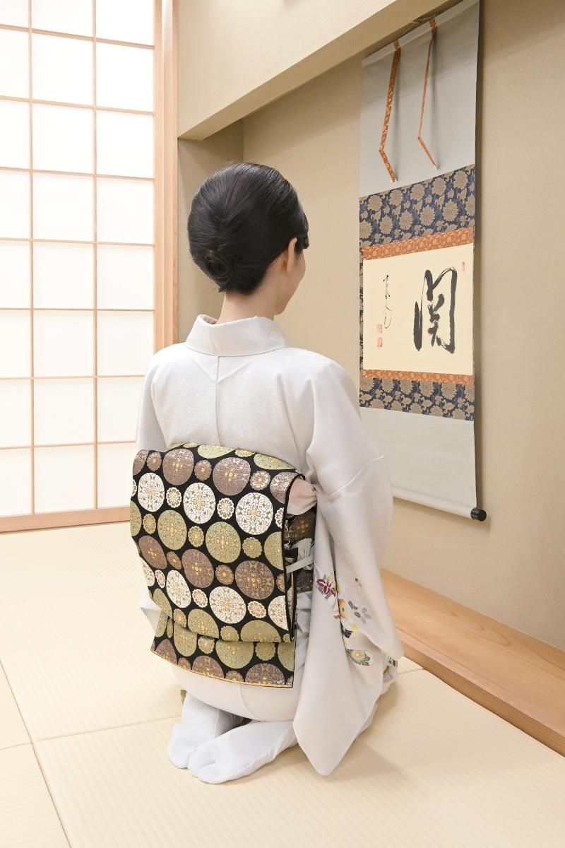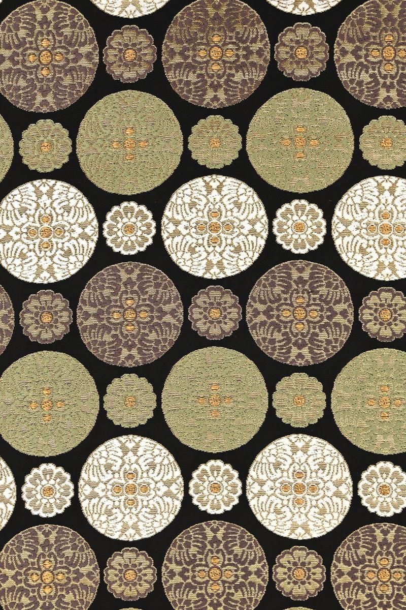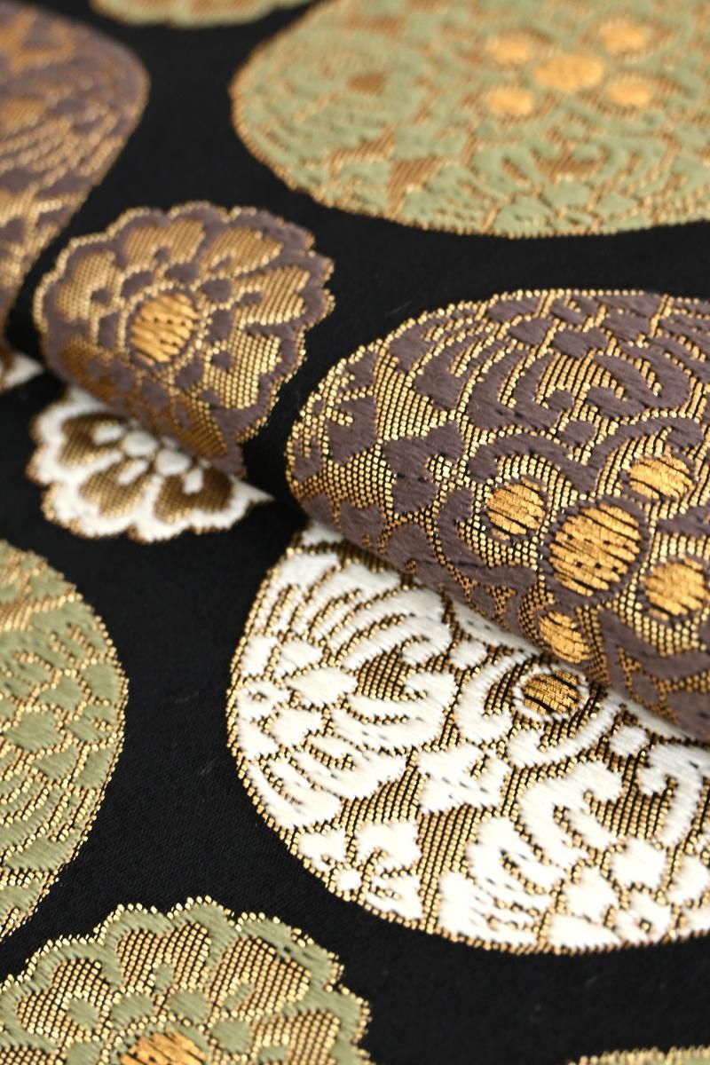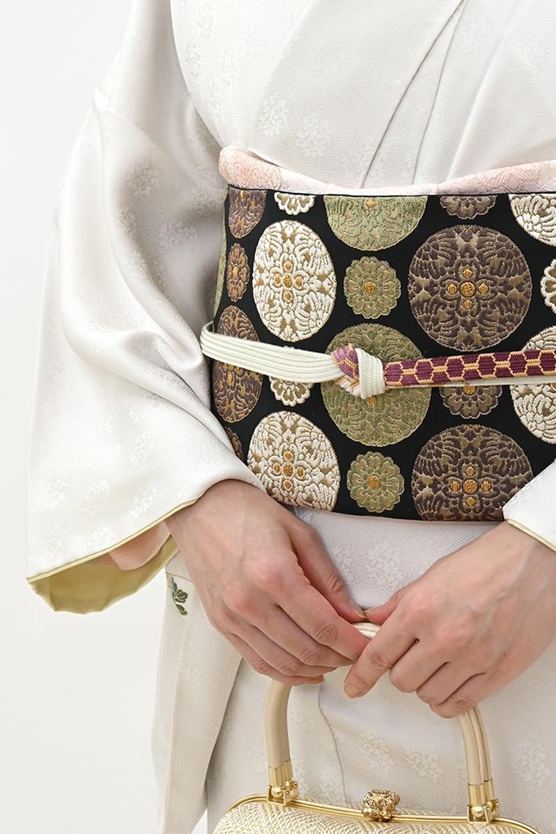フォーマル性の高い帯では特に評価の高い西陣 河合美術織物製の袋帯です。こちらは黒色の地に、有職丸文を織りだしたお品、きりりとシックなお色目に渋みのある落ち着いた色遣いで表現された古典意匠が装いを気品豊かに引き立ててくれることと思います。改まったお席にも安心してお使い頂ける重みと品格を備えた一本、この機会にいかがでしょうか。