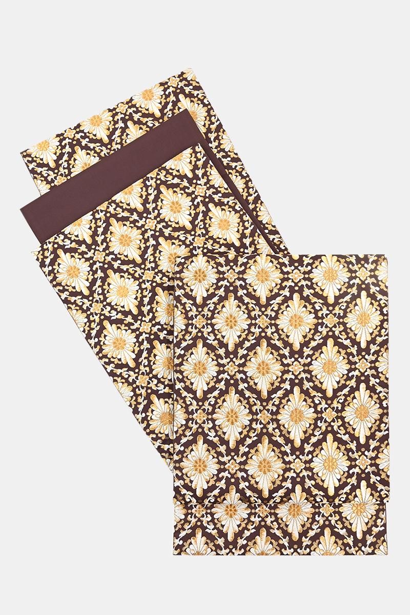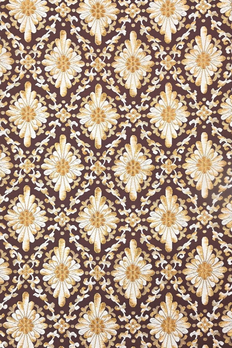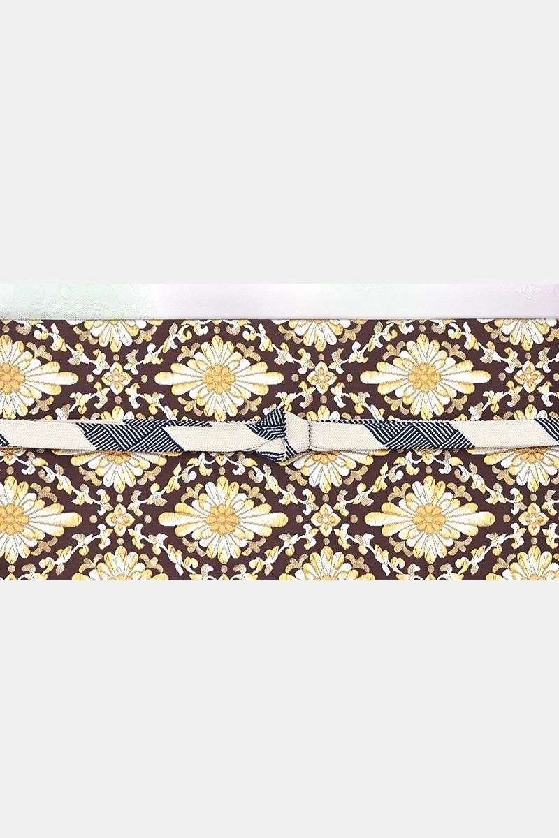 茶みを含ませた紫鳶色が近いでしょうか。紫がかったごく深い茶系を背景に、平箔の金糸や撚金糸を暈かしのように白糸に絡めながら、小花襷に菊菱文を組み合わせた連続模様が表現された袋帯です。深々としたシックな色を背景に典雅な意匠が整然と並べられたお品。白と金のみで彩られた清々しく、そして端正な景色が、社交のお席の装いを晴れやかに引き立ててくれることと思います。こちらは唐織を中心とするフォーマル帯ではとりわけ評価の高い西陣 河合美術織物織物さんの作。正統派古典意匠ならではの高い格調が滲む静かな表情は、改まったお席から華やかなパーティ、式典など活躍の機会も多いことと思います。秋からのお呼ばれに、ぜひご用意くださいませ。