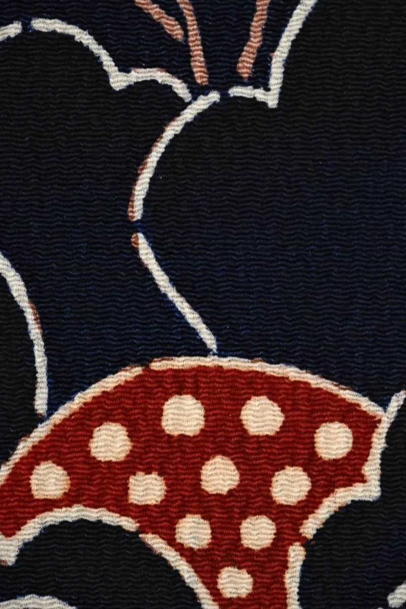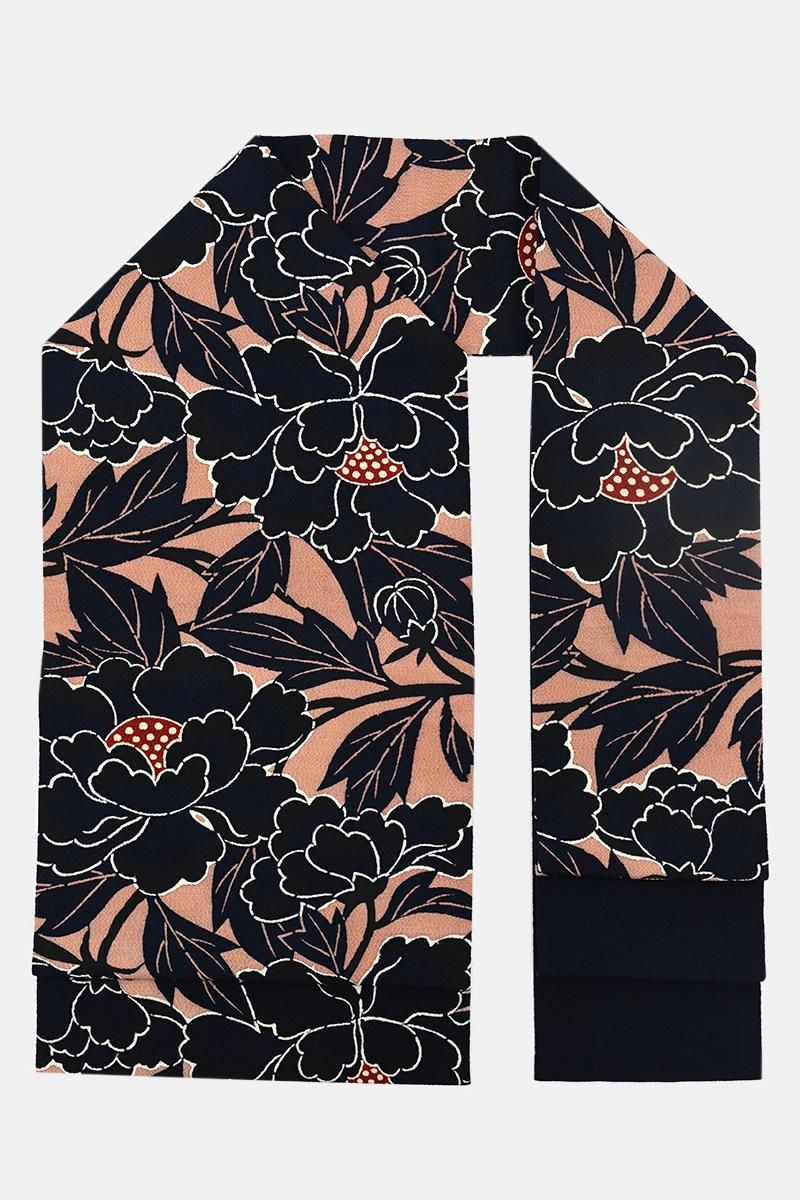 日本各地の伝統的な染織技法やその歴史についての深い理解をもとに、吟味された素材と妥協のない仕事によって、その一つ一つを最高のかたちで再現なさった染織家 浦野理一さんの作品です。こちらはしっかりとしたシボのある縮緬地に、大胆な牡丹花のモチーフが染め上げられた型染めの名古屋帯。やや黄みがかった鴇色が近いでしょうか、甘過ぎない落ち着いたピンクと濃紺色に黒を組み合わせて、百花の王と呼ばれる華麗な花を力強く表現していますね。花蕊に用いられた暗い赤をきりりと効かせた華やかな景色が、遠くからも目を惹く印象的な優品、紬や小紋などに合わせて頂けば、大人の女性ならではの上質なカジュアルスタイルをお楽しみ頂けることと思います。型染めには良く用いられる古典的な意匠ながら、随所に光る拘りや圧倒的な存在感に、この方らしい個性が光る一点。ぜひこの機会にお手に取ってご覧くださいませ。