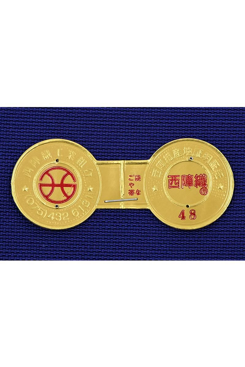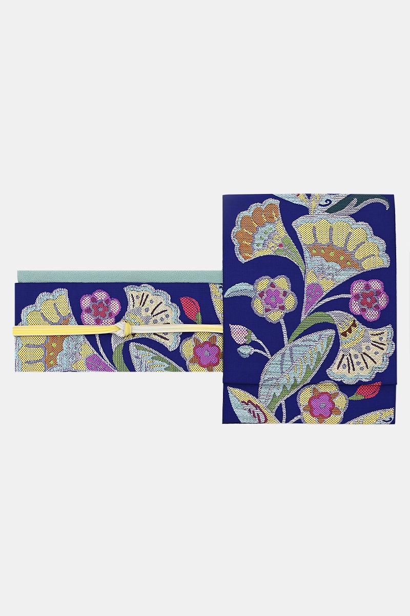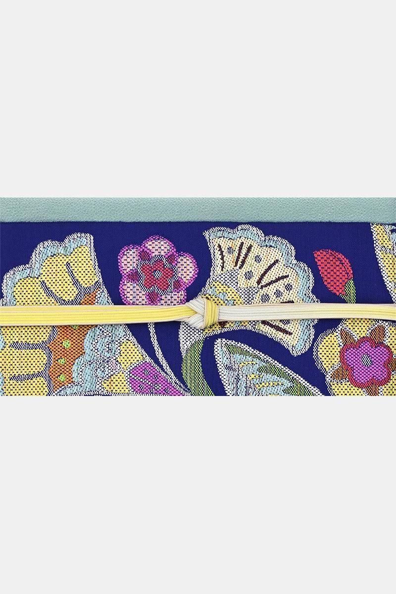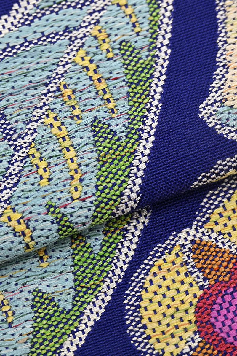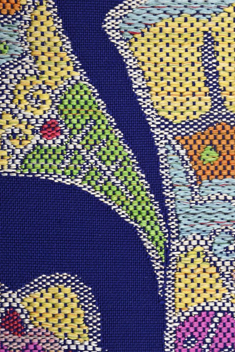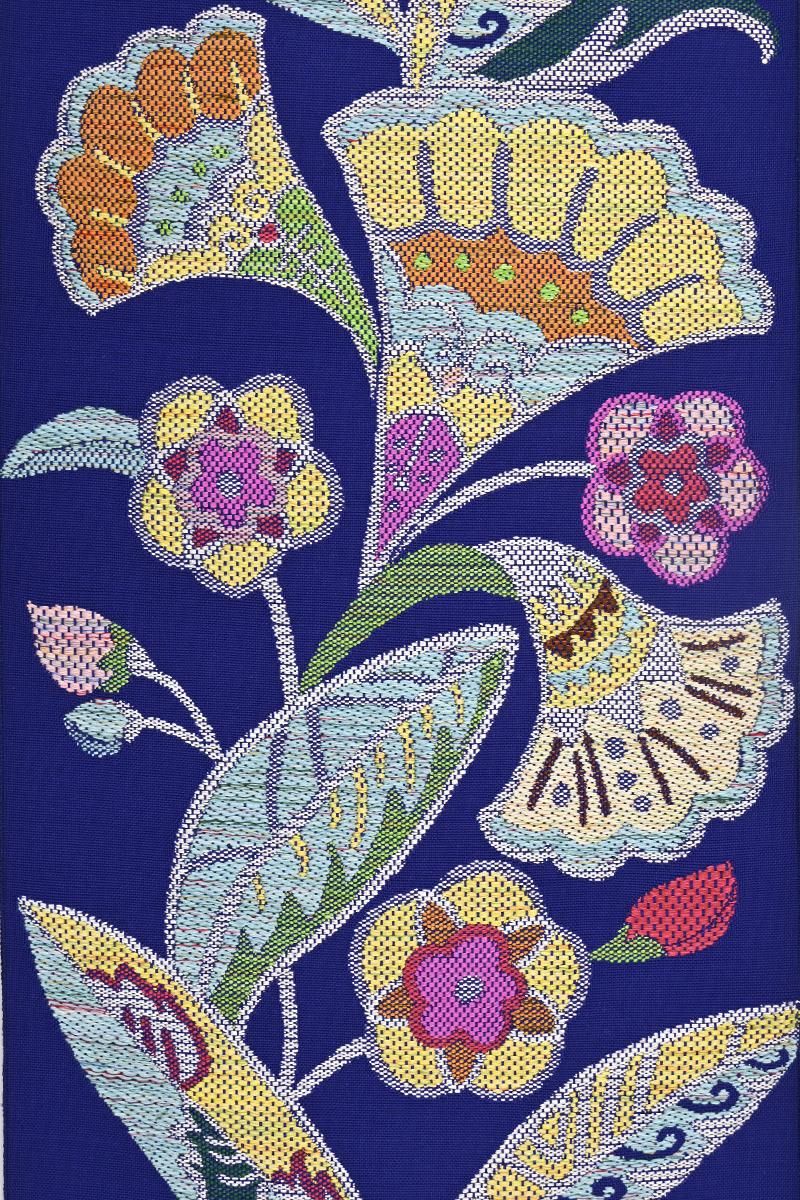 青紫色が近いでしょうか。青みの強い鮮やかな紫の紬地に、銀の平箔糸を絡めた銀白色が描線を縁取る大胆な花葉が配された、八寸名古屋帯です。こちらは西陣証紙No.48、装いを個性豊かに引き立てる存在感のある帯づくりで定評ある老舗機屋・帯屋捨松さんの作。紅桔梗色や赤色、灰梅色に玉子色、赤朽葉色や薄水色など洋のイメージが強い華やかな彩りを組み合わせ、モダンなモチーフを力強く表現した、捨松さんらしいオリジナリティが光る一点ですね。凝った糸遣いから生まれる陰影豊かな景色は、高度な技術と意匠力を持つ機屋さんならではのもの。紬や小紋などの装いに合わせて、洗練された軽やかな洒落みをお楽しみくださいませ。