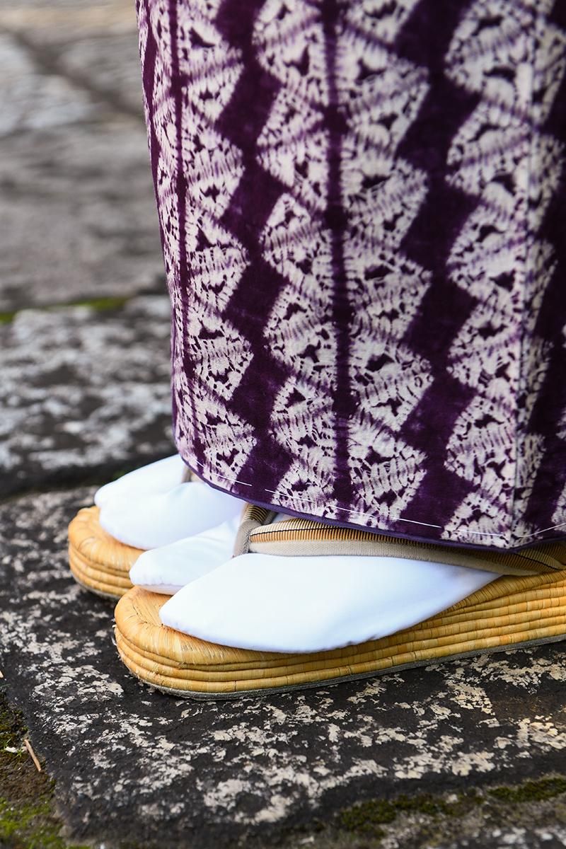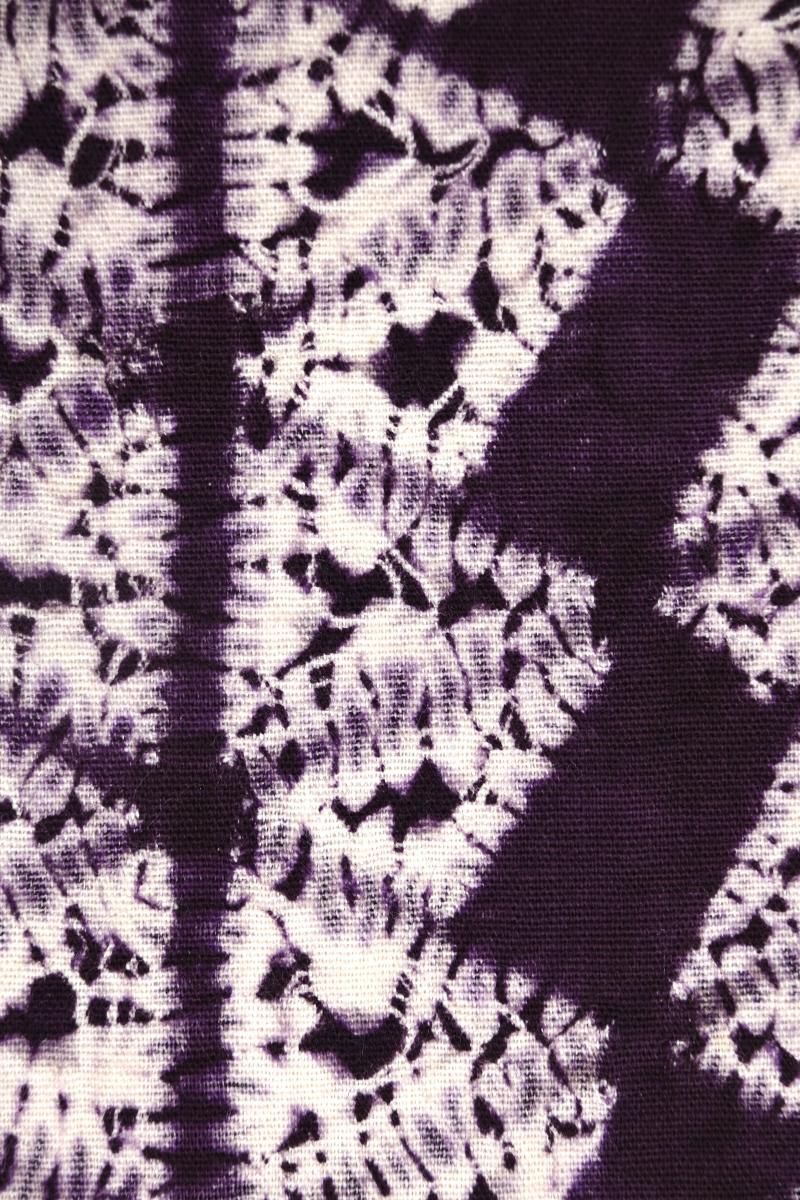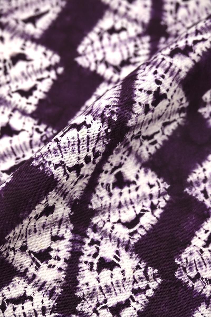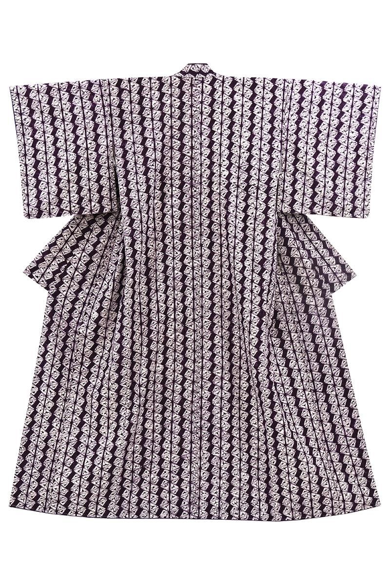 古くから南部地方に伝わる茜染めと紫根染めを守り続ける盛岡の工房・草紫堂さんの着物です。こちらの紫根染は、熟練の技術を持つ市内近辺在住の女性が時間をかけて反物を手で絞り、染料としてとりわけ稀少な紫草の根を用いて繰り返し染められます。手のかかる仕事を入念に積み重ね、更に仕上げの後に数年寝かせることでようやく目にすることのできる紫根の色はやはり特別なもの。穏やかな華を備えた上品な女性らしさに、どなたも魅せられることと思います。今回のご紹介は希少な木綿素材のお品で、草紫堂さんの古い柄見本の冊子にも定番として掲載されているモチーフ。少し傾いだように長方形が並べられた、すっきりとした幾何文です。白場とは反対側に傾いだ紫の小さな長方形が、うねるような縞となって、ふんわりとした白場をバランス良く引き締めていますね。木綿地の素朴な風合いはまた絹とは異なる独特の魅力があり、清楚な色みはもちろん、柔らかな布味からは触れているだけで心癒やされるような温かみを感じます。ぜひこの機会にお手に取ってご覧くださいませ。