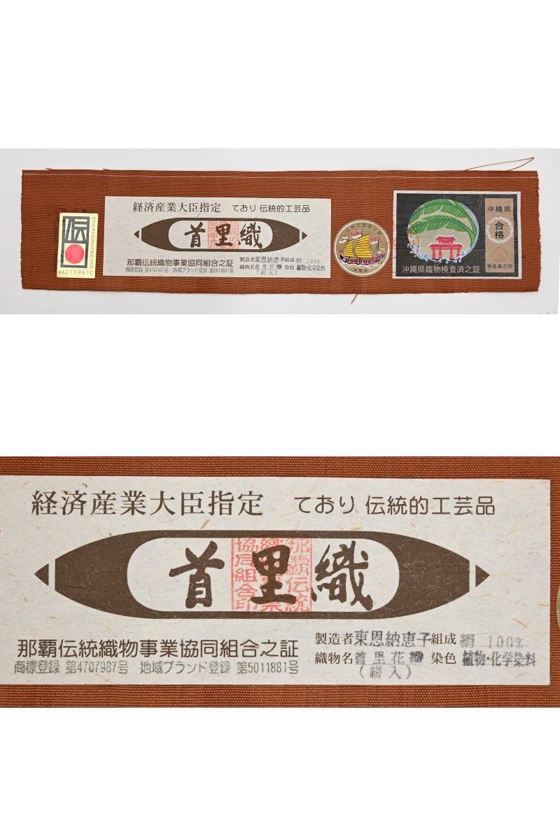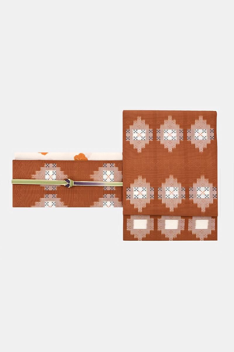 琉球王府の貴族や士族のための衣服として織り継がれてきた首里織は、花倉織・首里花織・道屯(ロートン)織・手縞・綾の中・総絣など様々な種類に別けられます。今回ご紹介の帯は首里花織の技法が用いられた九寸織名古屋帯。団十郎茶色が近いでしょうか。赤みをやや薄めた穏やかな茶系の地に、同色の緯糸浮織、白練色の経絣による幾何文、重ねて黒色と赤朽葉色の緯糸浮織が配されています。落ち着いた茶を主調としたシックな景色は、糸の細い繊細な織り味とも相俟ってとてもモダンで洗練された印象を受けますね。丁寧な手仕事が重ねられた沖縄の染織品ならではの確かな存在感が光る一点、可愛らしい趣きのお品が多い読谷山や南風原の花織とはまた趣きが異なる、大人のカジュアルスタイルをお楽しみ頂けることと思います。東恩納恵子さんの作で、伝統的工芸品指定のお品。ぜひお手に取ってご覧くださいませ。