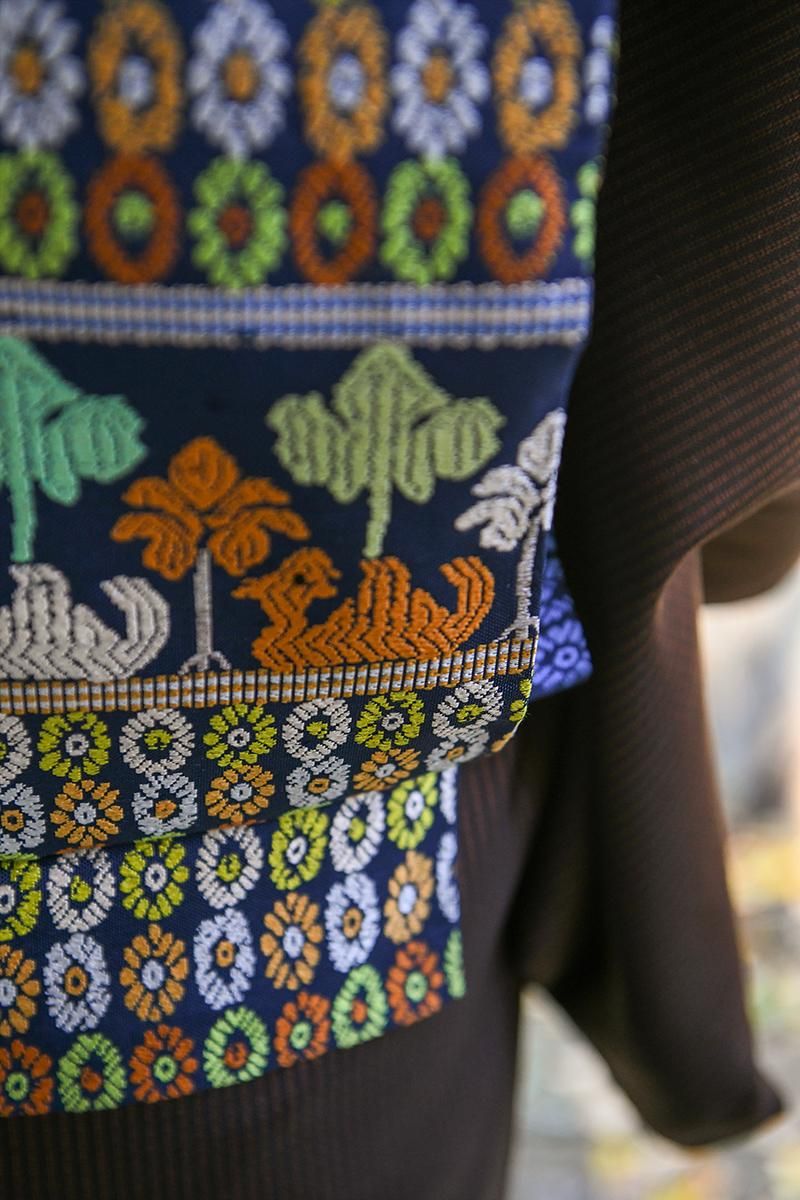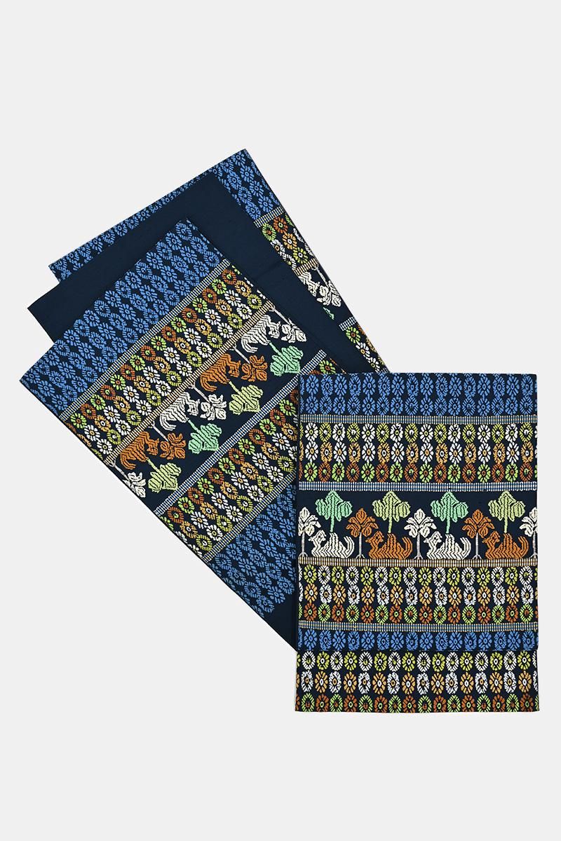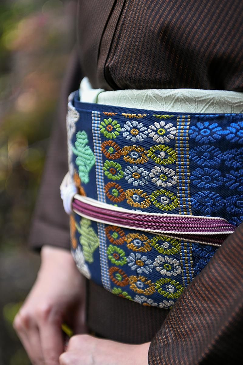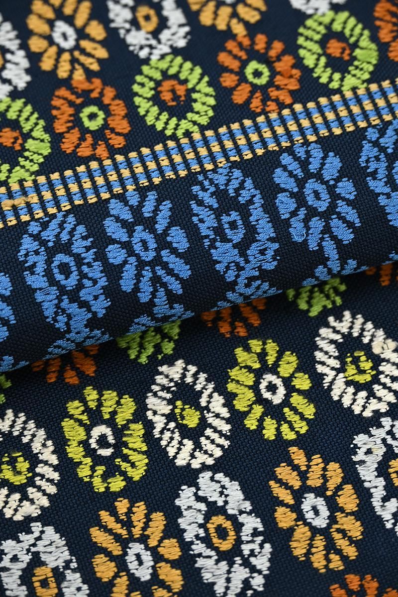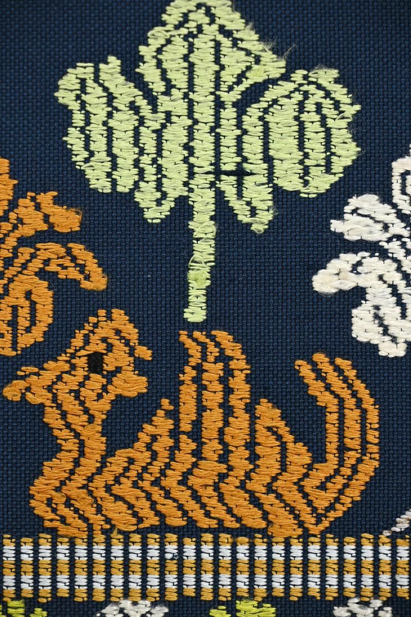 贅を尽くした帯の代名詞とも言える「龍村平蔵製」の本袋帯は、西陣の名門 龍村美術織物さんが高島屋さんのオリジナルとして制作する特別な逸品、龍村錦帯として扱いも限られる最高峰のブランドですね。上代の宝物から南蛮由来など出自も様々な多彩かつ個性的なモチーフが、贅沢な素材と高度な手技を駆使して重厚に表現されています。今回のご紹介は名物裂由来のいちご錦に有栖川の鳥文を組み合わせた銘「鳥いちご」本袋帯。鉄紺色が近いでしょうか。深々とした暗い青を背景に上下には鮮やかな青色のいちご文を置き、間には青柳色や鶸色、赤朽葉色に柑子色、絹鼠色と象牙色、若苗色と浅緑色など様々な系統の明るい濃淡色を組み合わせて、同じくいちご文と共に木陰に佇む鳥たちが独特のかたちで表現されています。植物や鳥たちの姿はどこか異国の趣きを感じさせ、力強い色遣いと共に個性的な存在感を見せてくれるお品。それでいて、どこかほっと息の抜けた楽しさをも感じさせてくれる、とても魅力的な一本ですね。龍村の帯らしい品格を備えつつも金糸が使われていない紬地ですので、紬から小紋、付下げなど幅広い装いに合わせて様々な場面で活躍してくれることと思います。とりわけ綿薩摩や本結城等、存在感のある上質な織物などに合わせていただくと、大人の女性ならではの上質を極めたカジュアルスタイルをお楽しみいただけそうですね。ぜひこの機会にお手に取ってご覧くださいませ。