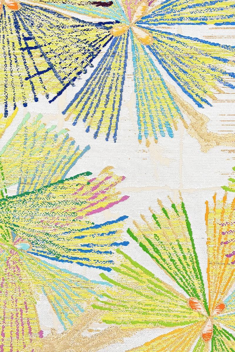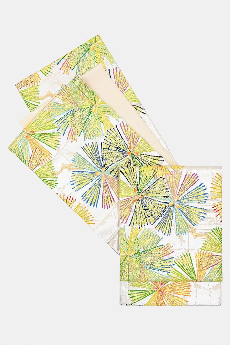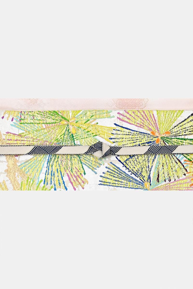 贅を尽くした帯の代名詞とも言える「龍村平蔵製」の本袋帯は、西陣の名門 龍村美術織物さんが高島屋さんのオリジナルとして制作する特別な逸品、龍村錦帯として扱いも限られる最高峰のブランドですね。上代の宝物から名物裂、南蛮由来など出自も様々な多彩かつ個性的なモチーフが自在に用いられていますが、今回のご紹介は銘「神韻寿松図」本袋帯。高島屋さんによれば、中国南宋の絵画の影響を受けた車軸松の図柄で、我が国の障壁画にも多く見られたその風趣を金銀箔を用いて織り成したものとのこと。練色の地に金銀の平箔糸を通した煌びやかな背景から、橙に萱草、真朱や青柳、黄緑に群青、浅葱や紅藤、京紫などの鮮やかな彩りやラメ糸と共に、大ぶりの唐松文が浮かび上がる華麗なフォーマル帯です。正に障壁画の一部を切り取ったかのような迫力ある景色が、留袖や訪問着などの第一礼装を重厚に引き立ててくれることと思います。数ある龍村平蔵作品の中でもとりわけ長く愛され続けてきた名品、ぜひこの機会にお手に取ってご覧くださいませ。
