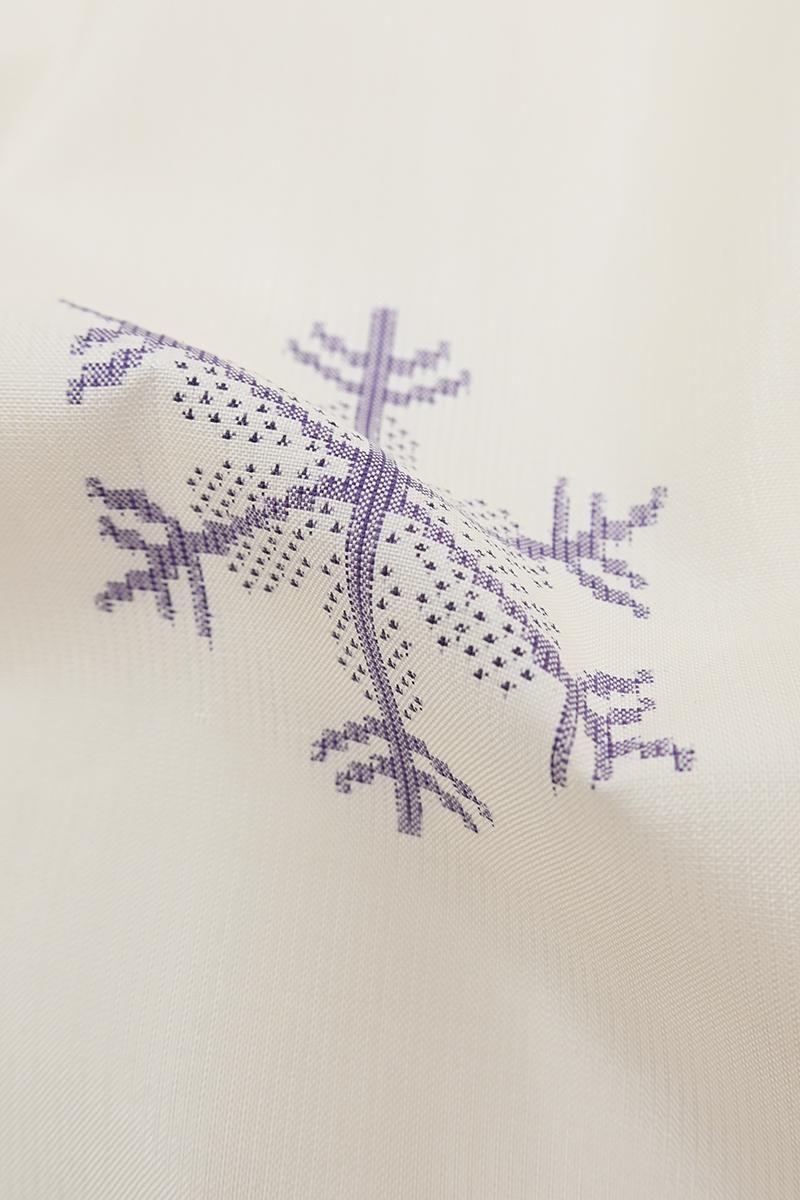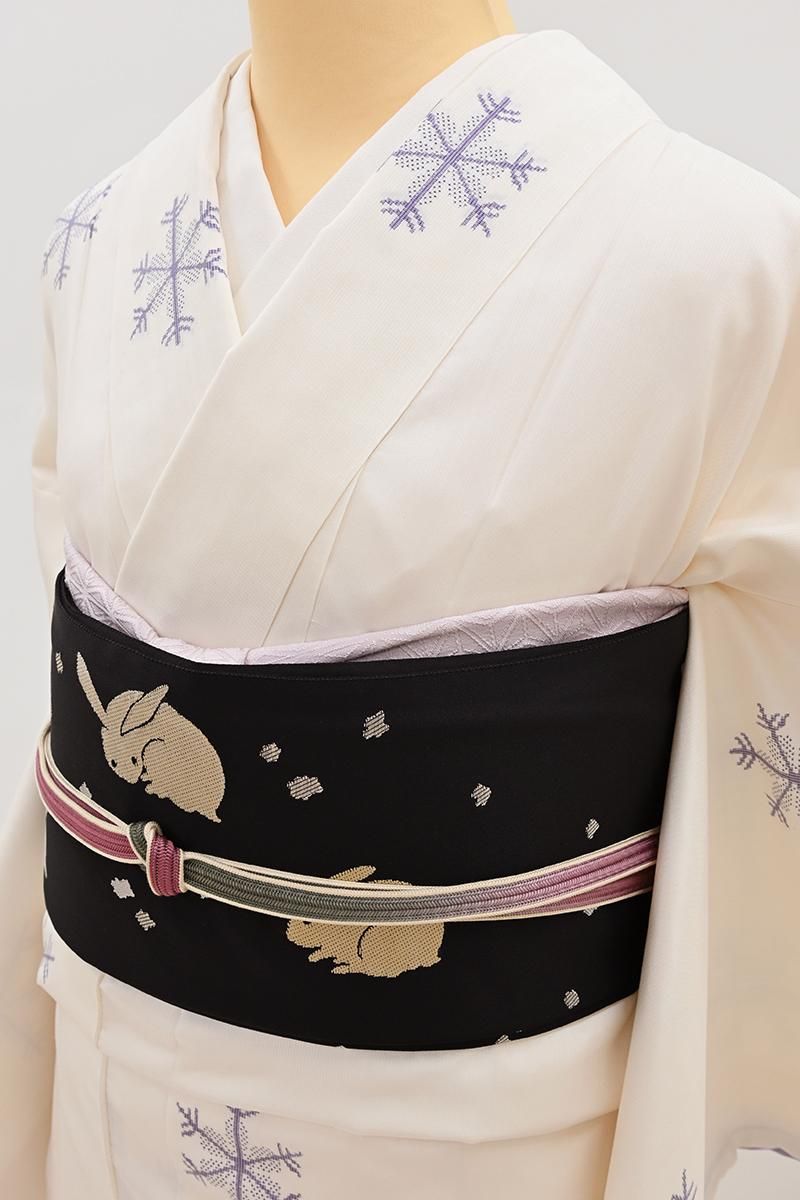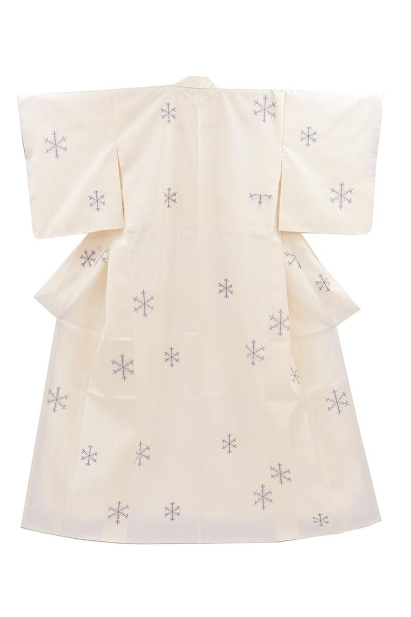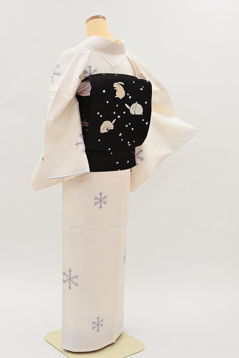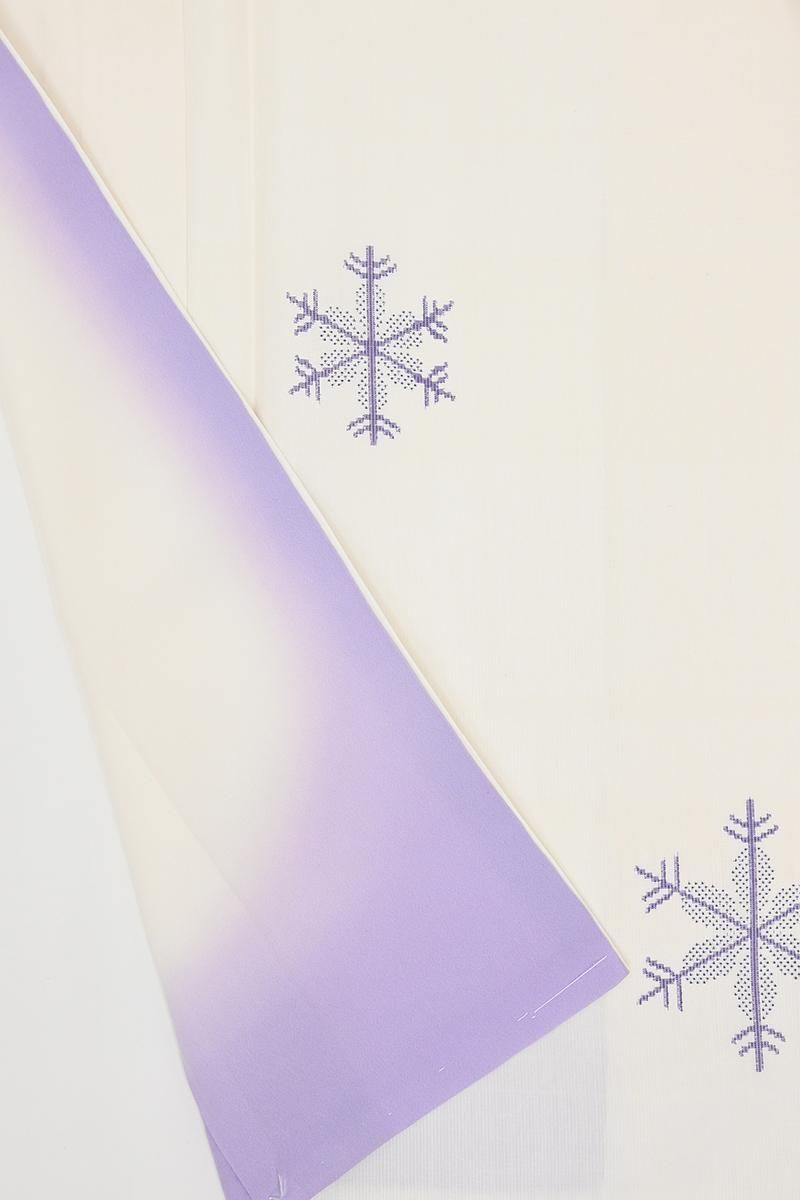 微かな黄みを含んだ温かみのある白色の地に、淡い青紫色で雪花文を織り出した本場白大島紬です。こちらは柔らかな光沢と、軽やかで裾さばきの良い大島紬ならではの布味が魅力のお品、清々しい白地に冬の風情感じる愛らしいモチーフが美しく引き立ちますね。帯合わせも幅広く、お友達との気軽なお出かけなどに遊び心ある装いをお楽しみいただけることと思います。ぜひこの機会にいかがでしょうか。