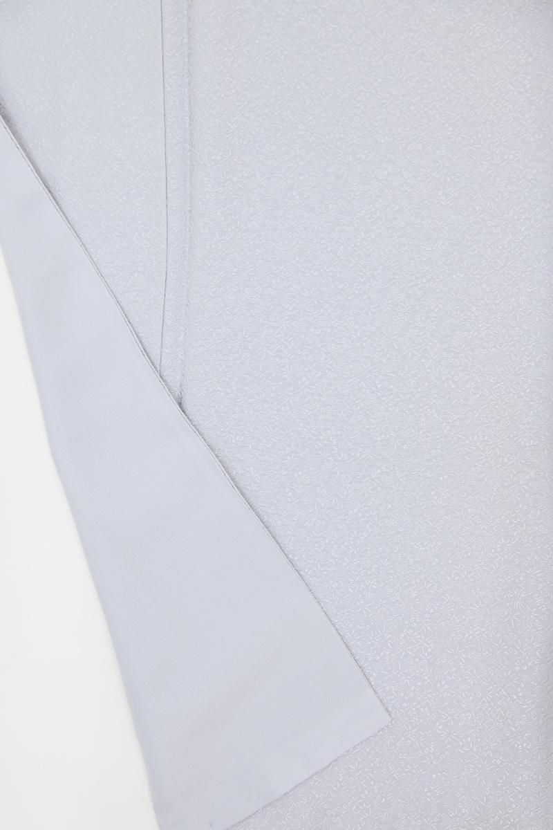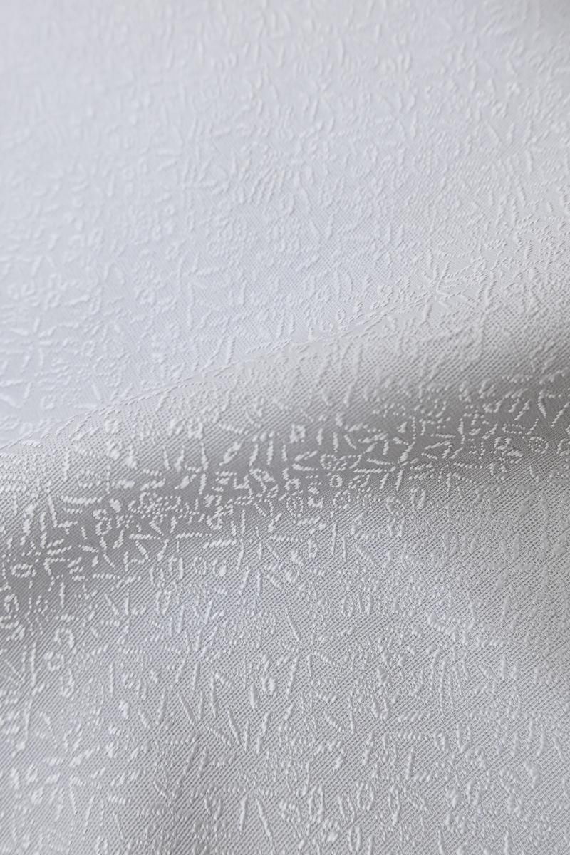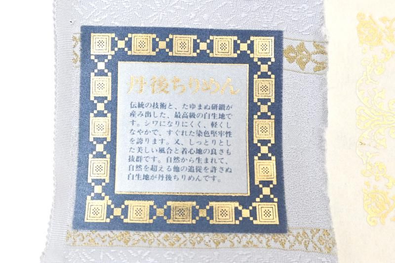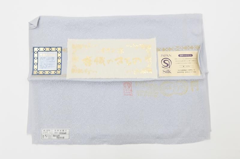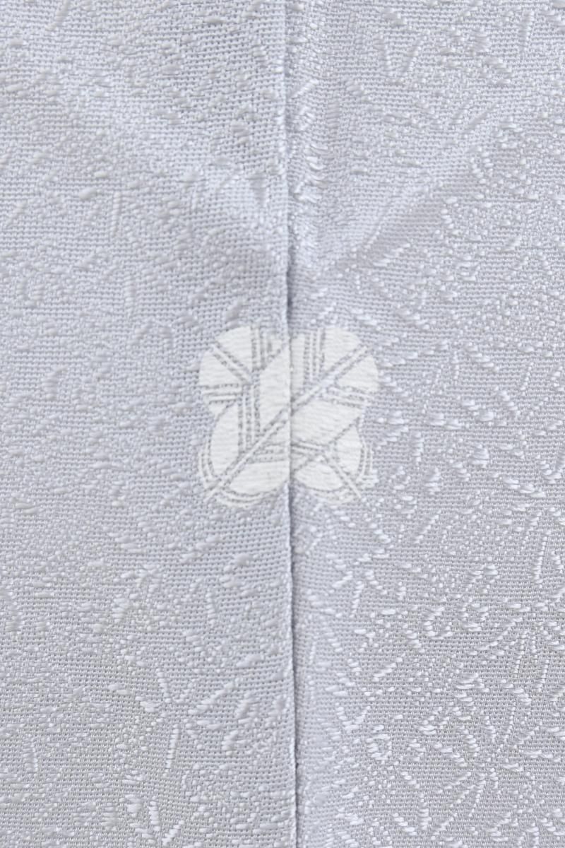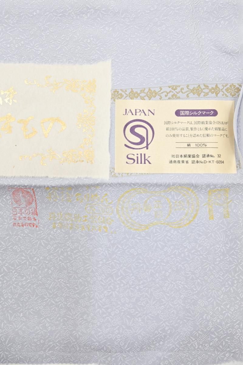 微かに灰みを含んだごく淡い青紫色の地に桐竹鳳凰の地紋の浮かぶ色無地です。柔らかな光沢を帯びた地風が品良い華やぎをたたえ、すっきりと落ち着いた印象のお色目は大人の女性らしい品格を演出していますね。お召しになる方の年齢を選ばず、幅広い場面にお召しいただけることと思います。染の一ッ紋が付いておりますので、お茶席などの改まった場面にも安心ですね。ぜひこの機会にいかがでしょうか。