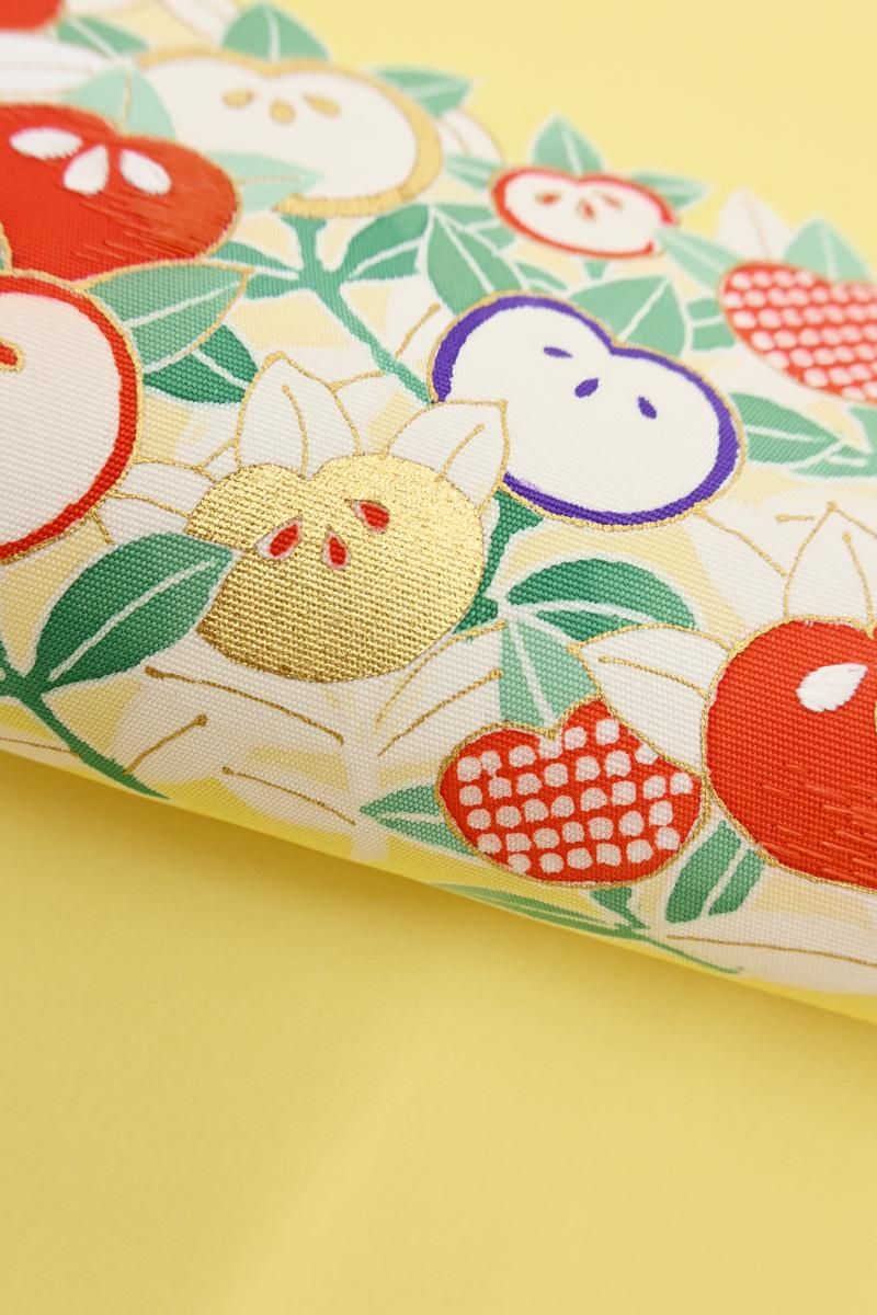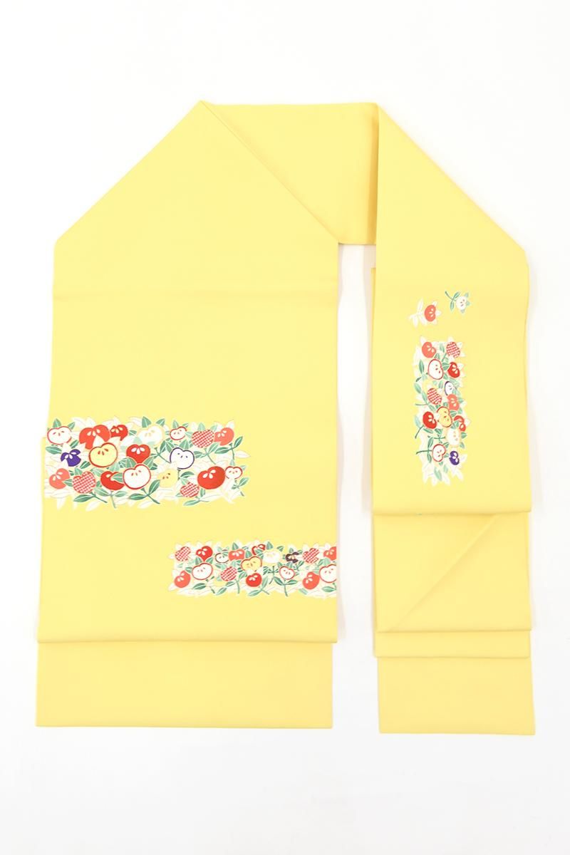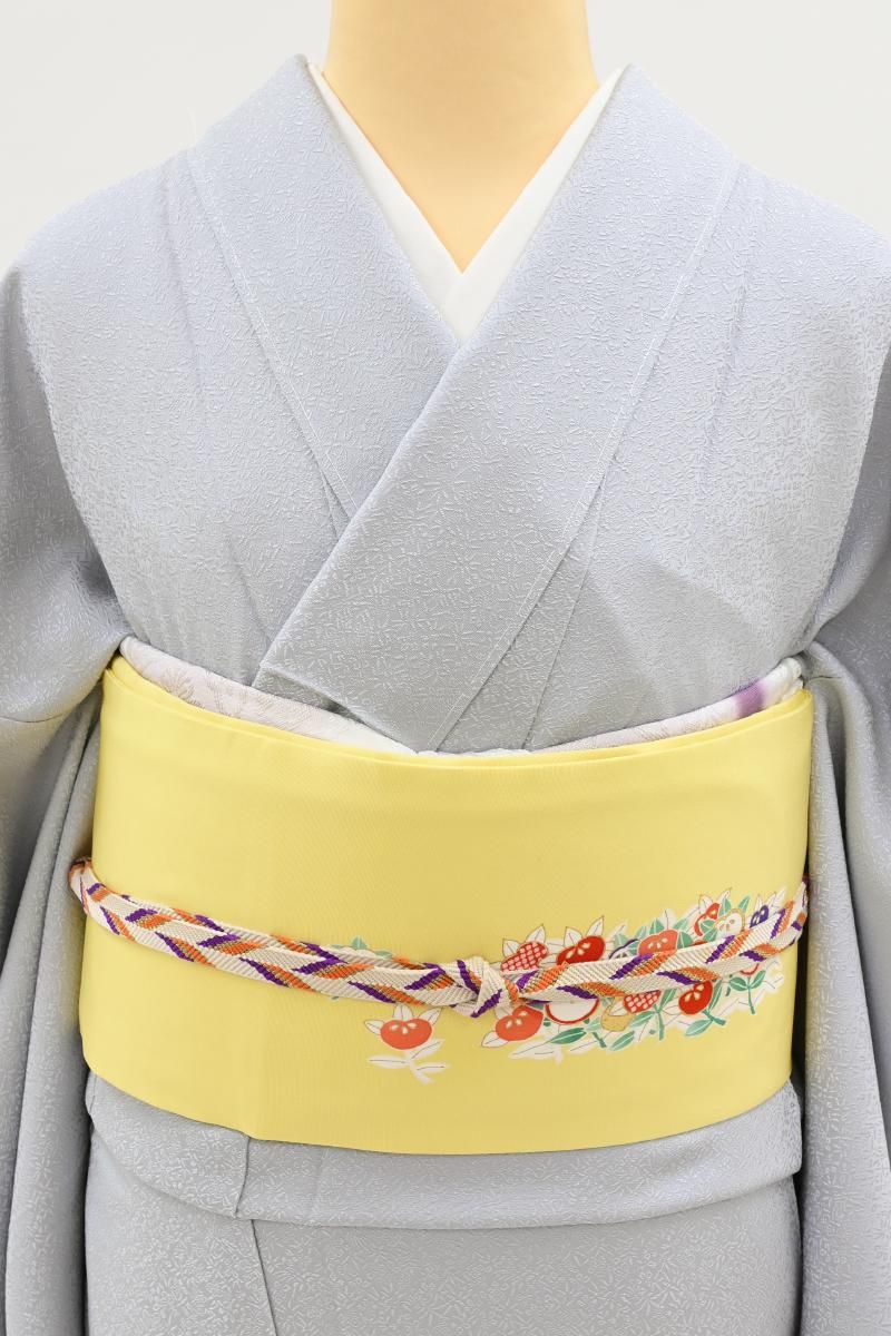 やや色を薄めた黄色が近いでしょうか、明るいレモンイエロー系の塩瀬地に、橘文を配した名古屋帯です。さらりとした地風の爽やかなお色目に、愛らしく並ぶ橘文が鮮やかに映えるお品、金彩の煌めきや刺繍の立体感が一層の華やぎを添え、装いをはんなりと引き立ててくれることと思います。小紋や色無地、江戸小紋などに合わせて、お友達とのお食事会やお出かけなどにいかがでしょうか。