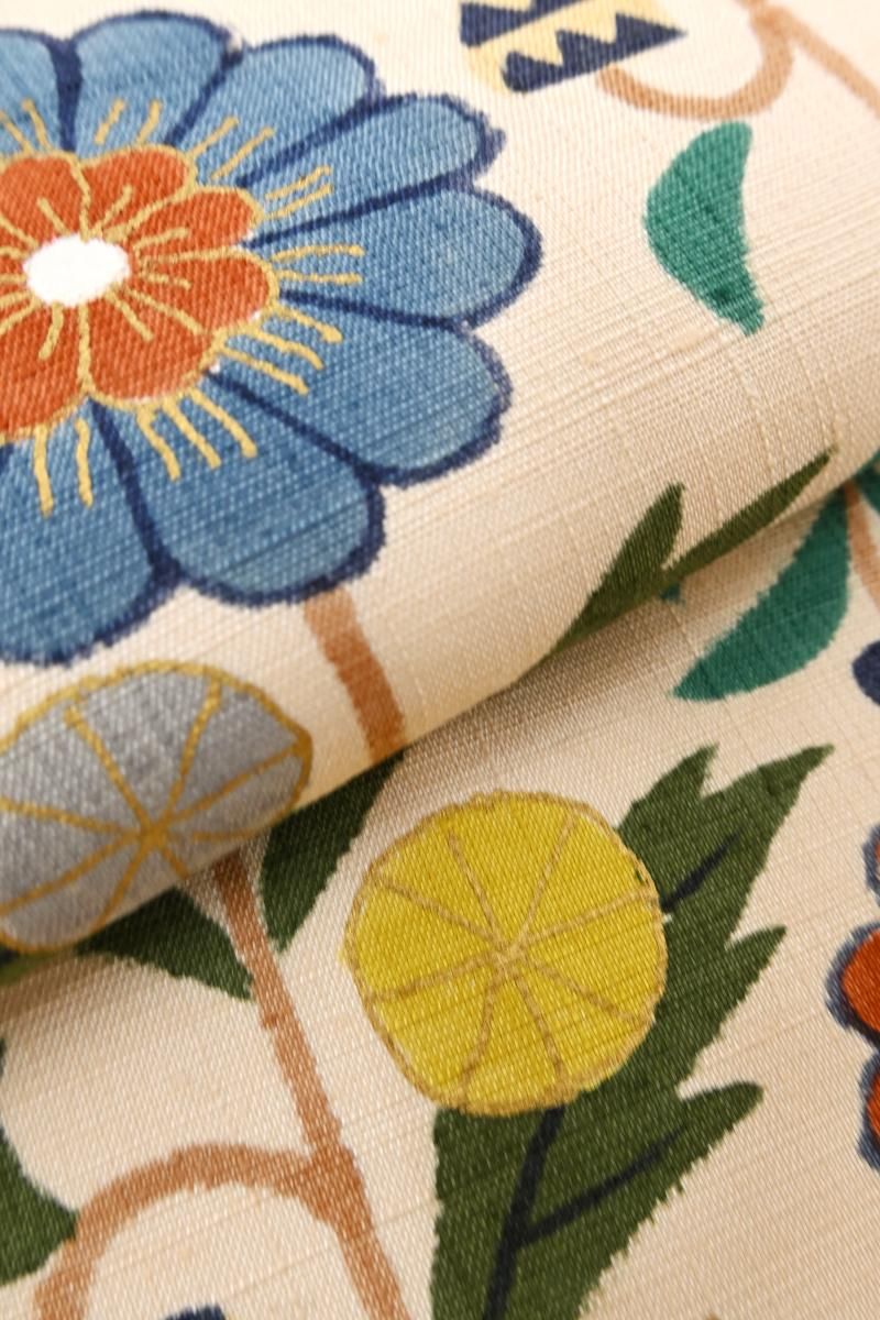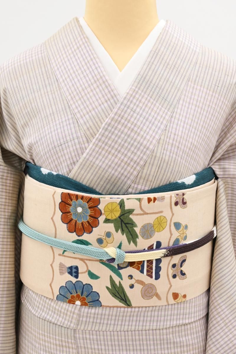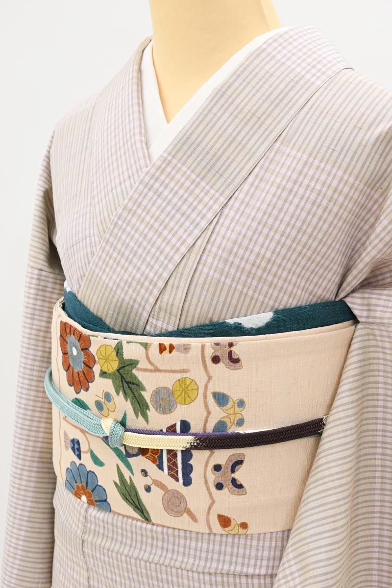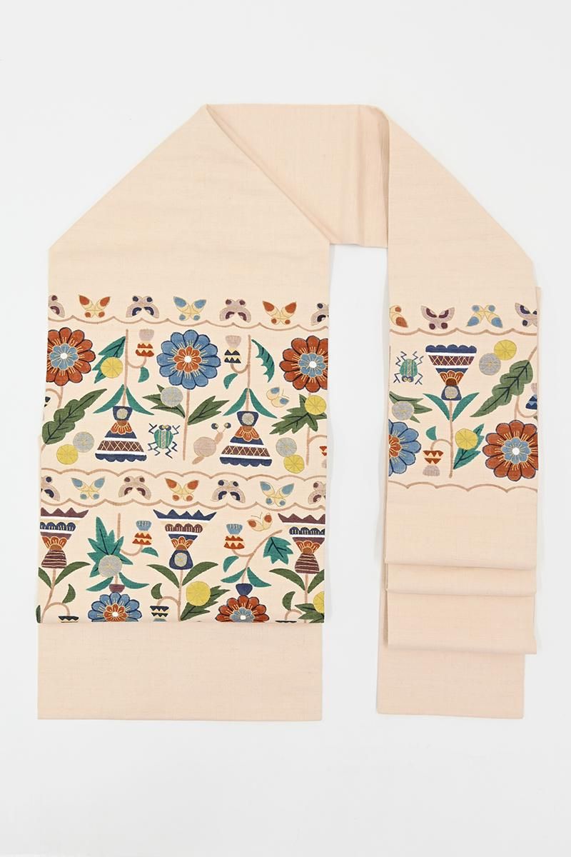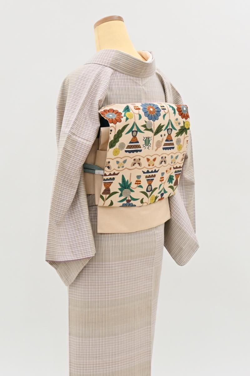 やや色を薄めた赤白橡色が近いでしょうか、淡いベージュの紬地に、花や虫や蝶などを描いた名古屋帯です。ぽつぽつと節の浮かぶやさしいお色目に、カラフルな彩りで描かれた様々なモチーフがなんとも愛らしいお品、遊び心あふれるモチーフはお出かけ先でも楽しい会話の糸口となってくれそうですね。紬や小紋などに合わせて、お友達とのお出かけや趣味の集まりなど様々な場面でお楽しみくださいませ。