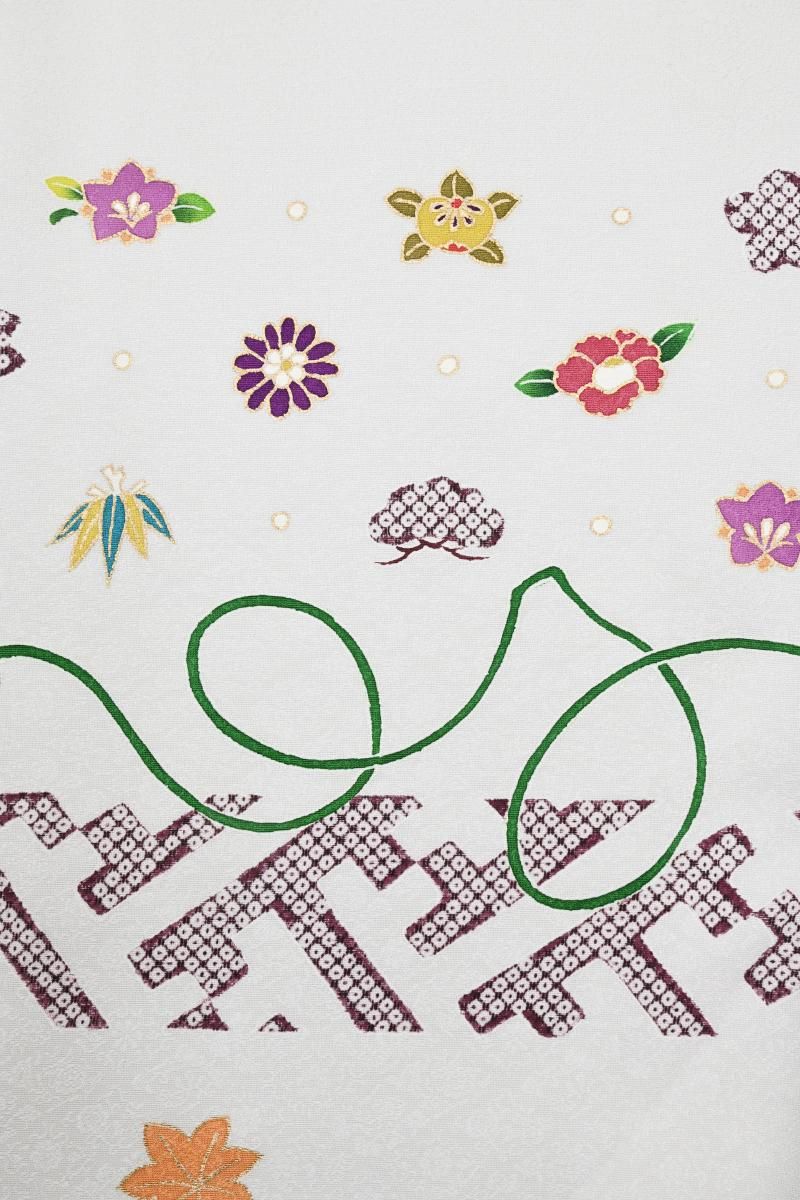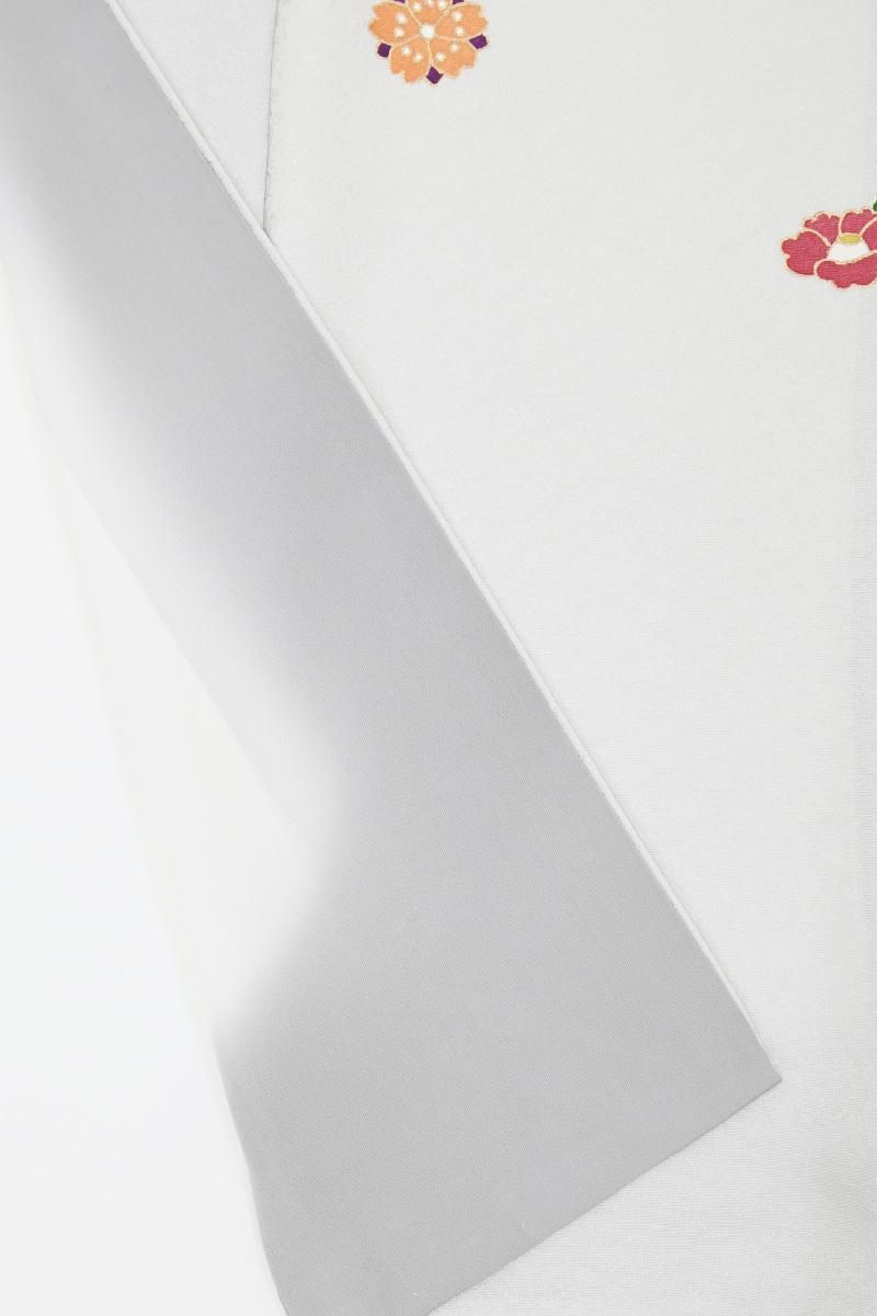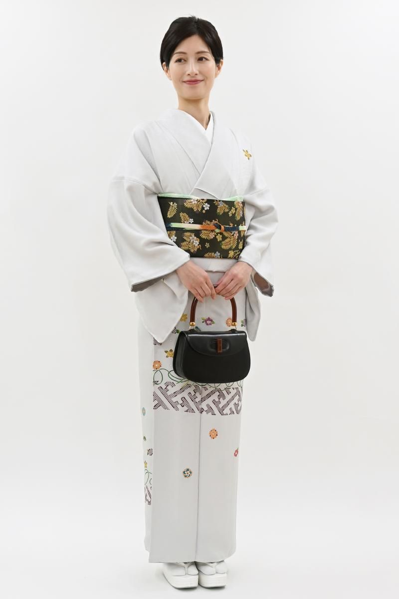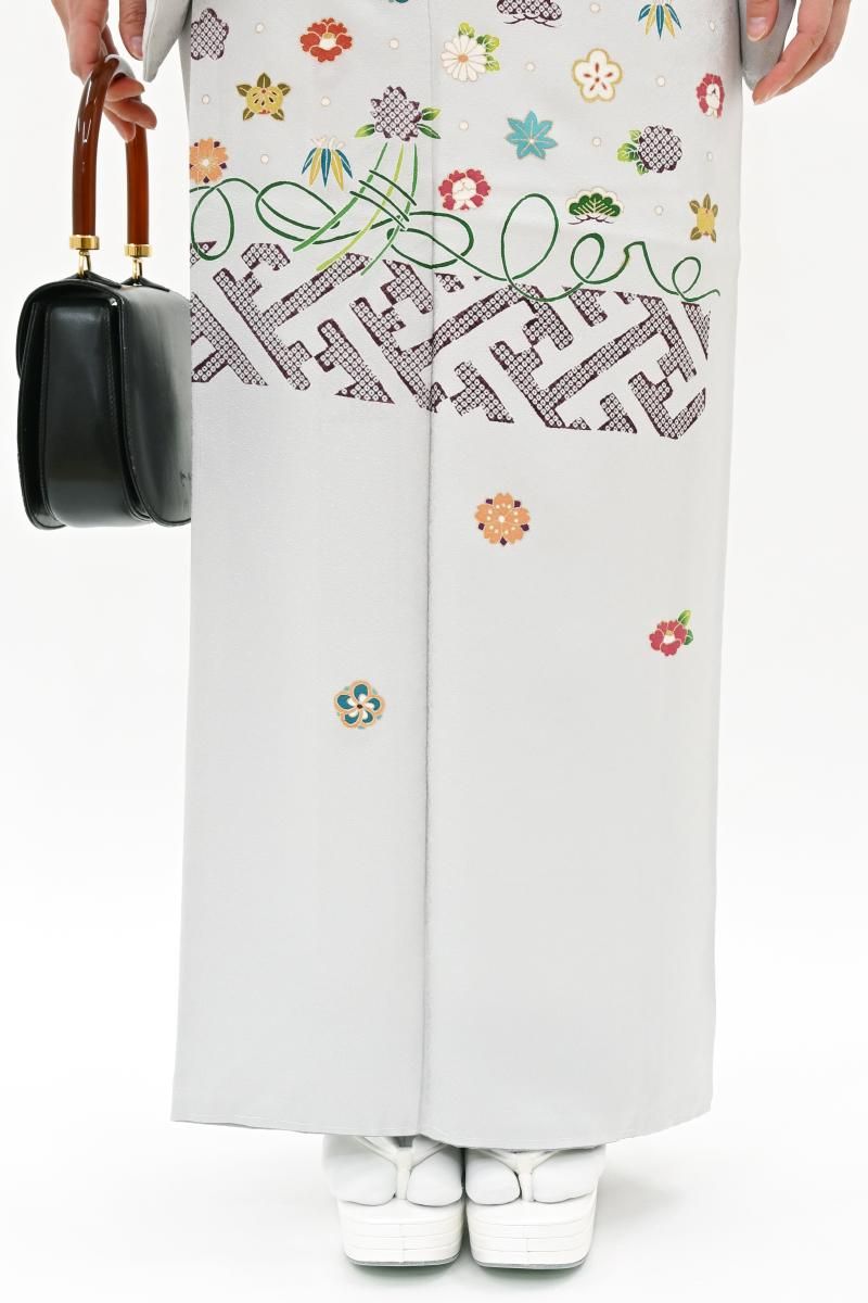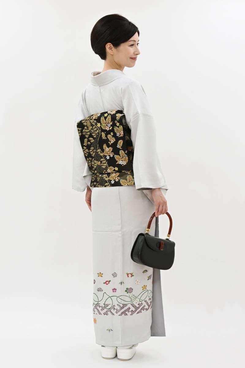 紫水晶色が近いでしょうか、微かに青紫みを含んだごく薄いグレーの地に、菊や松、橘などの四季花や紗綾形などを配した付下げです。光の加減で花唐草の地紋が浮かぶ女性らしいお色目に、品良く置かれた花々が大人の愛らしさを備えたお品、金彩の縁取りがさりげない気品を添えますね。一歩控えた趣の付下げは一枚ご用意いただきますと何かと活躍の機会も多いことと思います。観劇やお食事会、お茶席など少々改まった場面の装いにいかがでしょうか。