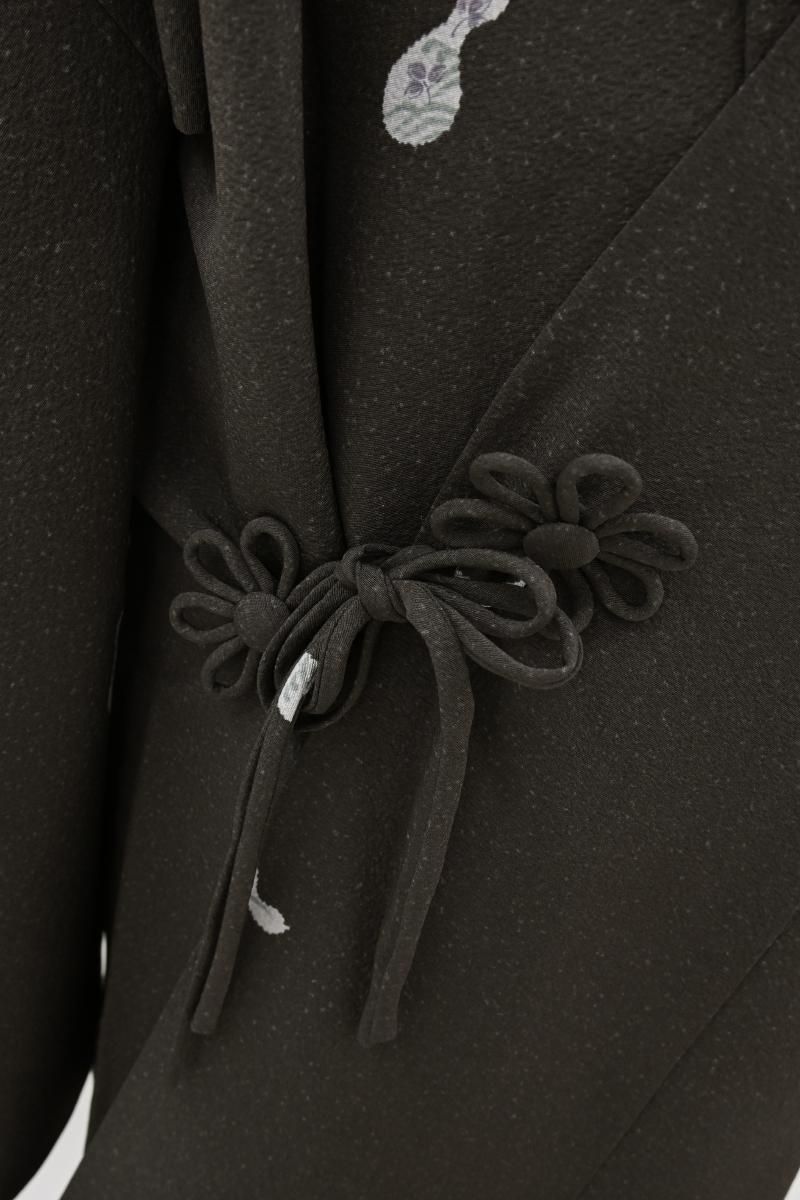消炭色が近いでしょうか、蝋叩きのような文様を配した僅かに赤黄みを含んだ深いグレーの地に、撫子や朝顔などを詰めた瓢箪文を配した道中着です。シックなお色目にぽんぽんと置かれた意匠が装いに大人の洒落味を添えるお品、無地場をとった小ぶりの飛び柄ですので様々な色柄の着物にも合わせやすく、すっきりと装いをまとめあげてくれそうですね。この機会にいかがでしょうか。