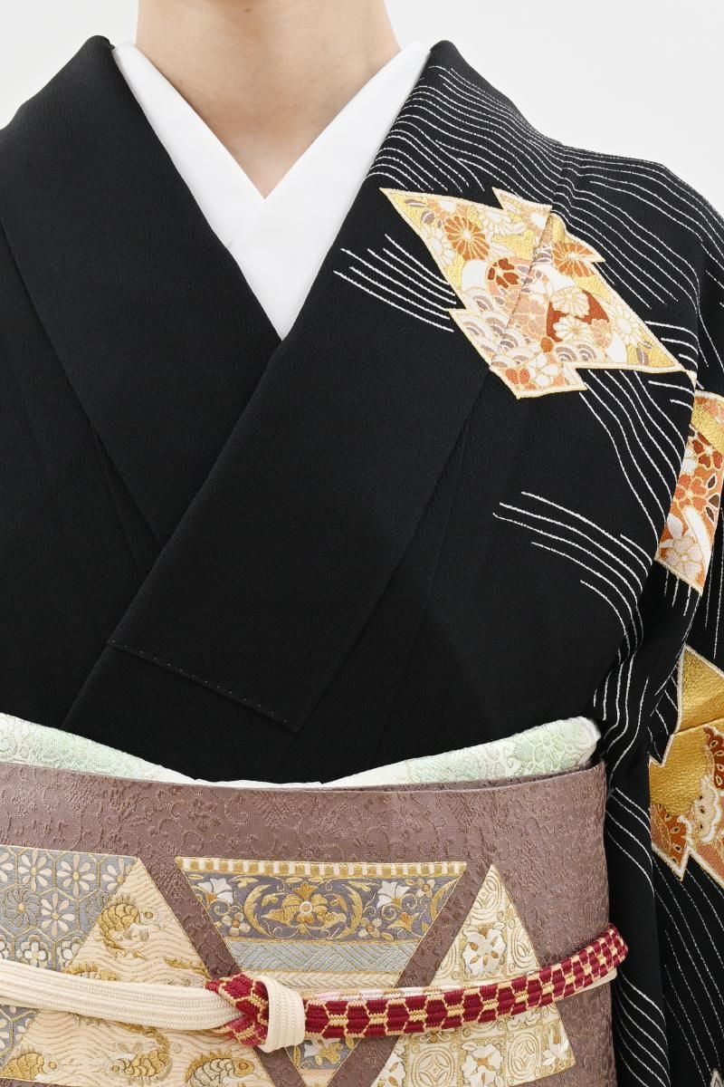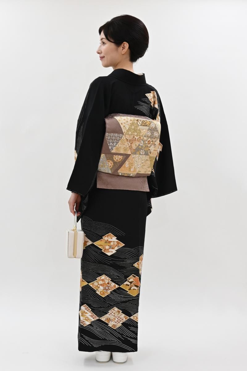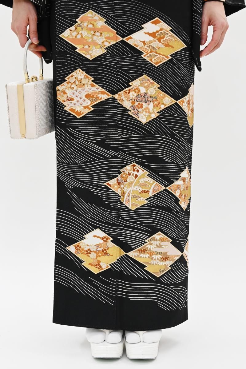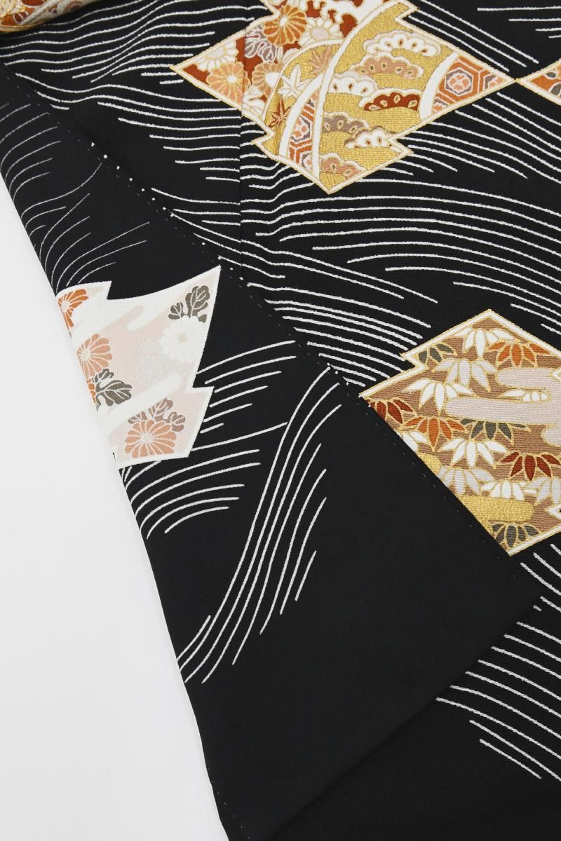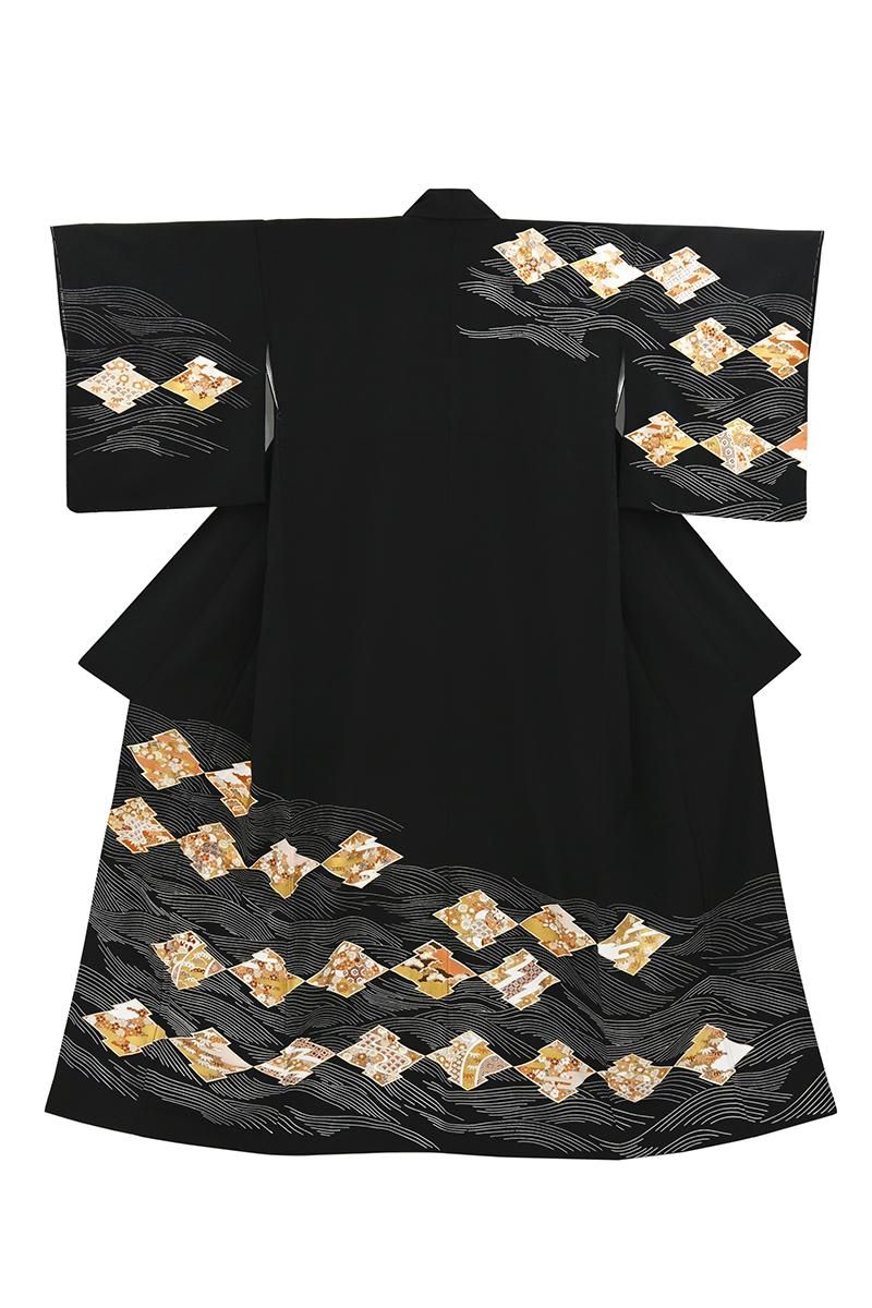 浅いしぼを帯びた黒色の縮緬地に、波を背景に様々な文様を詰めた松皮菱文を描いた訪問着です。