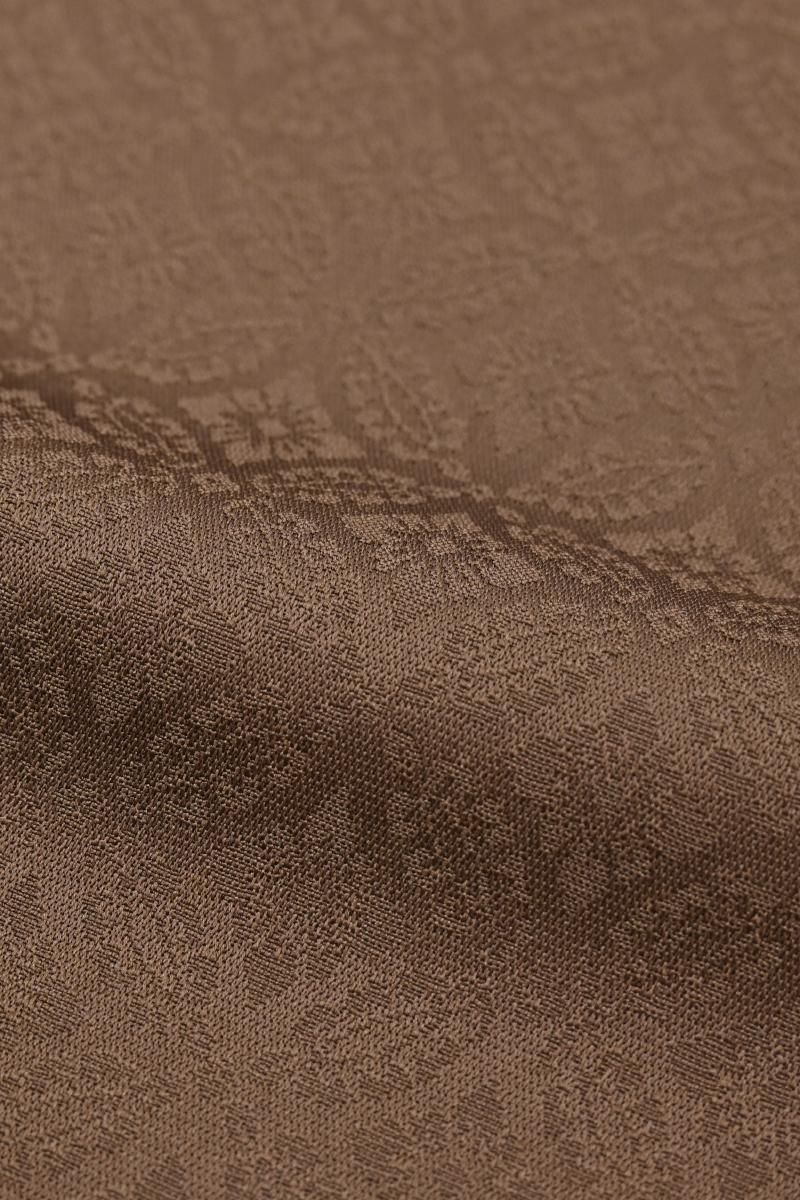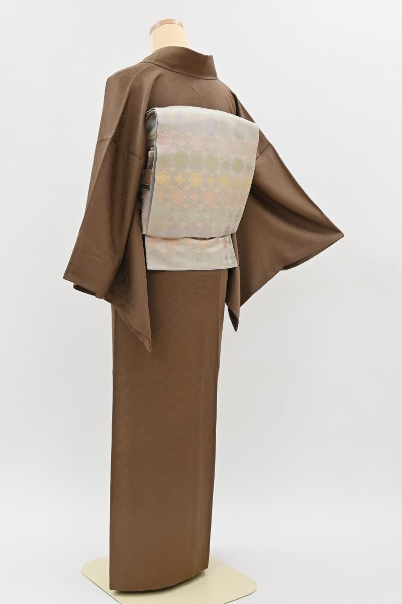 やや色を薄めた鳶色が近いでしょうか、灰がかったまろやかな赤茶色の地に、花七宝の地紋が浮かぶ色無地です。こちらは程よくシックなお色目が着る方の年齢も幅広くお召しいただける一枚、紋は入っておりませんので季節の染め帯から格高の袋帯まで、帯合わせ次第でモダンにも古典的にも、様々な装いをお楽しみ頂けることと思います。お出かけからお茶の席などにいかがでしょうか。