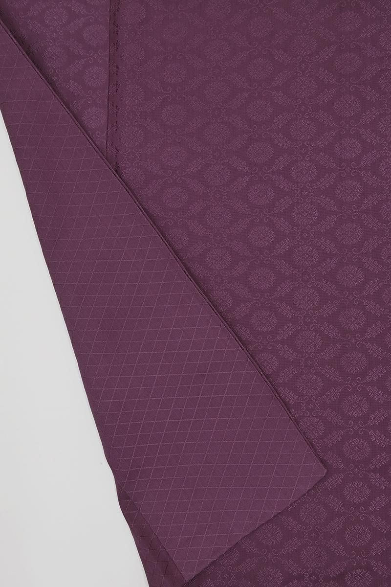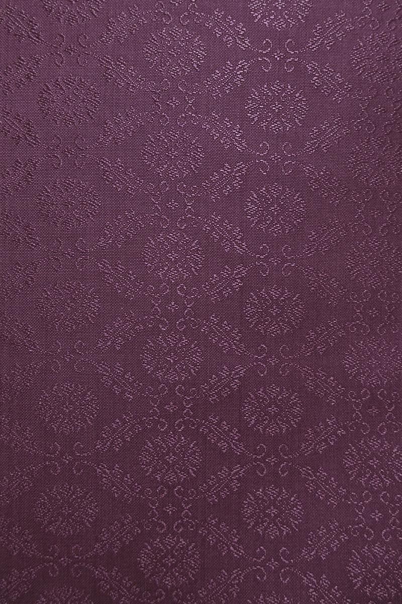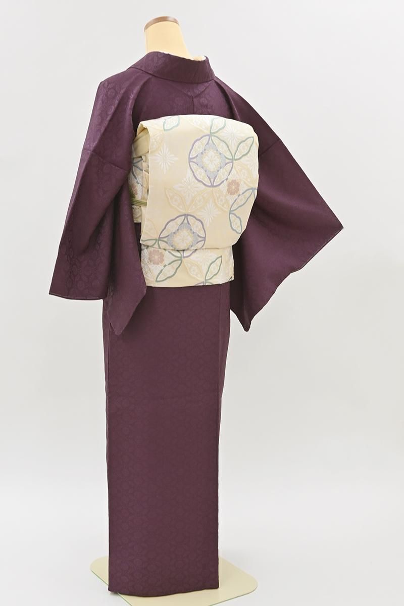 小紫色が近いでしょうか、灰みを含んだ濃い赤紫系の地に、小葵の地紋の浮かぶ色無地です。光彩によって浮かぶ地紋の陰影が華やかな品格を備えたお品、しっとりと落ち着いたお色目はお召しになる方の年齢も幅広く、帯の背景としても万能ですね。紋は入っておりませんので、合わせる帯次第で幅広い場面で重宝にお使いいただけることと思います。季節によって揃えたい色無地、この機会にいかがでしょうか。