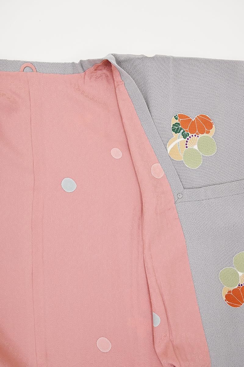 霞色が近いでしょうか、ほのかに赤紫みを含んだ淡いグレーの地に、楓や桜をあしらった梅のモチーフを配した道行コートです。ふっくらとシボを帯びた縮緬地が優しく身体を包み込む一枚、すっきりとしたお色目に色とりどりの愛らしいモチーフがはんなりとした華を添えていますね。防寒や塵除けとしてはもちろん、装いのアクセントとしても活躍してくれることと思います。これからの季節のお出かけに必須のコート、この機会にぜひいかがでしょうか。