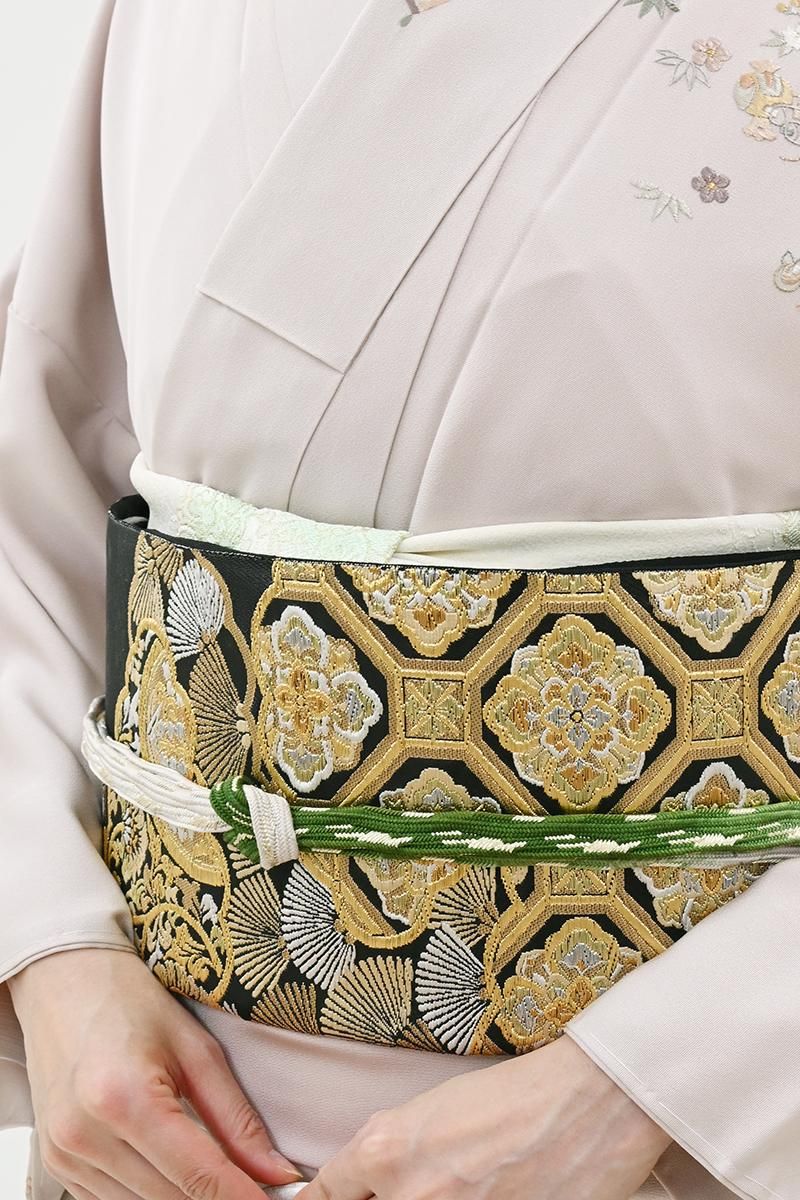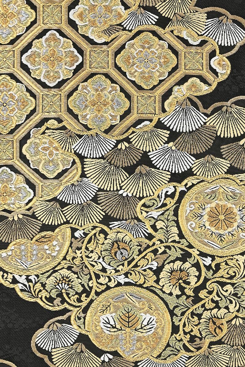 200年以上の歴史を誇る西陣屈指の名門機屋・服部織物さんの袋帯です。こちらは黒に近いごく深いお色目に、金銀糸をふんだんに用いて蜀江華文や花唐草、松葉文などを配したお品、クラシックで重厚なフォーマル帯を得意とするこちらの機屋さんらしい、格調高い一点ですね。どのような場面でも安心してお使い頂ける正統派古典ならではの気品溢れる表情が、装いを凜と引き締めてくれることと思います。色無地から付下げ、訪問着などに合わせ、晴れやかなパーティやお祝いのお席にいかがでしょうか。