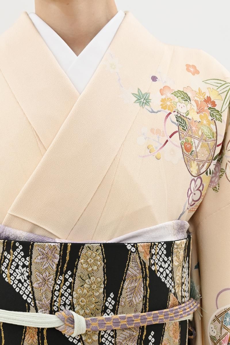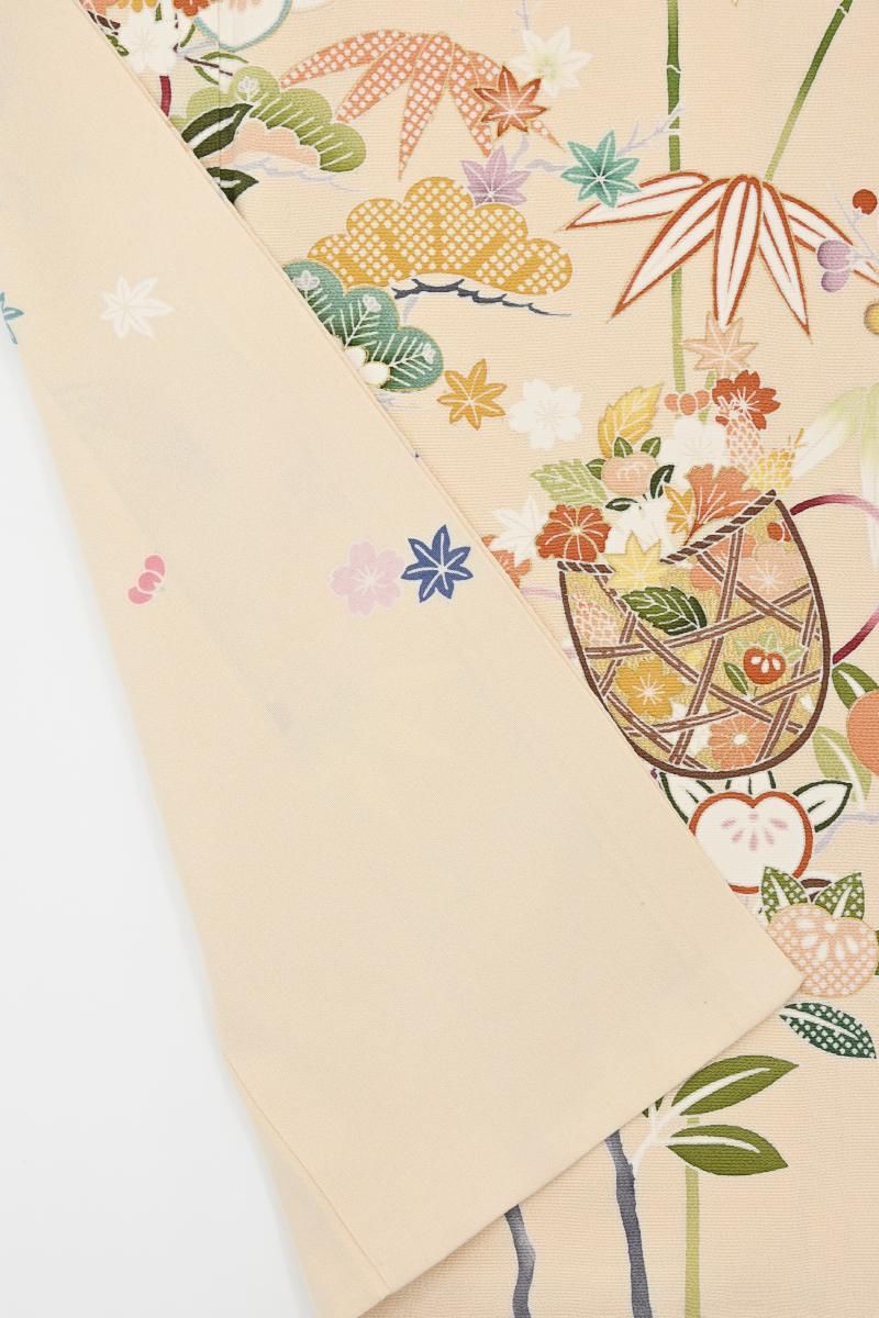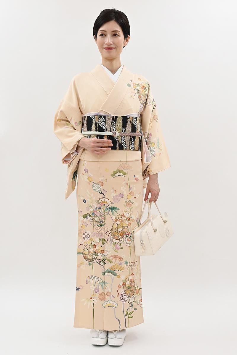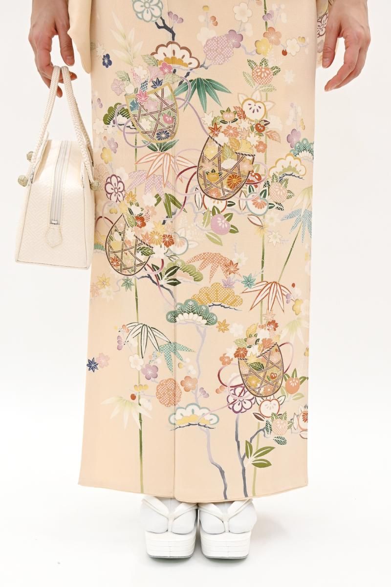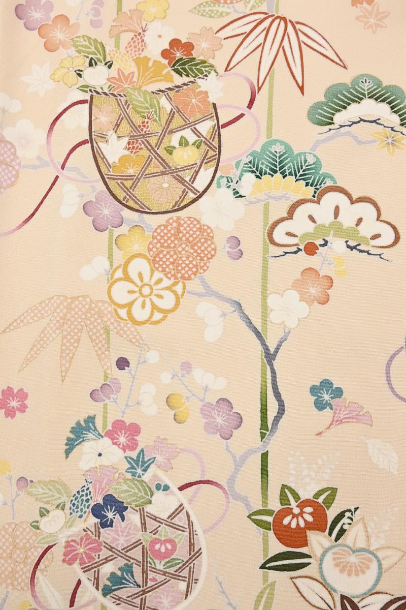 ぐっと色を薄めた赤白橡色が近いでしょうか、ごく淡いサーモンオレンジの地に桜、橘、楓などを入れた花籠や松竹梅の図をいっぱいに配した訪問着です。ふっくらとしぼを帯びた風合いに、色とりどりに表現された意匠が着る人をおっとりとした愛らしさで引き立てるお品、格調と華やかな女性らしさを備えた装いをお楽しみ頂けることと思います。パーティやお祝いのお席などで気品豊かな装いをお楽しみくださいませ。