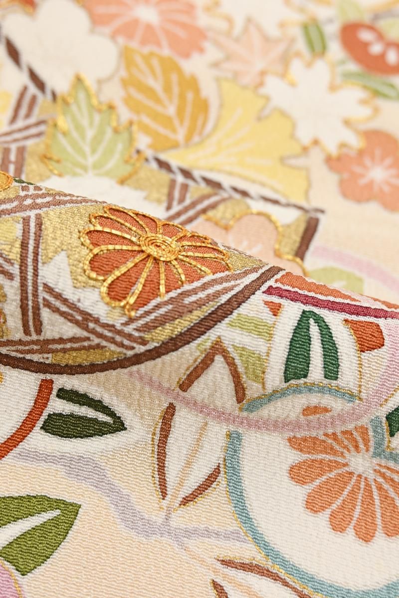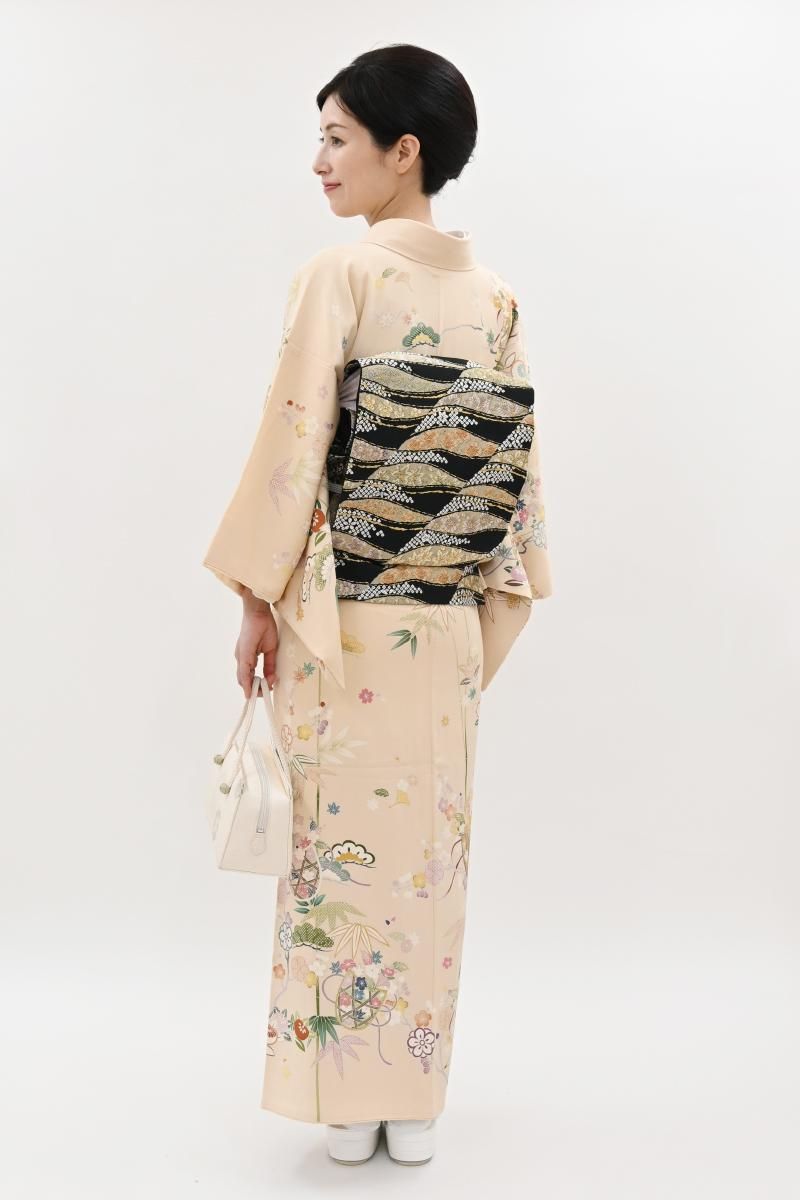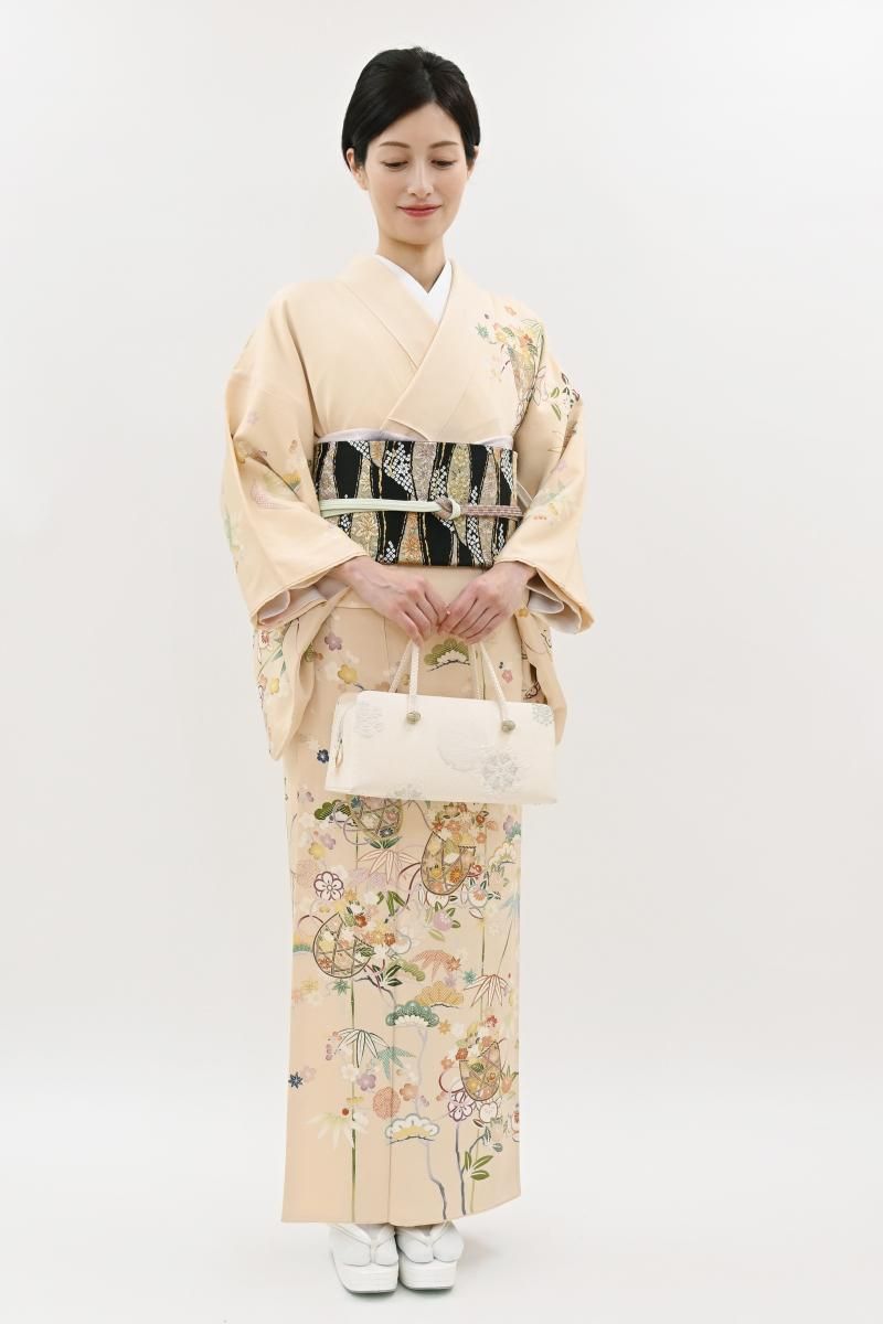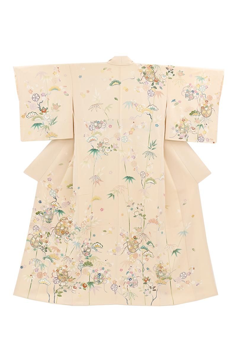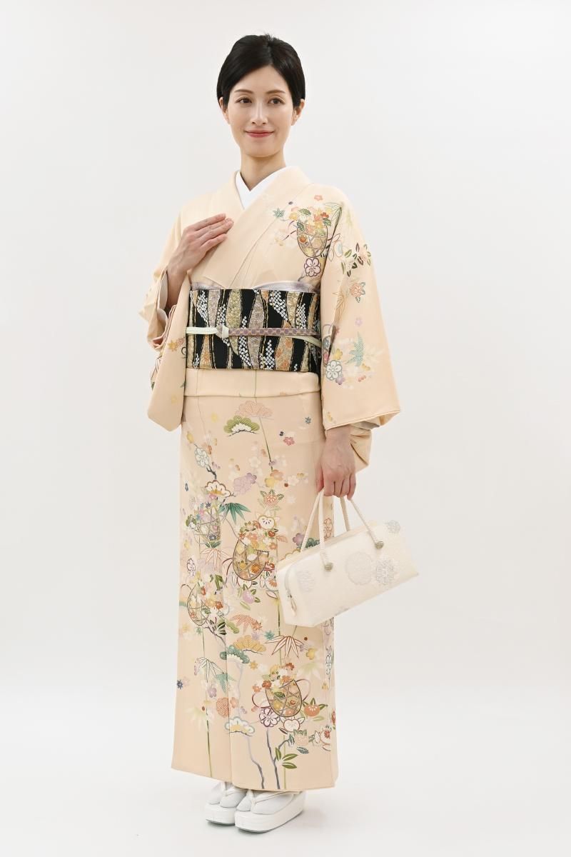ぐっと色を薄めた赤白橡色が近いでしょうか、ごく淡いサーモンオレンジの地に桜、橘、楓などを入れた花籠や松竹梅の図をいっぱいに配した訪問着です。ふっくらとしぼを帯びた風合いに、色とりどりに表現された意匠が着る人をおっとりとした愛らしさで引き立てるお品、格調と華やかな女性らしさを備えた装いをお楽しみ頂けることと思います。パーティやお祝いのお席などで気品豊かな装いをお楽しみくださいませ。