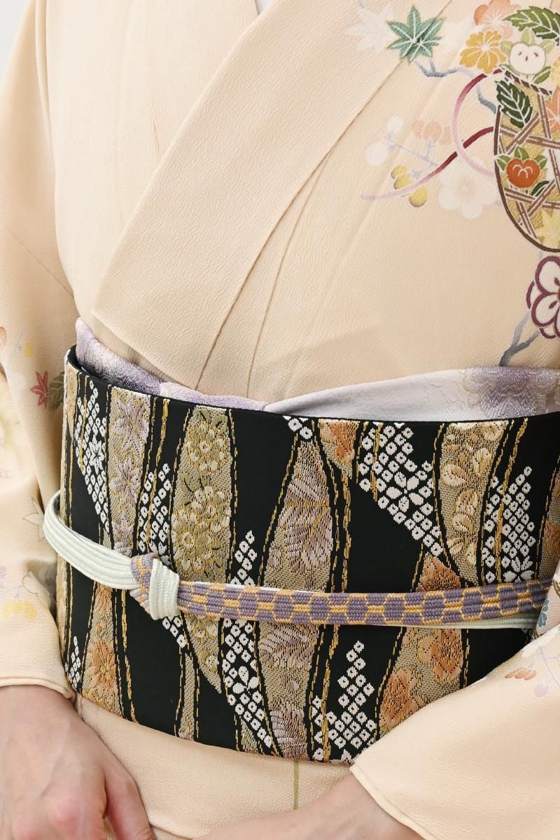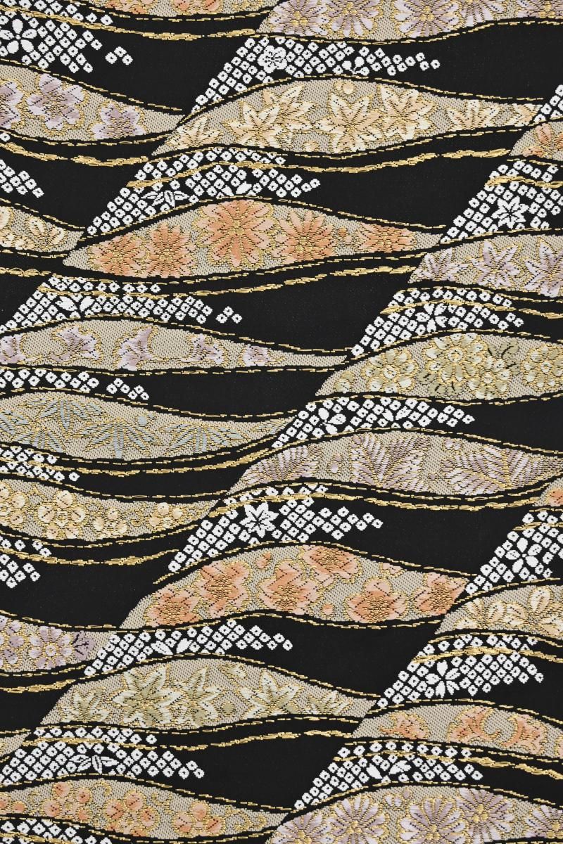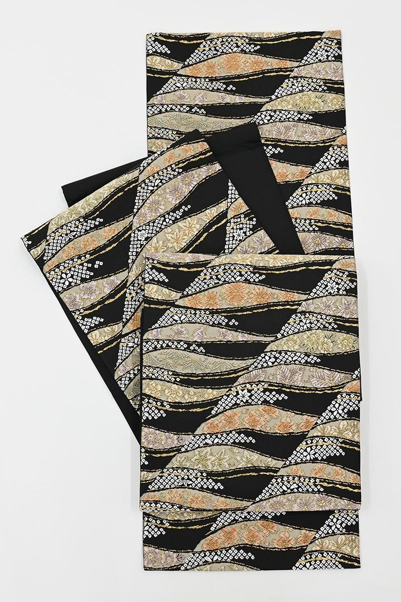 黒色の地に、流線に桜や梅、菊や松葉などの折々の花木や疋田文を織り出した袋帯です。きりりとした黒地を背景に、柔らかな色彩で表現された優美な意匠がはんなりとした景色を創るお品、ベーシックな古典意匠の黒色の帯は幅広いお色目の着物と合わせやすく、一本お持ちいただくと何かと重宝ですね。色無地や付け下げ、訪問着などに合わせて気品豊かな装いをお楽しみくださいませ。