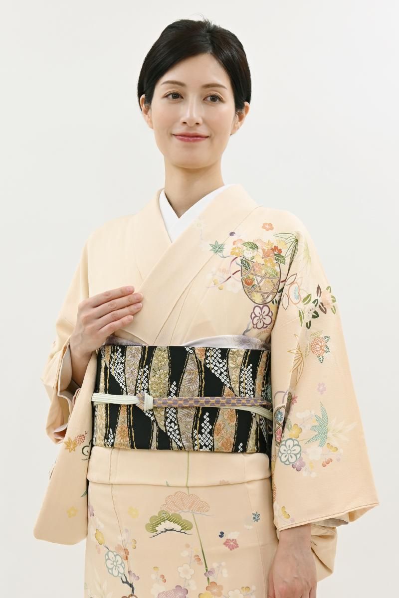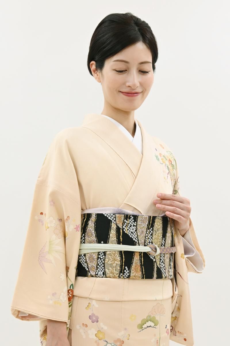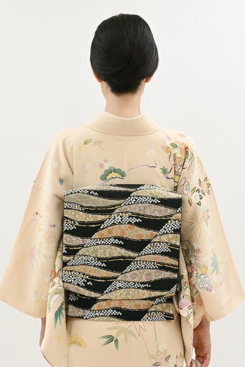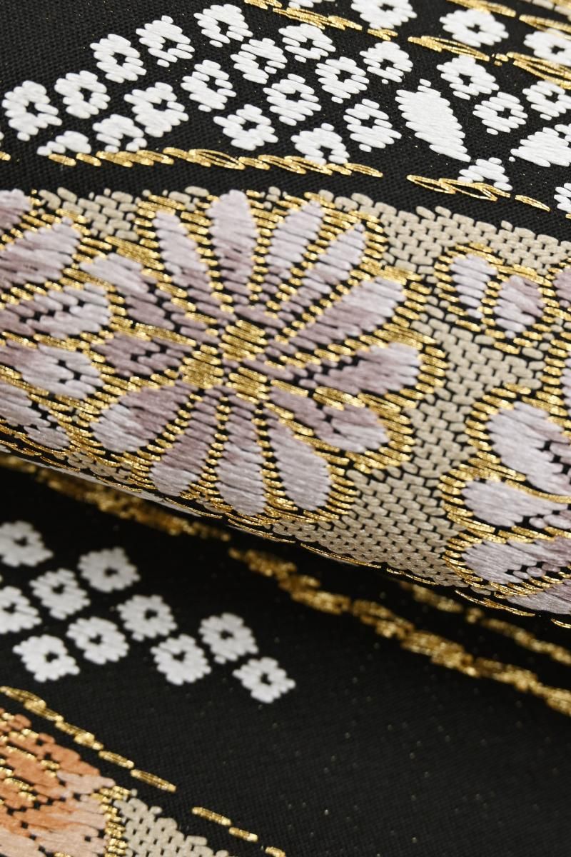 黒色の地に、流線に桜や梅、菊や松葉などの折々の花木や疋田文を織り出した袋帯です。きりりとした黒地を背景に、柔らかな色彩で表現された優美な意匠がはんなりとした景色を創るお品、ベーシックな古典意匠の黒色の帯は幅広いお色目の着物と合わせやすく、一本お持ちいただくと何かと重宝ですね。色無地や付け下げ、訪問着などに合わせて気品豊かな装いをお楽しみくださいませ。
