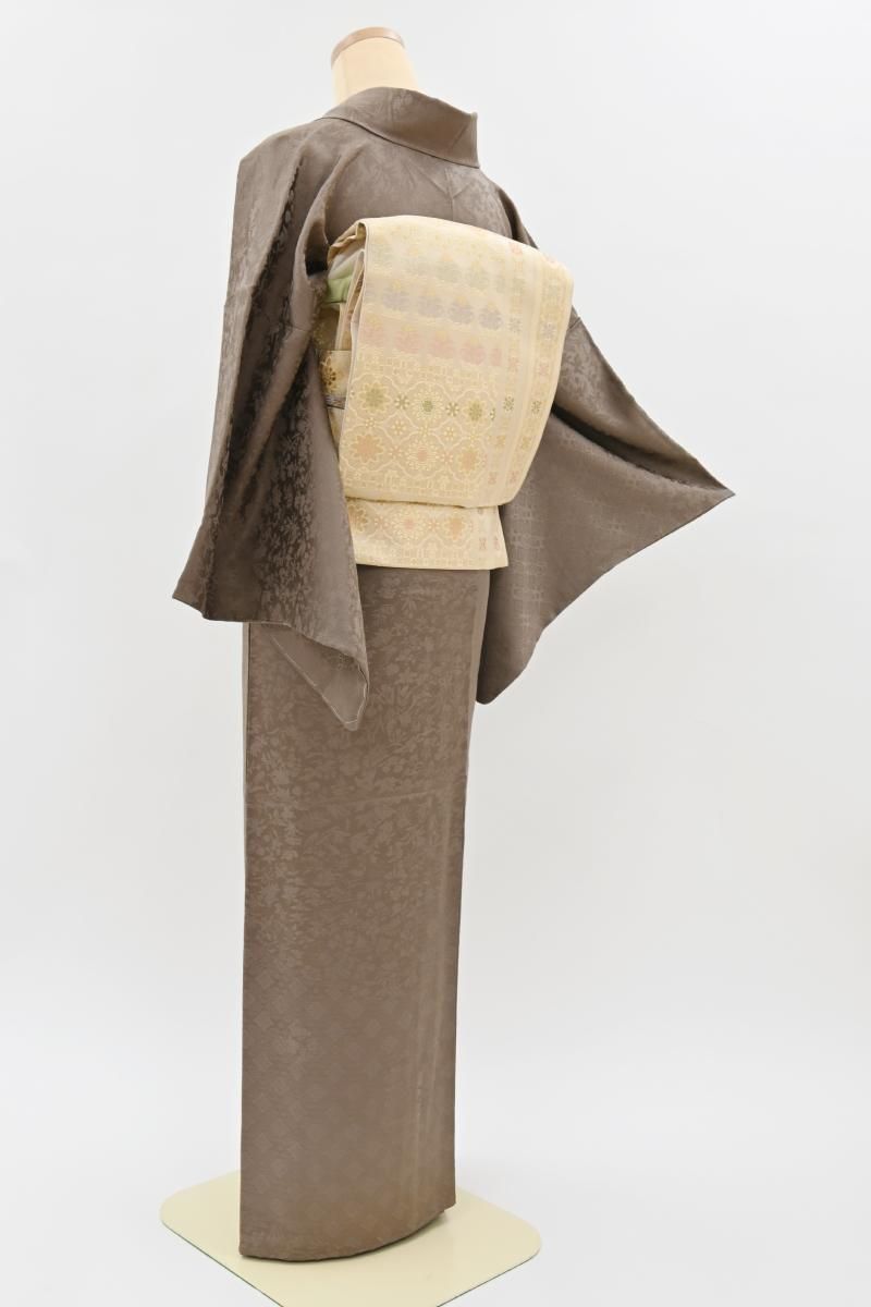 煤竹色が近いでしょうか、灰赤みがかったまろやかな薄茶色の地に、有職文や花の地紋の浮かぶ色無地です。穏やかな光沢を帯びた落ち着いたお色目に、光の加減で浮かぶ古典意匠が品格ある景色を創るお品、紋は入っておりませんので合わせる帯次第でちょっとしたお出かけから少し改まったお席など幅広い場面でご活用いただけることと思います。季節に合わせて用意したい色無地、この機会にシックな一枚をいかがでしょうか。