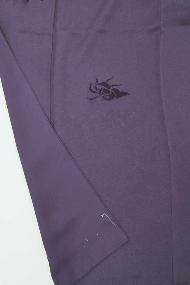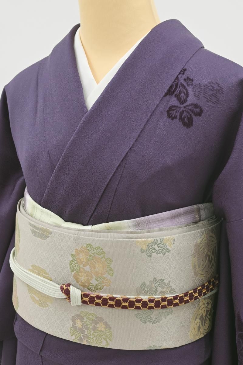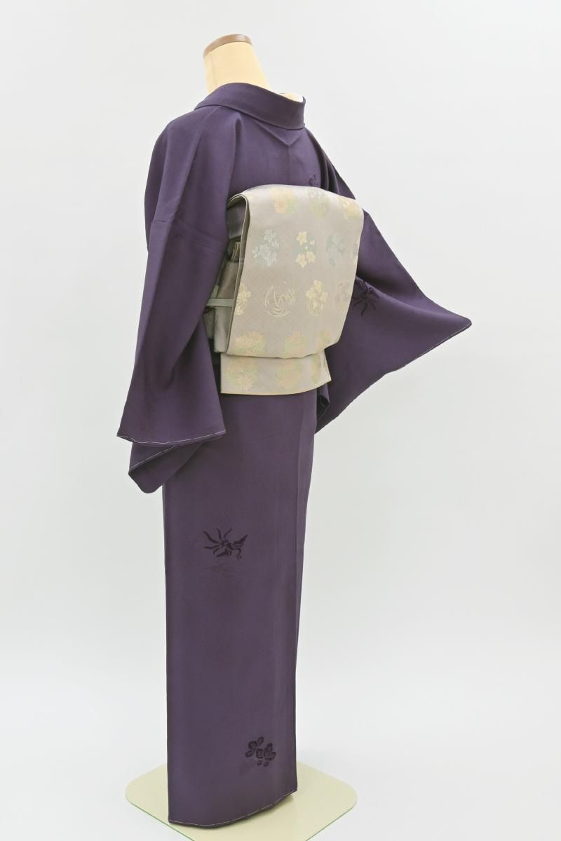 濃色が近いでしょうか、ごく深い紫色の地に、切ビロードで表現された桐竹鳳凰文がふっくらと浮かび上がる色無地です。 こちらは深くシックなお色目がエレガントな表情のお品、陰影豊かな景色がさりげない洒落味と存在感を見せていますね。ドレッシーな染め帯や洒落味のある袋帯など、合わせる帯次第で様々な場面にお楽しみ頂けることと思います。 この機会にいかがでしょうか。