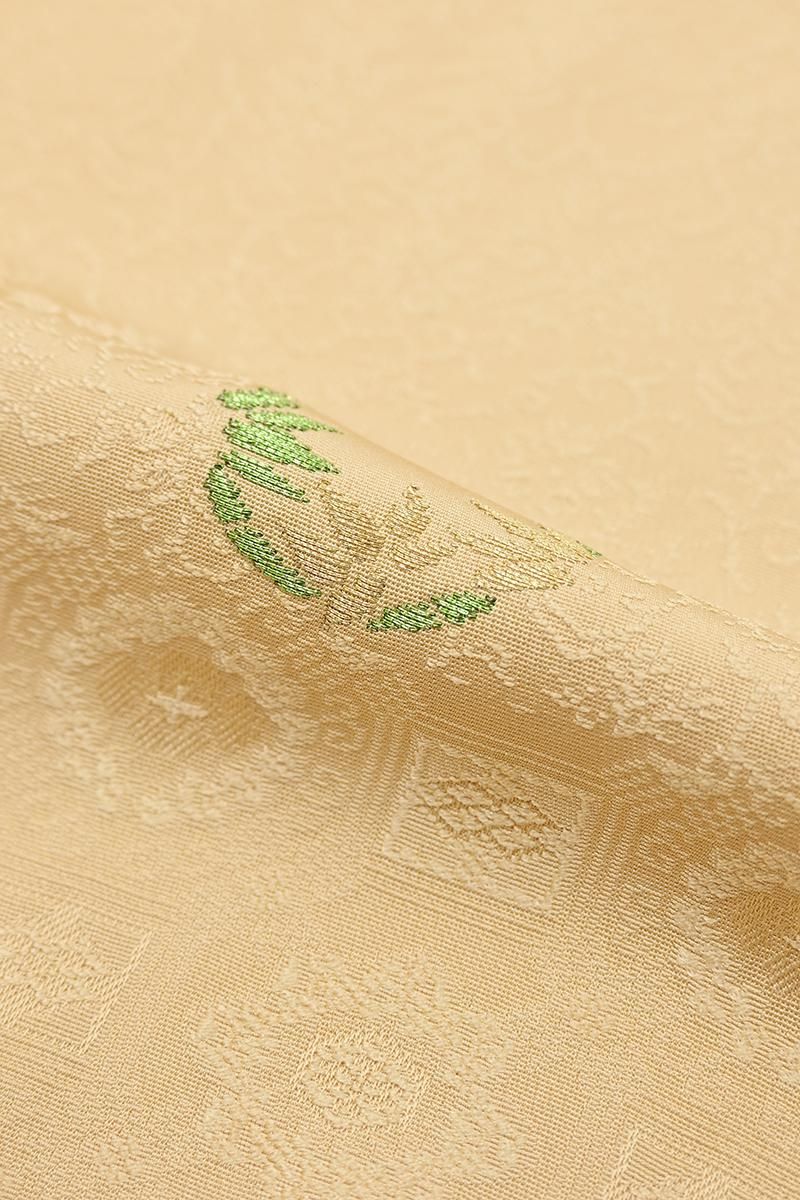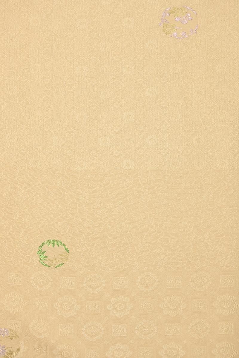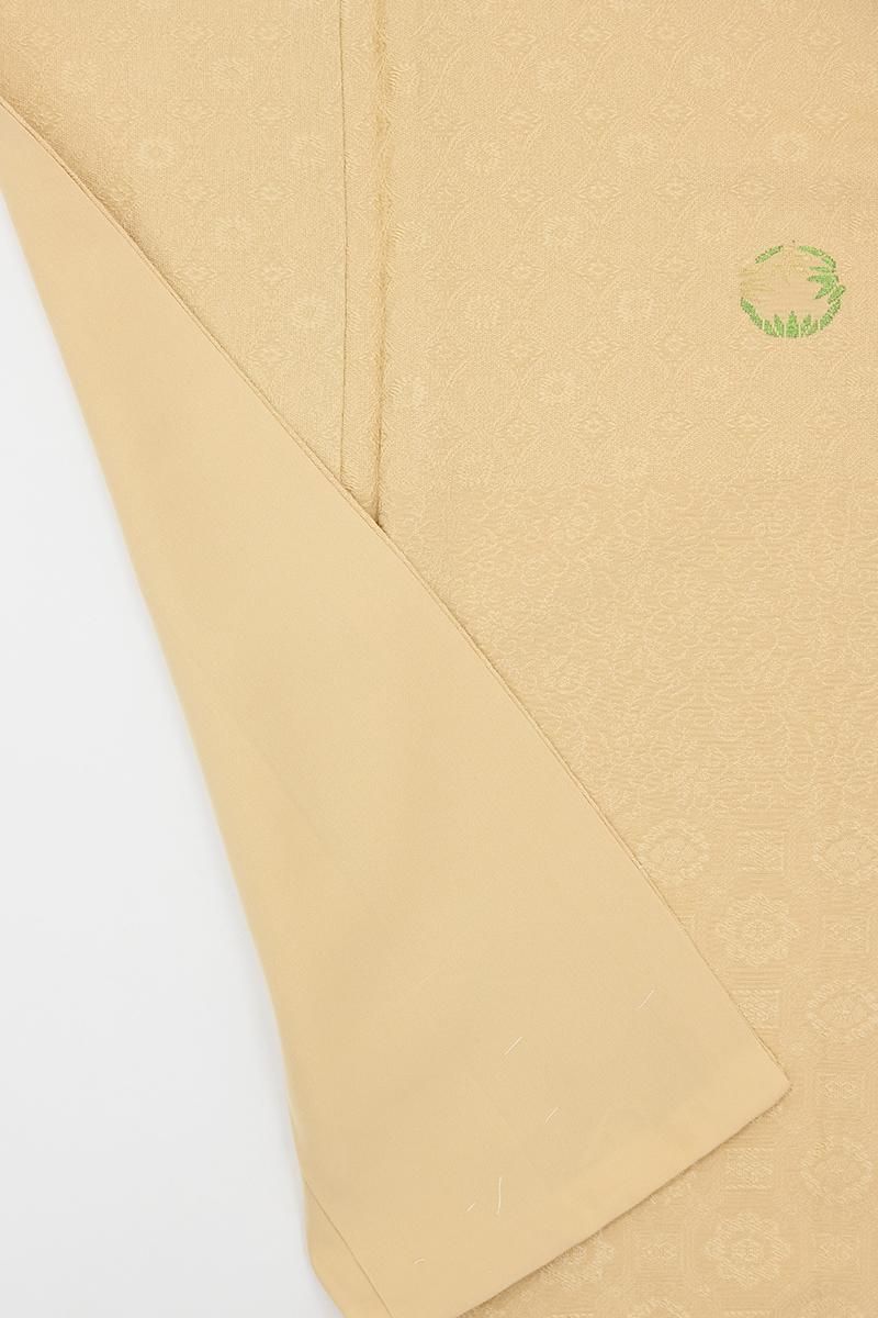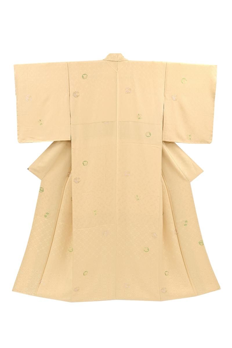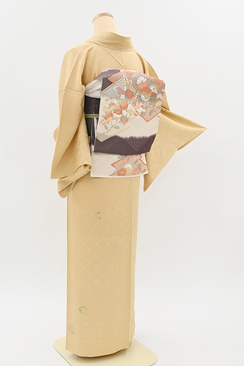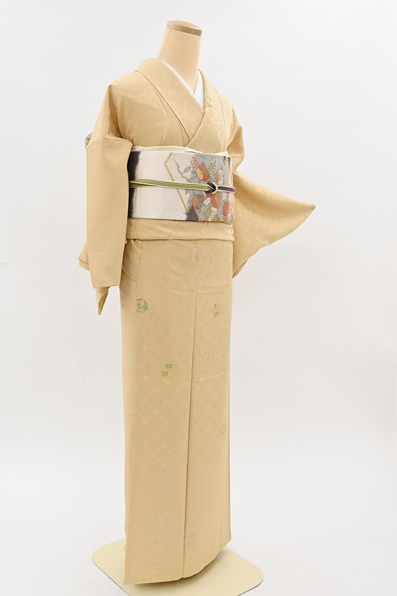 やや明度を上げた丁子染色が近いでしょうか、温かみのあるオレンジみのベージュ地に、四季花の丸をラメ糸で表現した小紋です。光の加減で浮かぶ様々な地紋が上品な華やぎを備えたお品、無地感覚のシンプルな色柄ですので、季節の染め帯や織の名古屋帯、軽めの袋帯など帯合わせも様々に、洗練された装いをお楽しみいただけることと思います。この機会にいかがでしょうか。