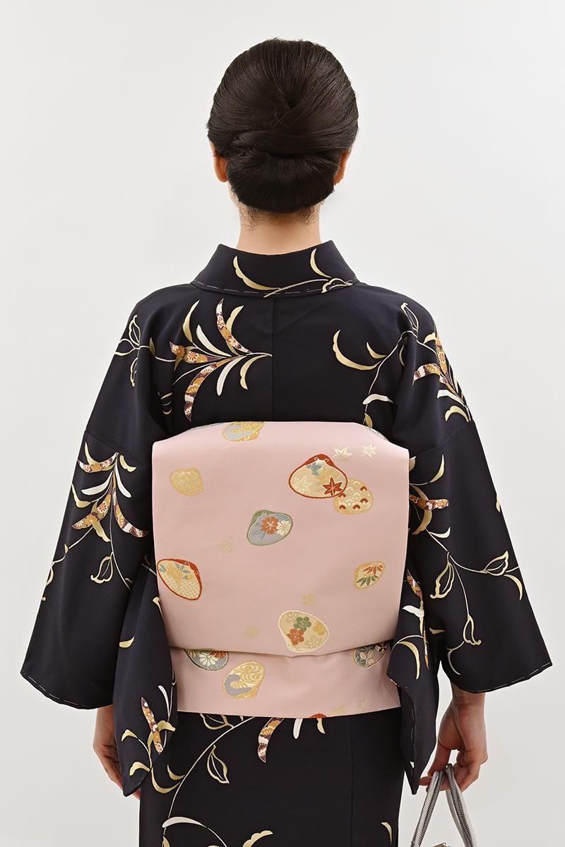 聴色が近いでしょうか、わずかに灰みを含んだピンク色の地に、貝合わせ文を織り出した名古屋帯です。しなやかな地風のやさしいお色目に、雅な古典意匠が上品な甘さを漂わせるお品、装いをはんなりと女性らしく引き立ててくれることと思います。お正月などにも活躍してくれそうな一本、小紋や色無地、付下げなどに合わせて改まったお席の装いにいかがでしょうか。