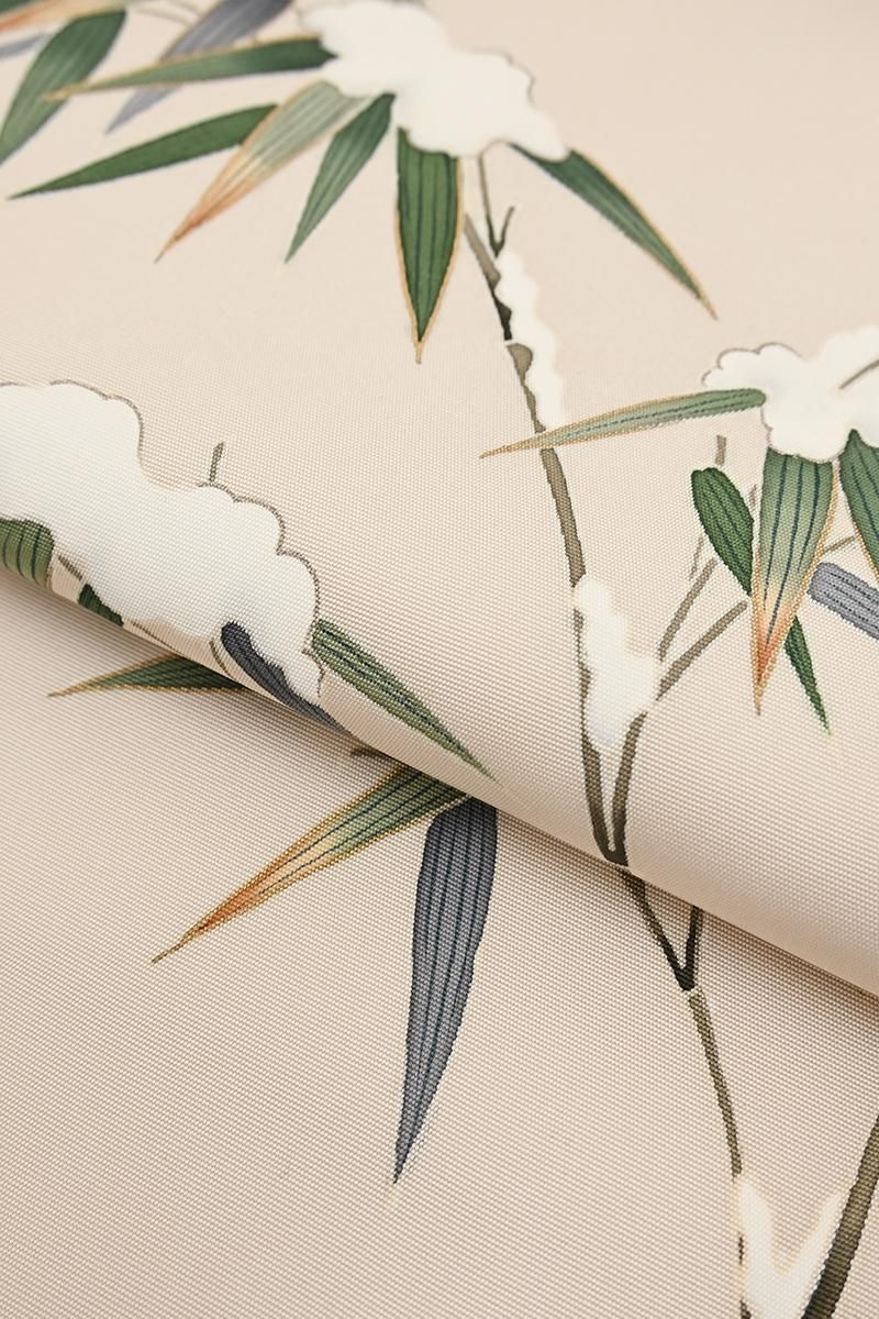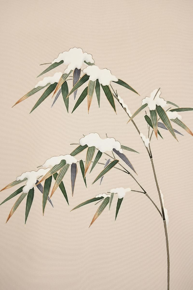 色を薄めた白茶色が近いでしょうか、灰みの淡いベージュの塩瀬地に、雪持ち笹の図を配した名古屋帯です。静かに舞い降りるぼたん雪が少しずつ葉に降り積もってゆく景色が冬らしい風情を運ぶお品、後ろ姿をしっとりと引き立ててくれることと思います。装いに季節を呼び込む帯は、やはり四季折々に合わせて取り揃えたいもの。紬や小紋などの装いに合わせて、季節を感じる装いをお楽しみくださいませ。
