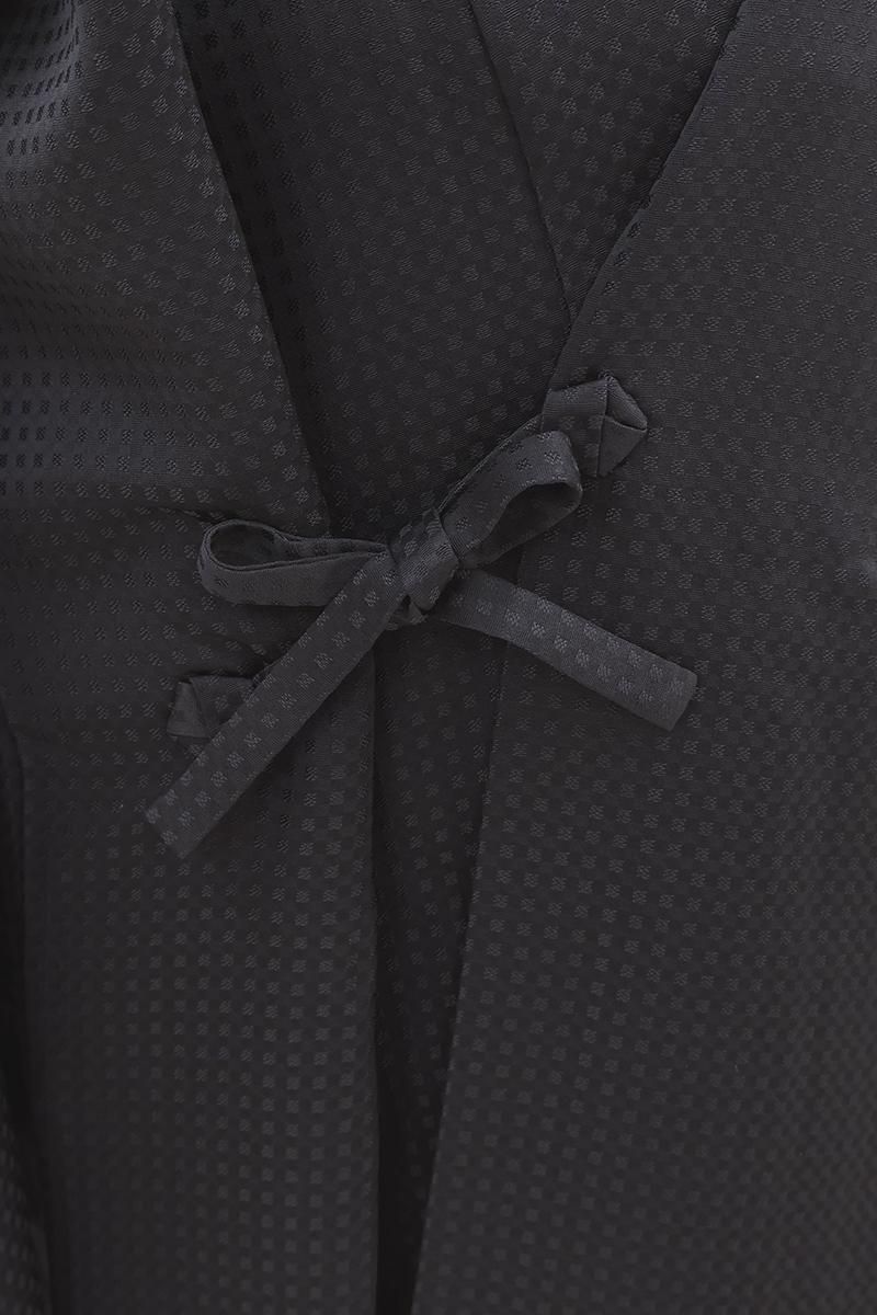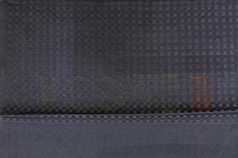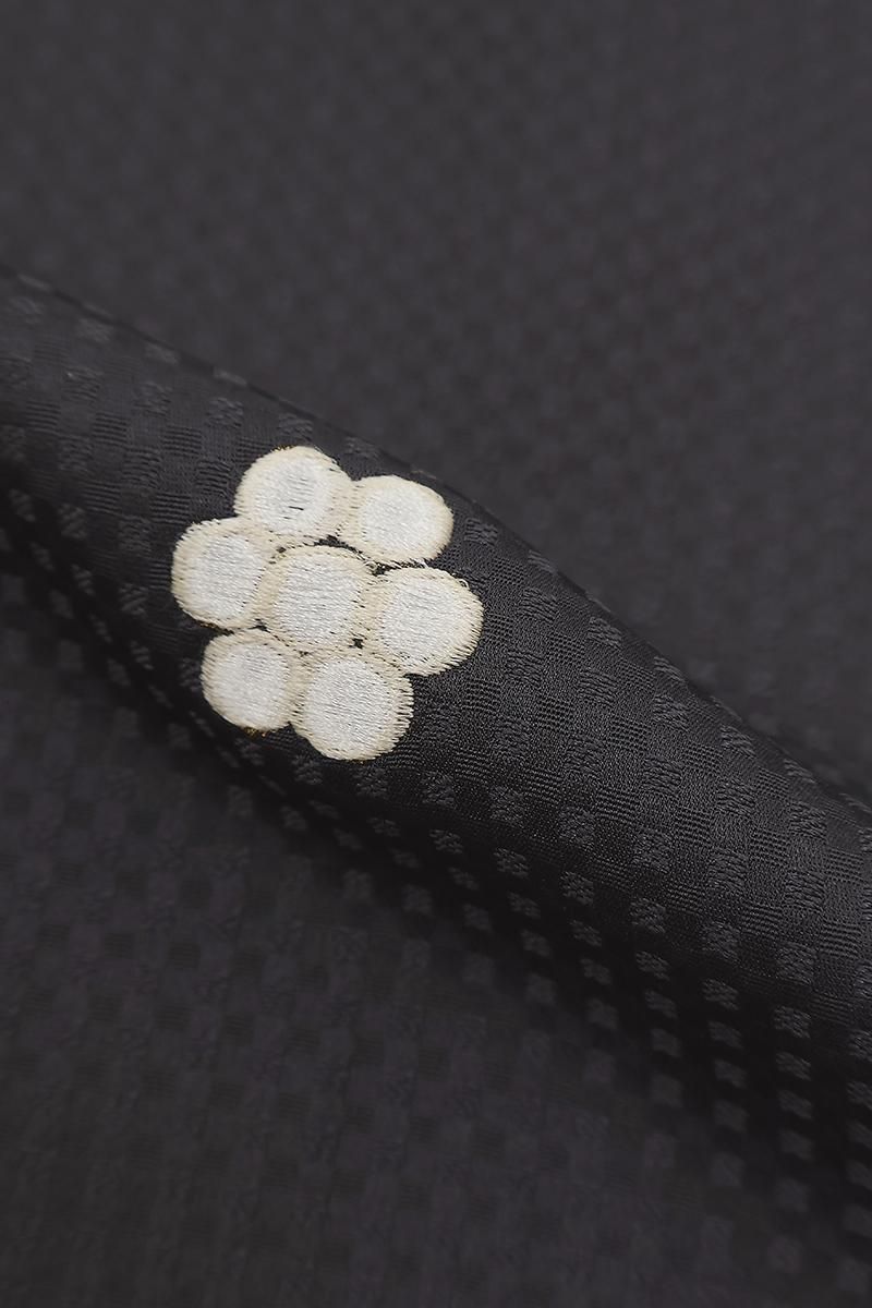 薄黒色が近いでしょうか、小さな四角の地紋が浮かぶごく深いグレーの地に、金彩や刺繍で七曜文を配した道中着です。程よく光沢のあるきりりとシックなお色目に、品良く散らされた意匠が洗練された印象のお品、モダンな雰囲気で装いを引き立ててくれることと思います。防寒や塵除けとして、また装いのアクセントとしてもお楽しみいただける道中着、この機会にいかがでしょうか。