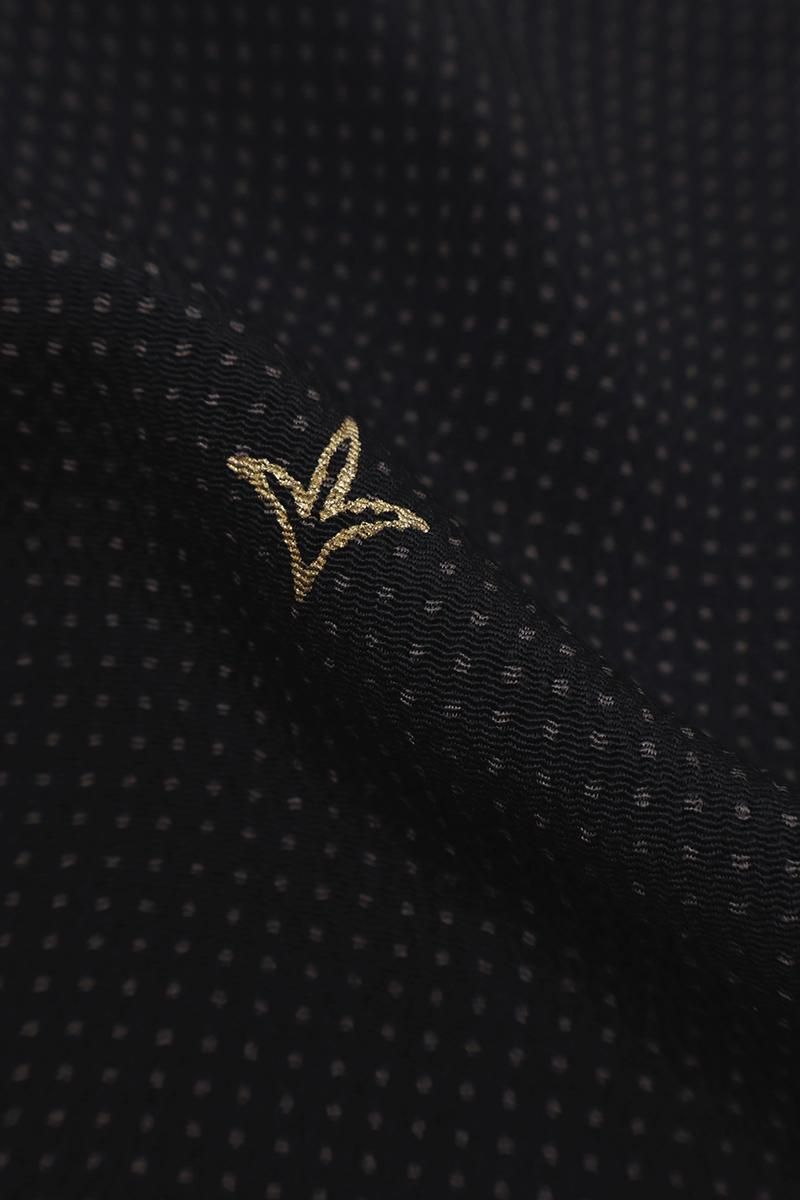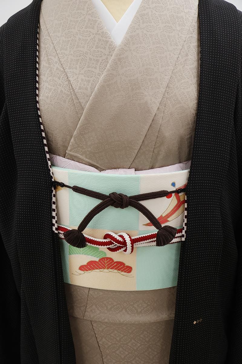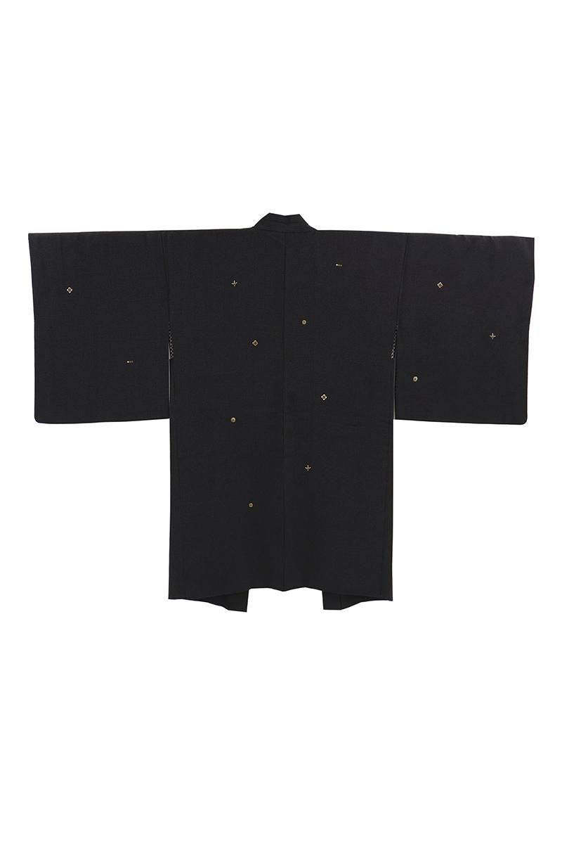 全体の印象としては憲法黒茶色が近いでしょうか、チャコールグレーの細かなドットを並べた黒色の地に、小さな菱や丸などの意匠を散らした羽織です。細かなシボを帯びた縮緬が優しく身体を包み込むお品、シックな彩りにさりげない金彩の輝きが気品を添えていますね。こちらは上質で都会的なスタイルの提案で良く知られる青山八木さんの扱い。様々なお色目の着物に合わせやすい洗練された一枚を、この機会にぜひいかがでしょうか。