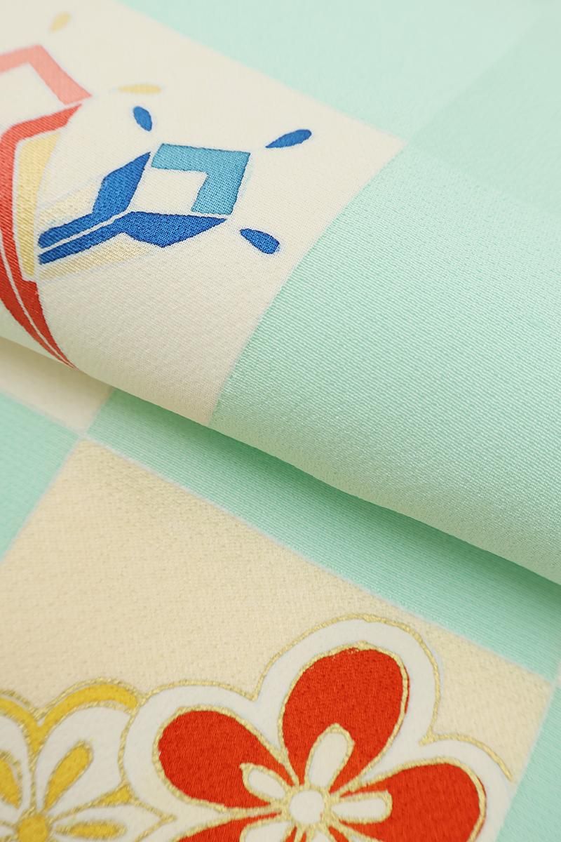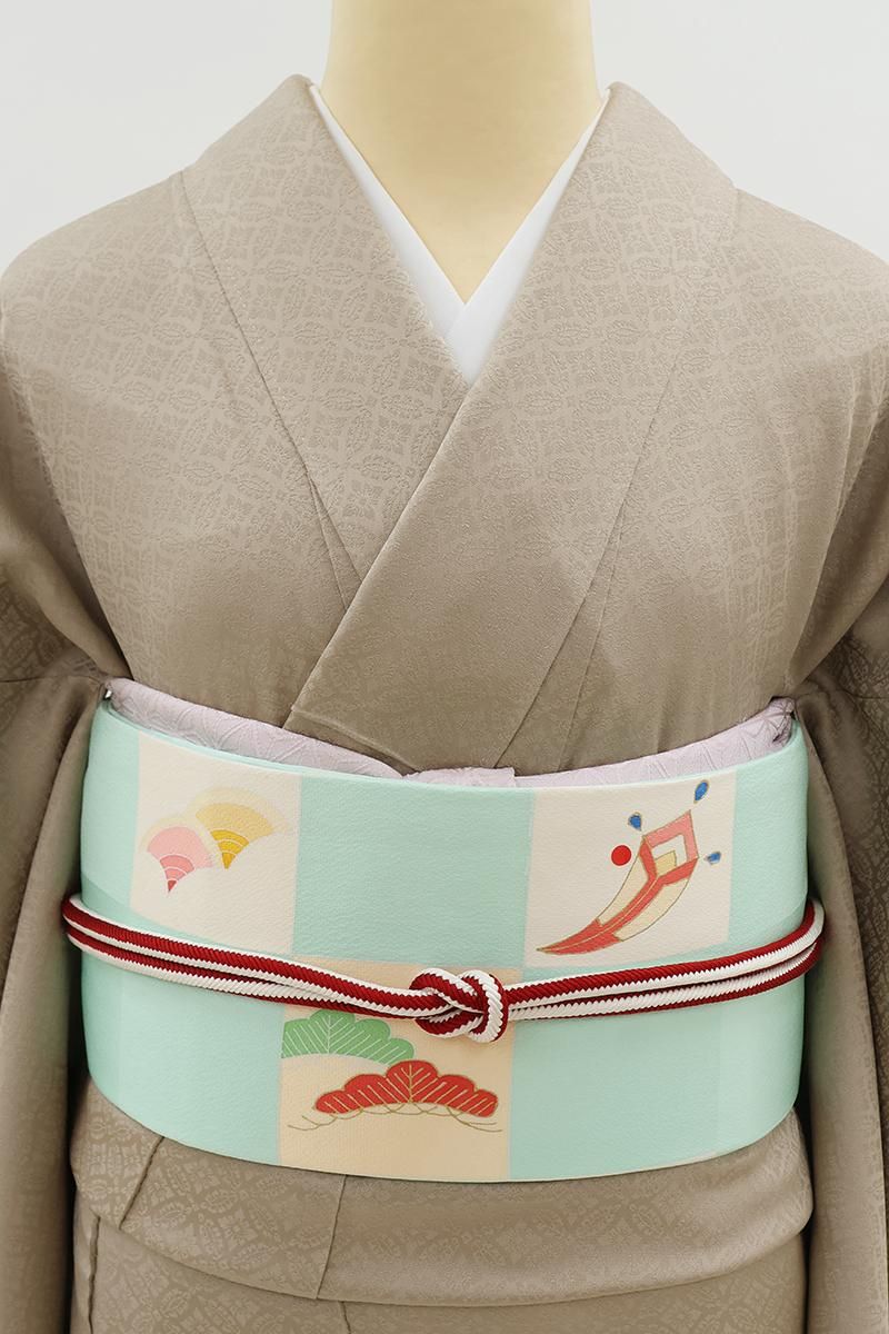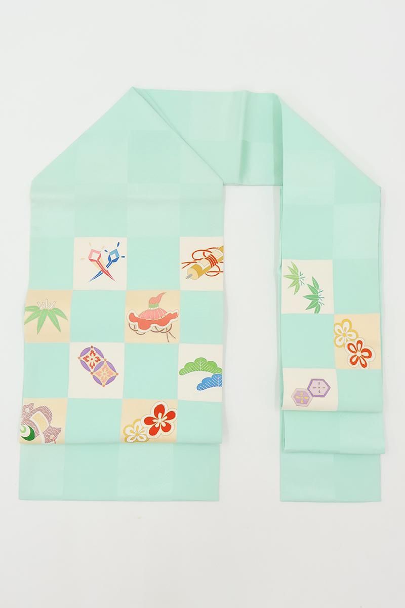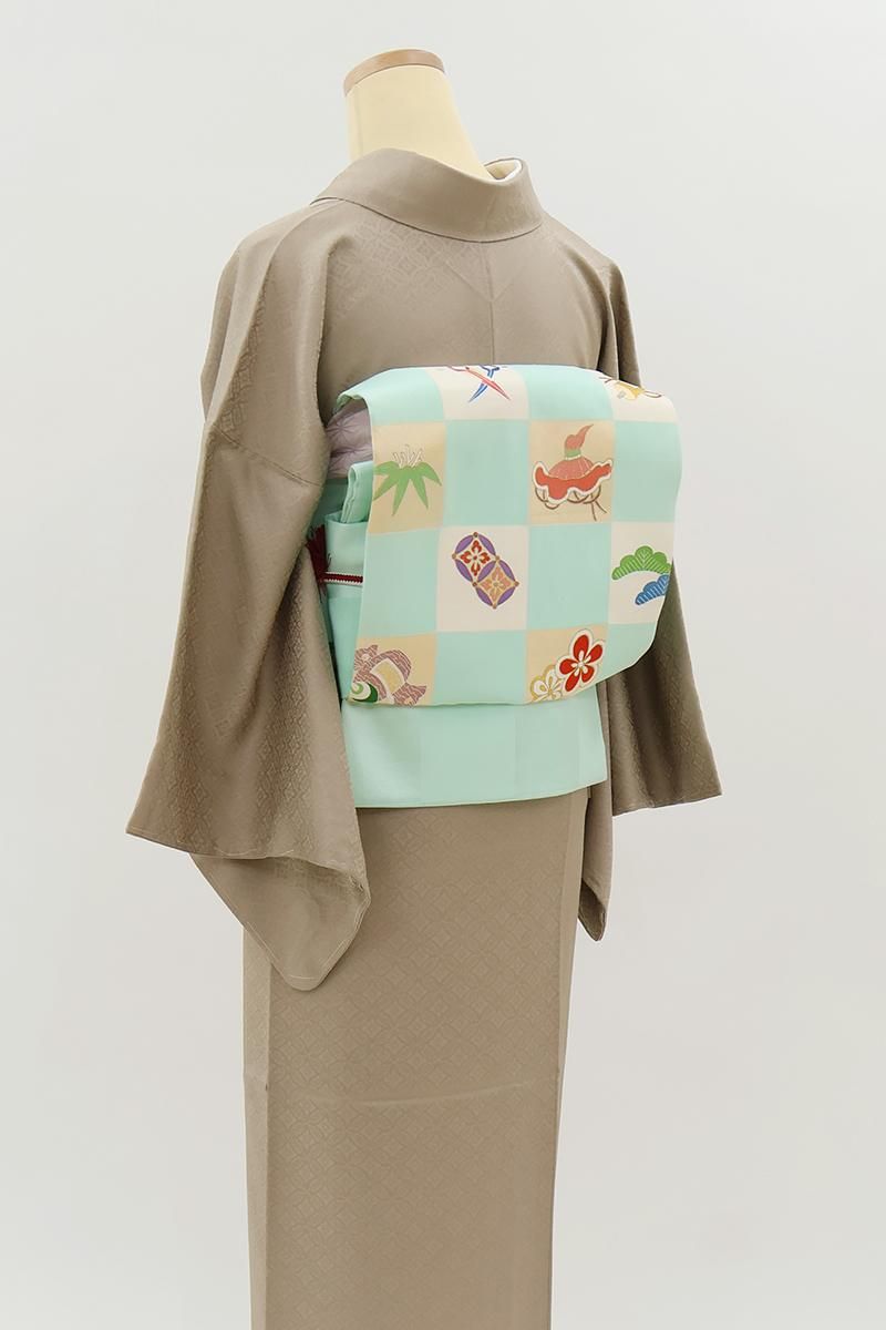 少し明度を上げた水浅葱色が近いでしょうか、おおらかな市松の浮かぶミントグリーン系の地に宝尽くしや松竹梅の意匠を配した名古屋帯です。光沢のあるさらりとした地風に、明るい彩りで表された古典柄が朗らかな表情のお品、金彩の縁取りも華を添えて、宝尽くしならではの晴れやかさを感じさせますね。お正月や雛祭りなど、ちょっとしたお祝いの会などでもさりげなく祝意を表現できる宝尽くしの帯は、一本お持ち頂くとなにかと重宝です。ぜひこの機会にいかがでしょうか。