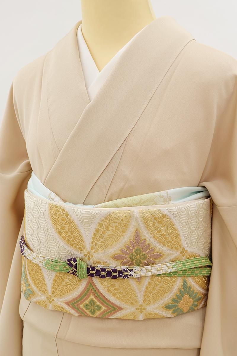 象牙色が近いでしょうか、亀甲の浮かぶわずかに灰みと黄みを含んだ白系の地に七宝繋ぎ文を配した袋帯です。こちらは金糸をたっぷりと用いて立体的に表現された古典文様が格調高い景色を創るお品、優美な彩りの甘撚りの絹糸の光沢と調和し、大人の女性らしいエレガントさを見せていますね。紋付の色無地から訪問着などに合わせて存在感ある装いをお楽しみくださいませ。