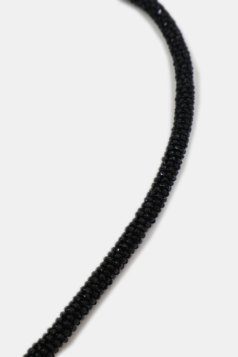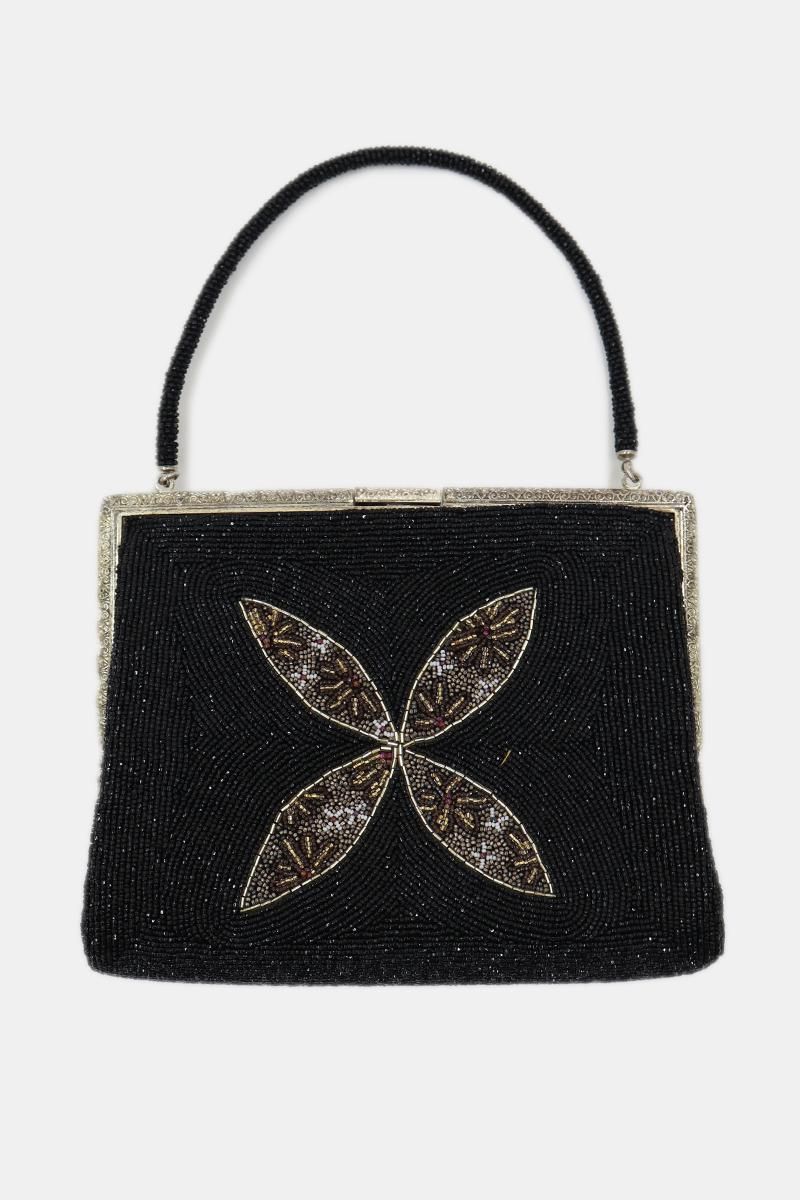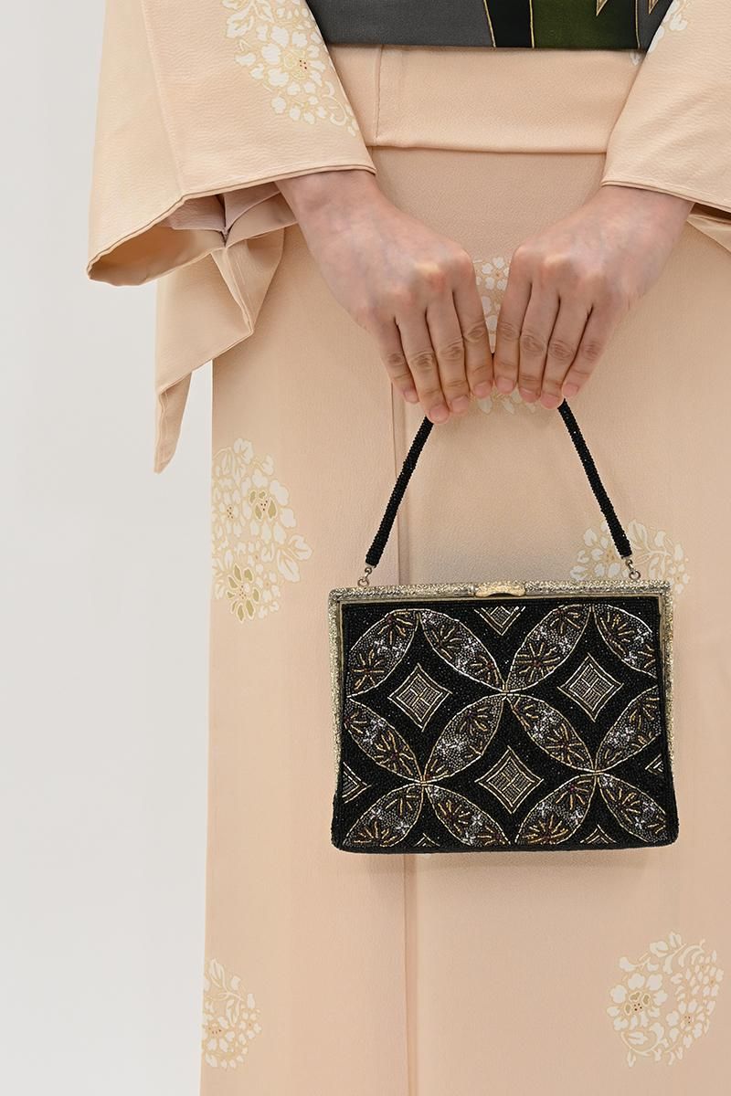 光沢感ある黒いビーズの背景に、控えめなお色で七宝文を表現したビーズバッグです。