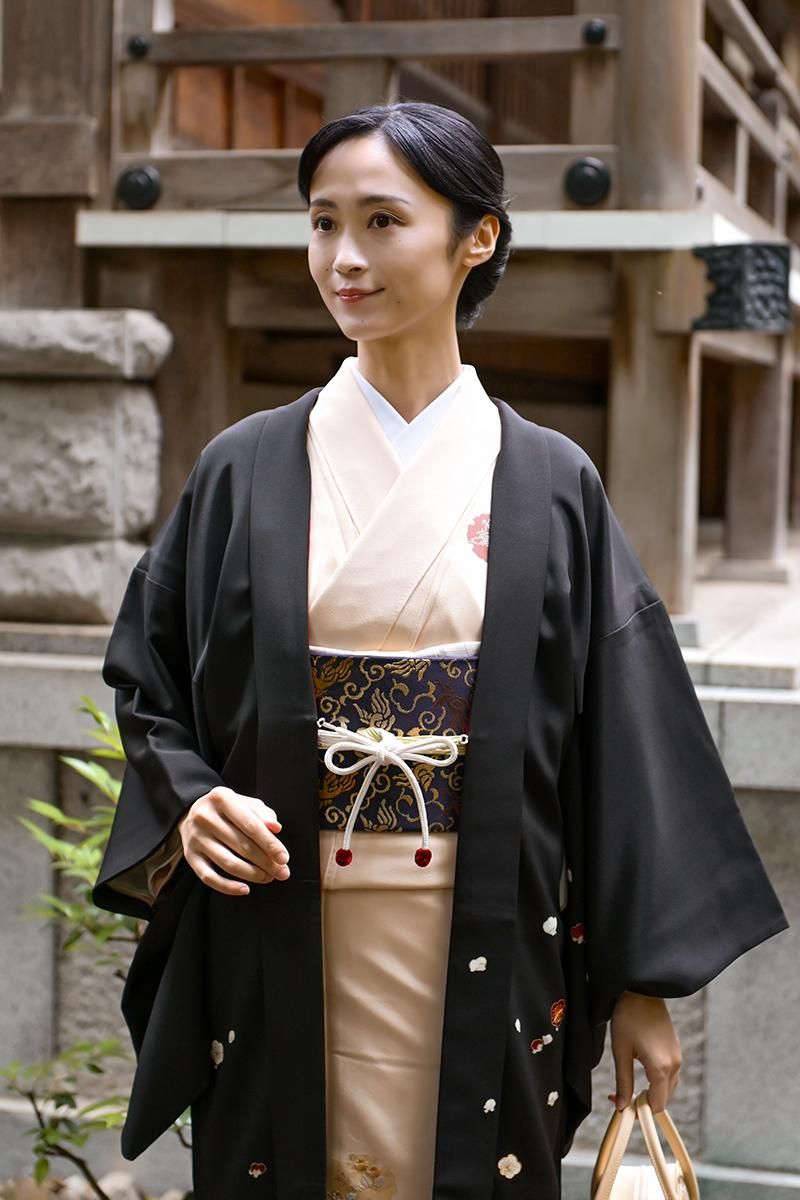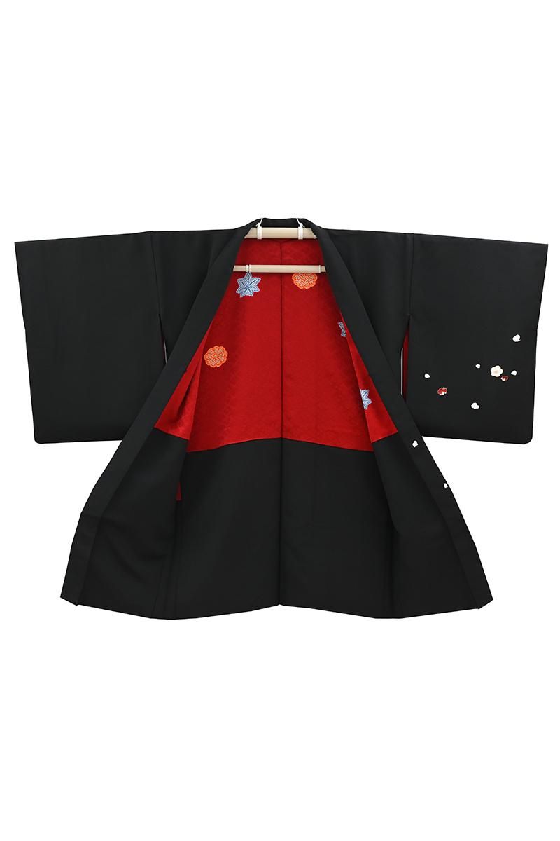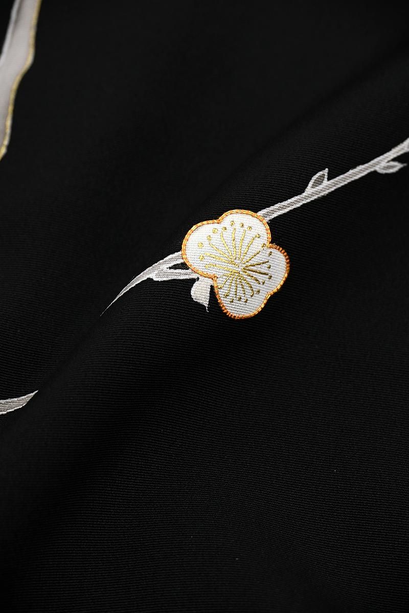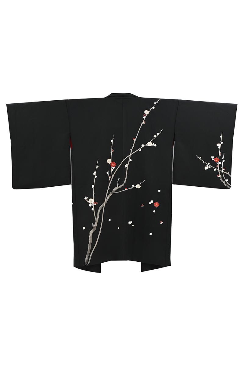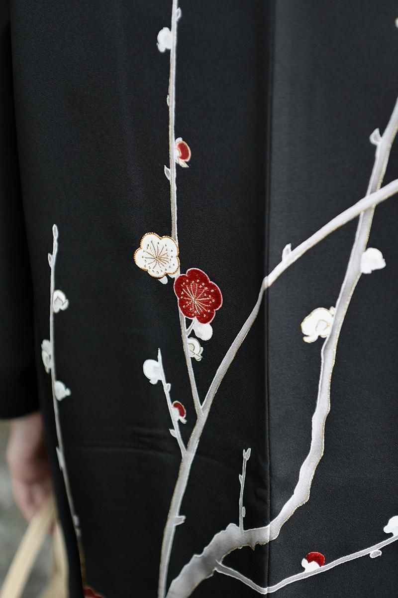 深々とした黒色を背景に凛と咲く紅白の梅を浮かべた、贅沢な絵羽の羽織です。真冬の冷たく澄んだ空気を裂いてすっと枝を伸ばす姿を映し出したその景色は、まさに息を呑むほどの清々しさ。仄かに白を纏った幹枝は未だ残る雪の気配を感じさせ、見事な刺繍を添えてふっくらと表現された紅白の花々の香り立つような美しさをより際立たせています。まだ遠いながらも春への一歩を確かに感じさせてくれる、風情あふれる逸品ですね。こちらは京都の名店として知られる、に志田さんの作。丹念な繍い、洗練された色構成はもとより、紅梅の赤に繋いだ羽裏に至るまで、心を尽くした丁寧な仕事が創り出す着物ならではの重みに、手に取り近く眺めるほどに深い感動を覚えます。格高の小紋や江戸小紋、色無地などに合わせて、はんなりと気品あふれる装いをお楽しみくださいませ。